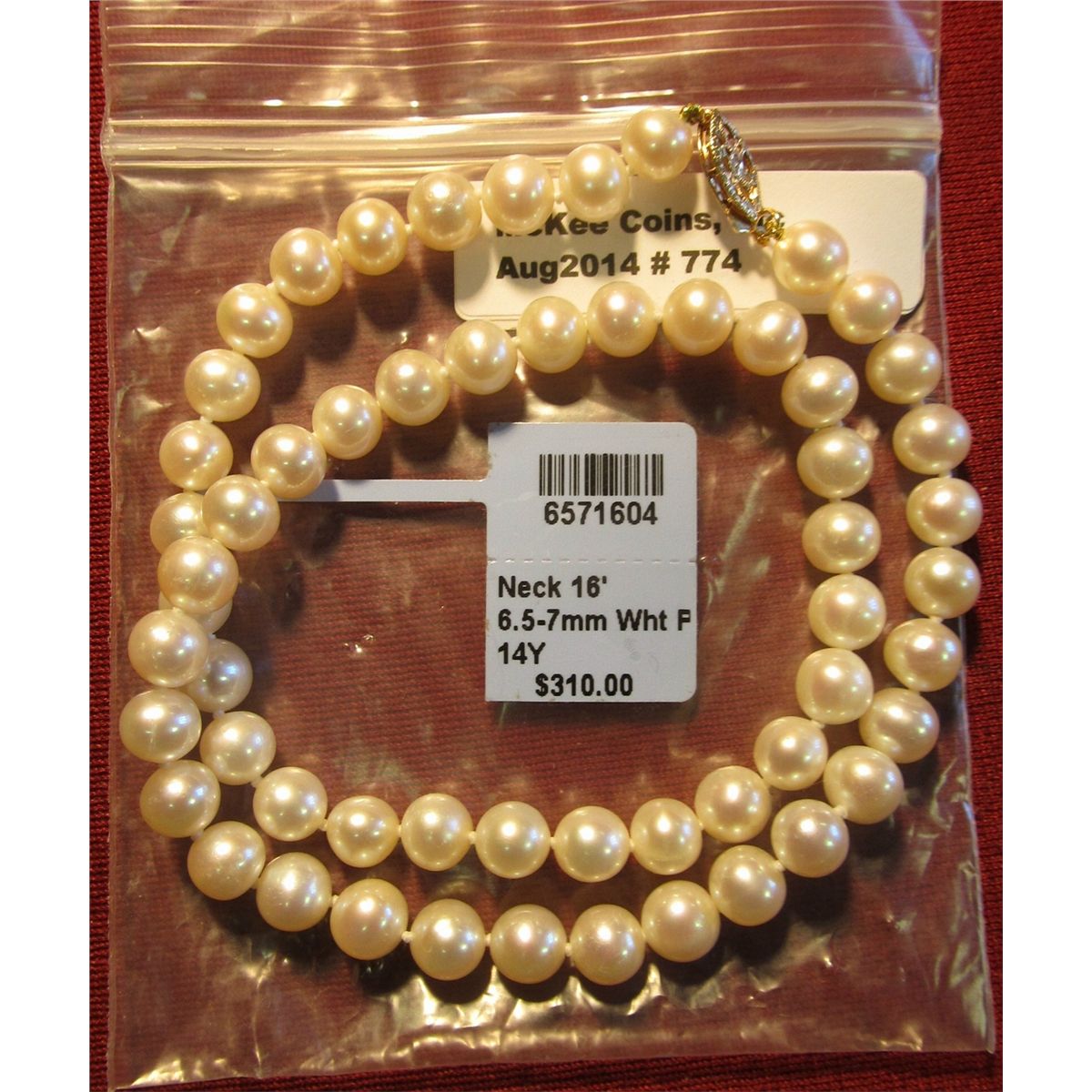 774. 16" Pearl Necklace with 14K Yellow Gold Clasp and 6.5-7 mm White Pearls. New in package. Complete with original hang tag stating it originally sold for $310.00. .
