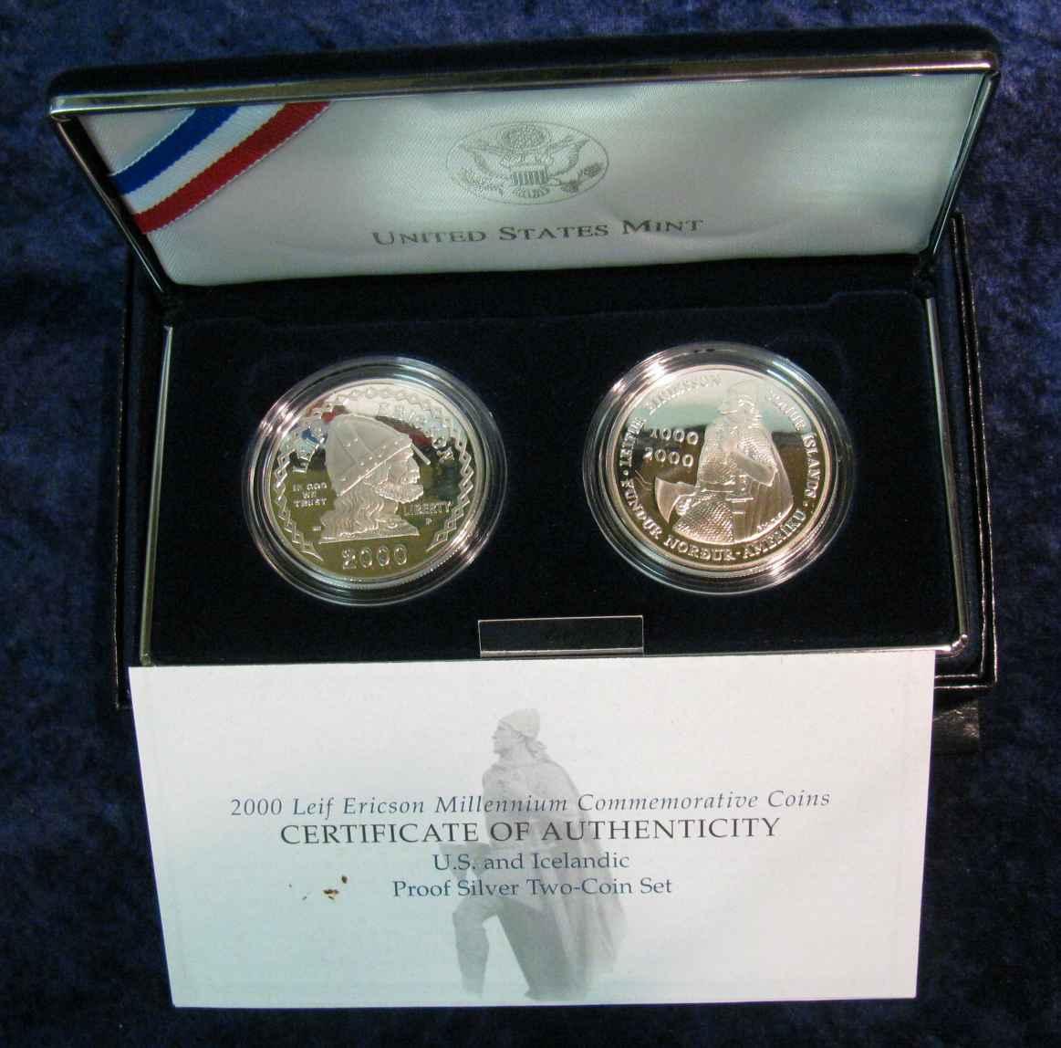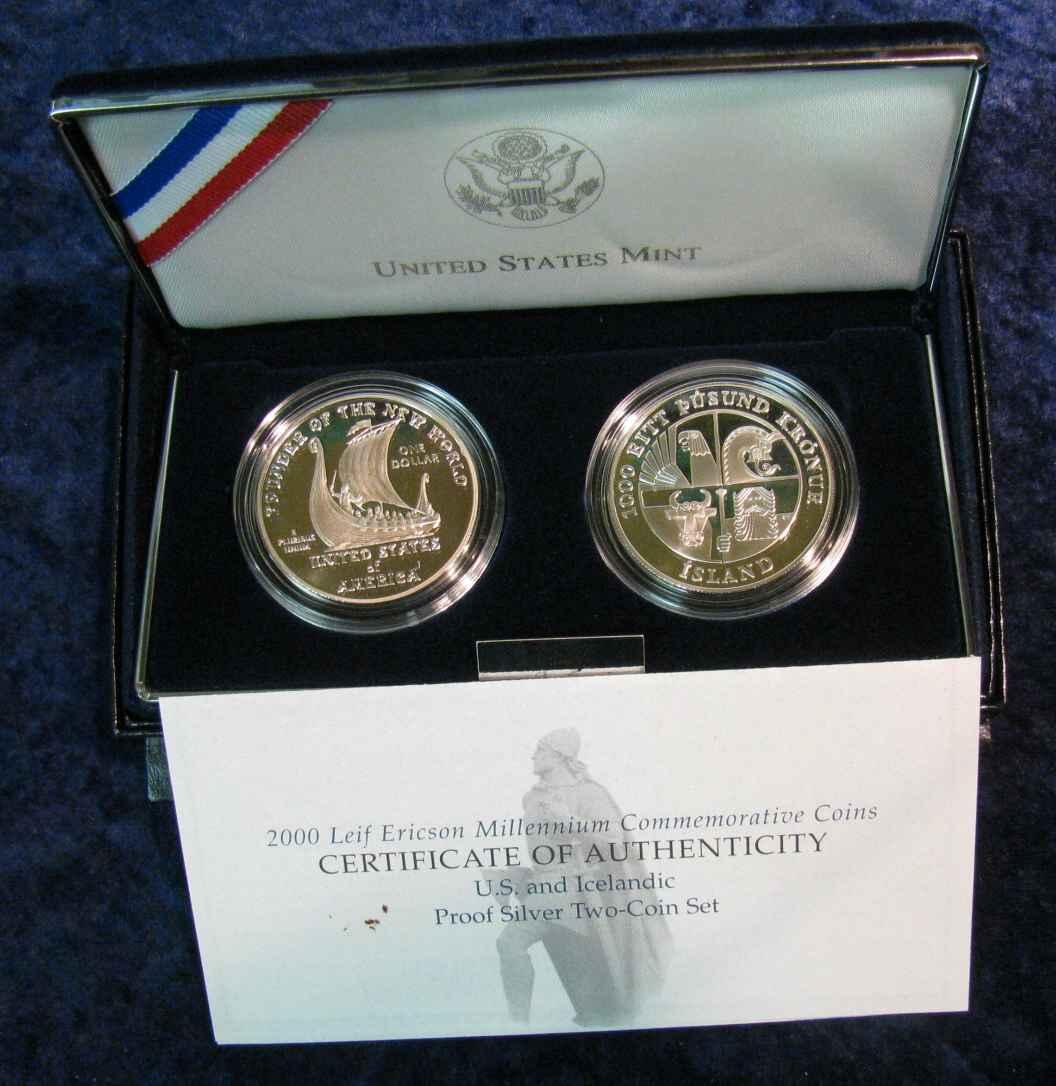 775. 2000 P Leif Erickson Millennium Commemorative Coins U.S. and Icelandic Proof Silver Two-Coin Set. Both coins contain 26.73 grams of 90% Silver. Original as issued with Certificate of Authenticity.