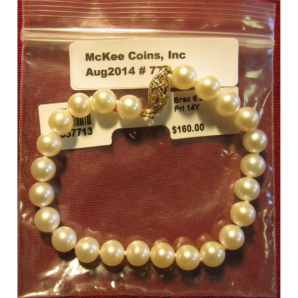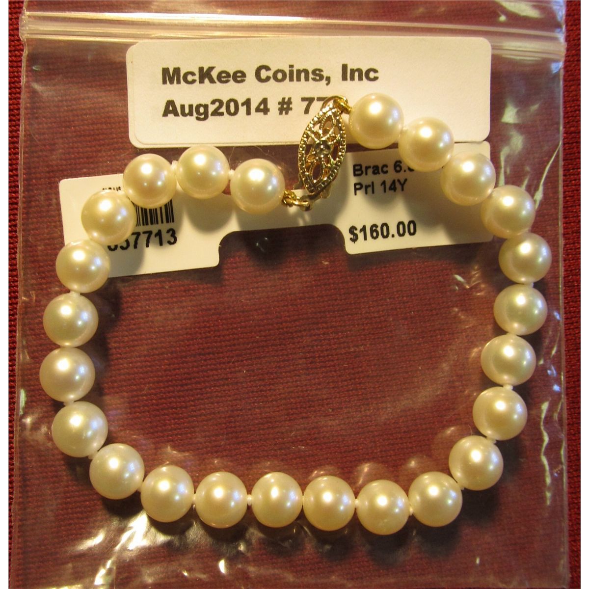 775. Pearl Bracelet with 14K Yellow Gold Clasp and 6.5-7 mm White Pearls. New in package with original hang tag priced at $160.00.