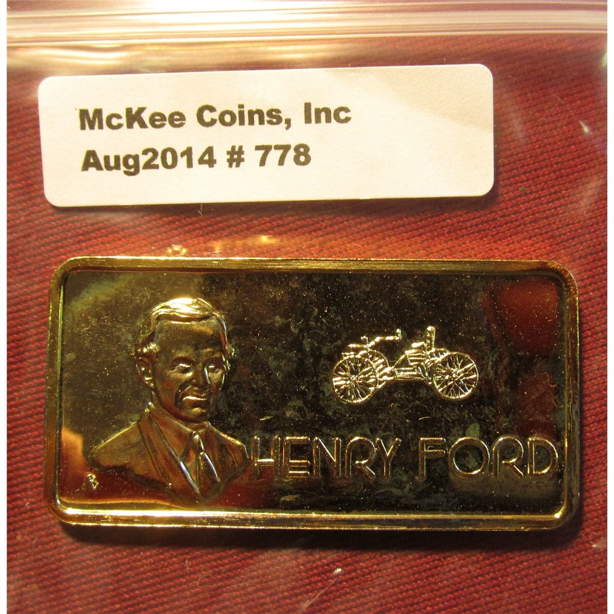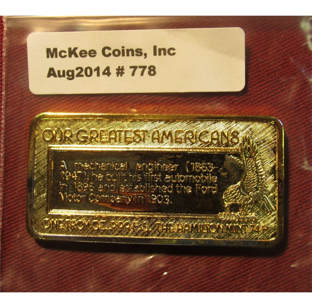 778. "Henry Ford" One Troy Ounce .999 Fine Silver Ingot with 24Kt Gold overlay. The Hamilton Mint.