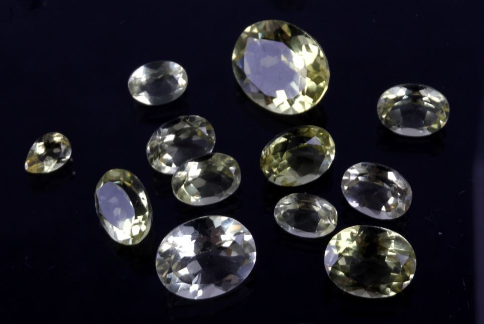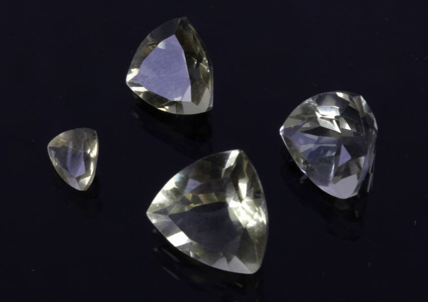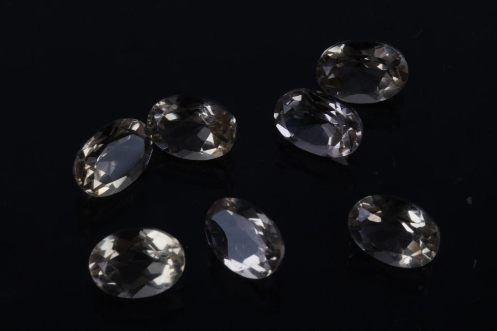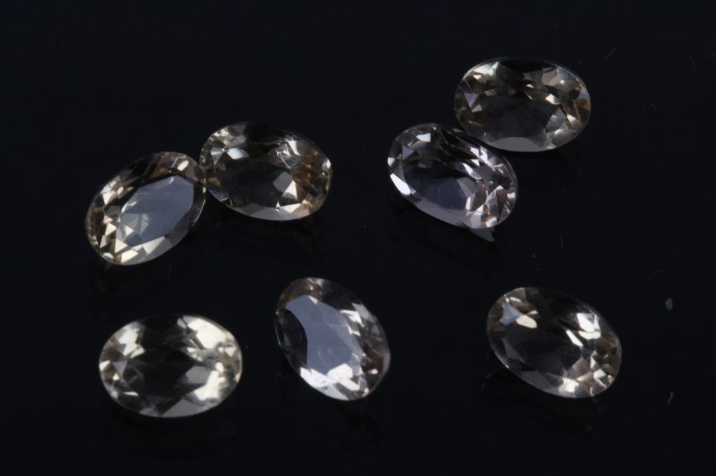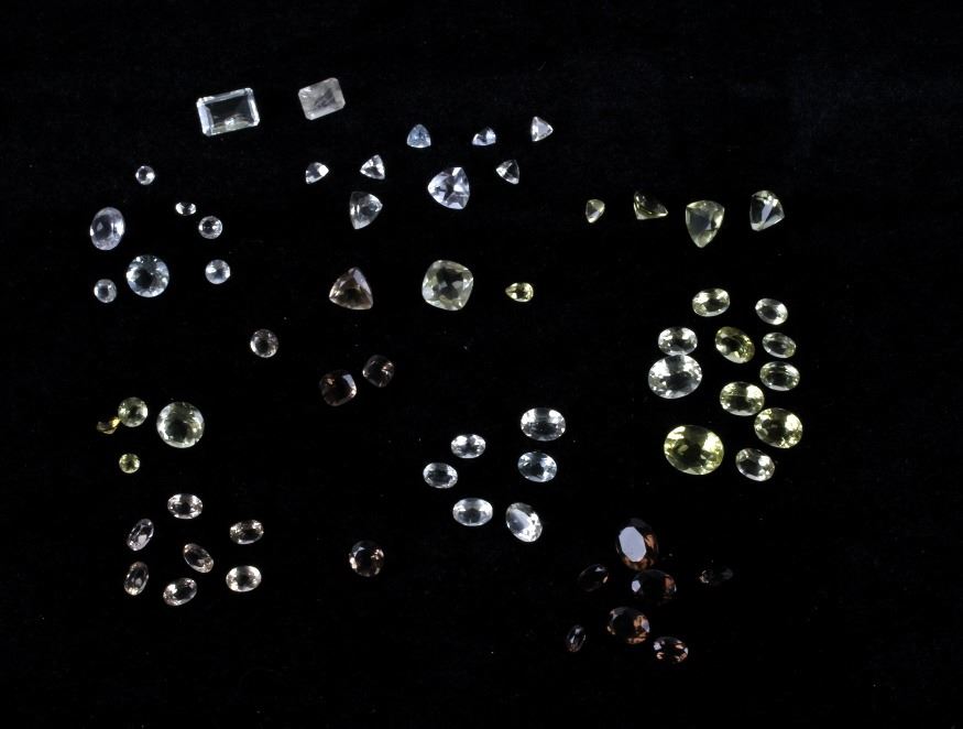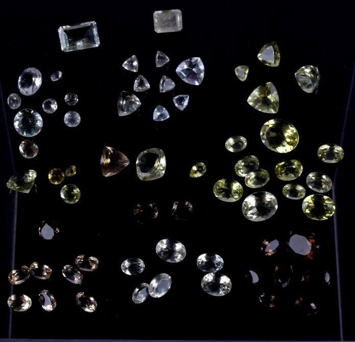 For you consideration is a collection of 78.86 carats of loose and faceted quartz gemstones. In this collection are 63 total gemstones varying in color, size, and cut. The gemstones are expertly cut into oval, round, trillion, cushion, pear, and emerald style cuts. This wonderful collection features colors of latte, lemon, smokey, and clear. All gemstones are in good condition, apart from one of the larger emerald cut gemstones showing some blemishes. The approximate measurements of these gemstones are for the oval: 9.09x11.06x6.01; 6.98x8.87x4.05; 6.98x9.94x4.13; 4.12x5.69x3.04; 4.92x6.98x3.29; 4.98x6.98x3.29; 4.98x6.81x3.81; 4.91x6.94x3.29, 7x9x4.28, 7x9x4.67; 5x7x3.69; 5x7x3.63; 6x8x2.65; 6x8x3.27; 10x12x5.8; 9x11x5.67; 8x10x4.93; 7x9x4.98; 7x9x5.52; 6x8x4.22; 6x8x3.87; 6x8x4.34; 4x8x4.55; 5x7x3.50; 5x7x3.38; 5x7x3.90; 5x7x3.18; 5x7x3.47; 5x7x3.77; 5x7x4.15; 5x7x3.71; 5x7x3.57; the pear cut stone measures approximately 5.78x4.00x2.62; he cushion cut stones measure approximately, 7.06x7.05x4.91; 6.10x6.10x4.05; 10x10x5.42; the round cut stones measure approximately 7.28x4.76; 6x4.24; 9x6.23; 6x4.15; 4x2.54; 5x2.95; 9x5.83; 9x5.19; 5x3.34; 5x3.89; 4.75x2.60; 4x2.85; 4x2.62; the trillion cut stones measure approximately 9x9x5.86; 5x5x3.04; 10x10x5.95; 9x9x6.85; 8x8x5.28; 9x9x5.39; 8x8x5.25; 5x5x3.26; 5x5x3.06; 5x5x2.62; 5x5x2.85; 5x5x3.00; 5x5x3.08; and the trillions cuts measure approximately 8.99x7.00x5.19; 12x8x5.08 this gem shows some blemishes.