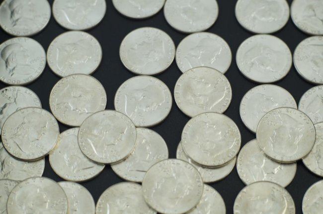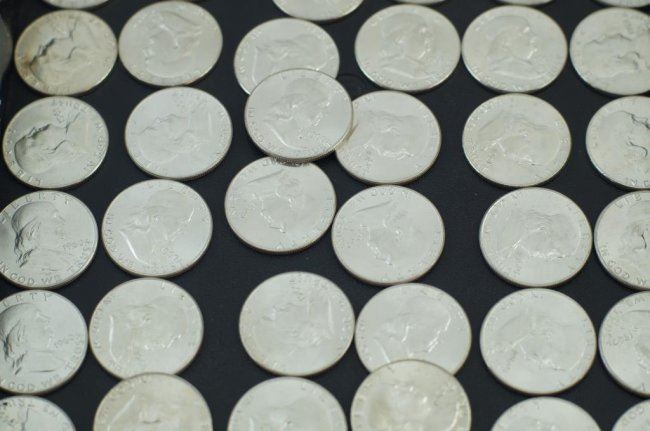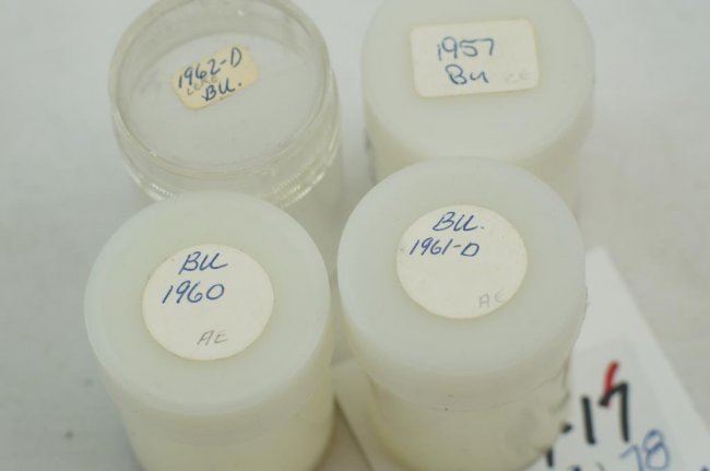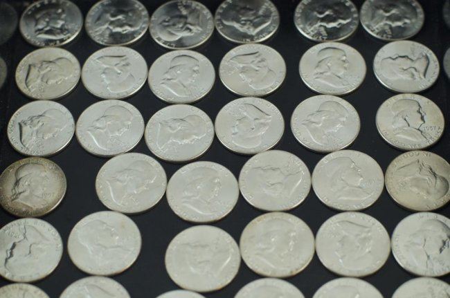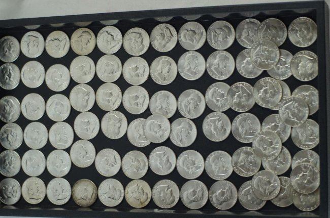 1957 BU Franklin half dollars - 19, 1960 BU Franklin half dollars - 19, 1961 Franklin BU half dollars- 20 and 1962 BU Franklin half dollars - 20. Approx 78