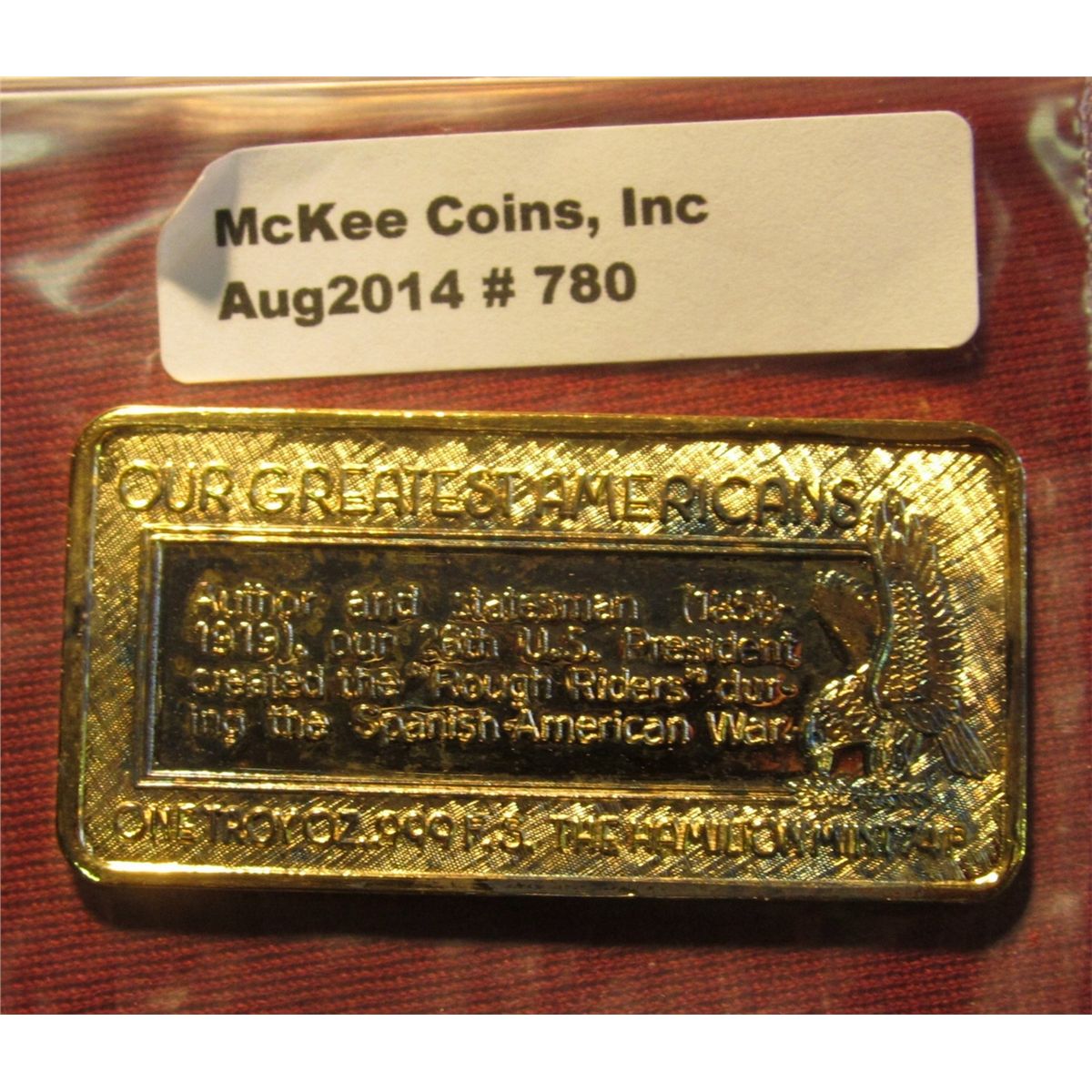 780. "Theodore Roosevelt" One Troy Ounce .999 Fine Silver Ingot with 24Kt Gold overlay. The Hamilton Mint.