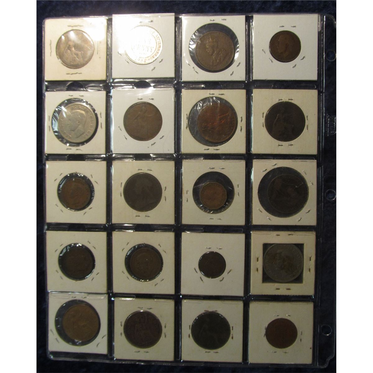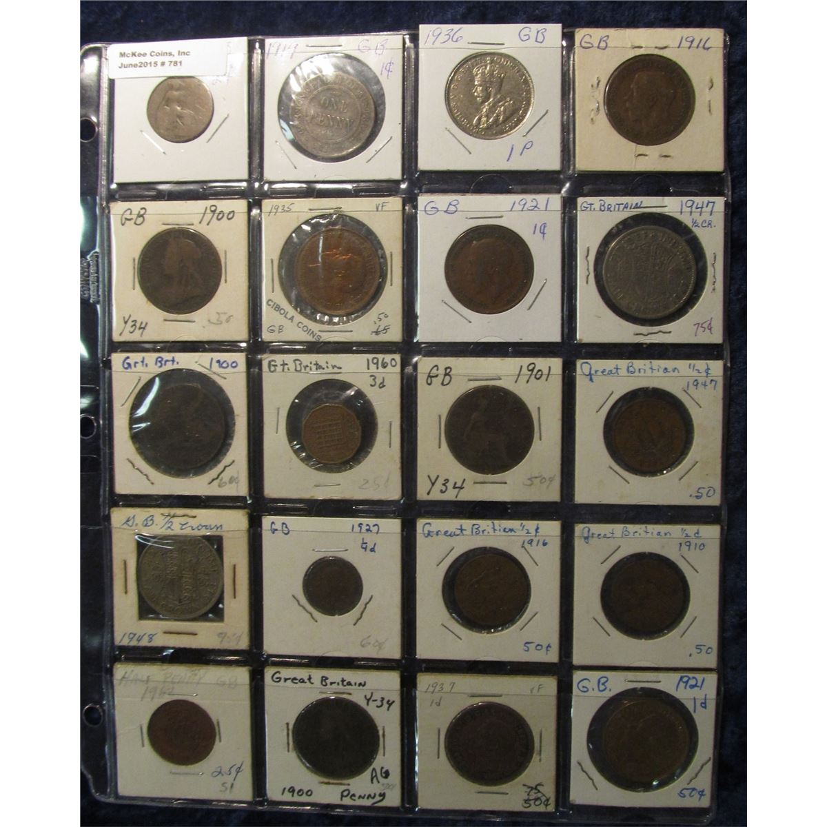781. (20) Different Great Britain Coins in a Coin Dealer's Plastic Stock page. Includes a Great Britain 1947 & 48 Silver Half Crowns.