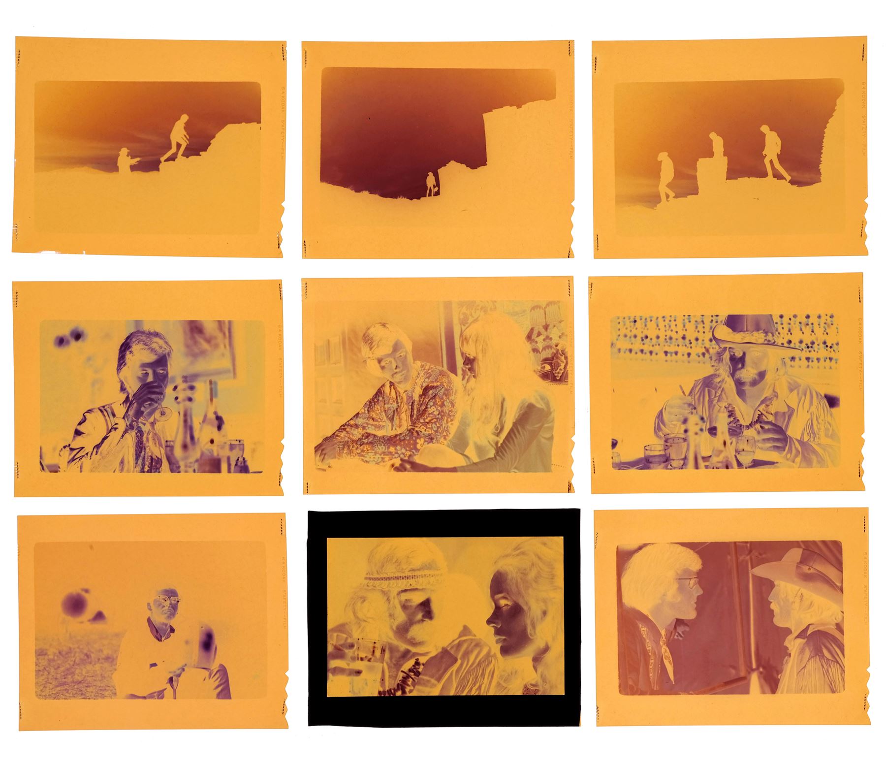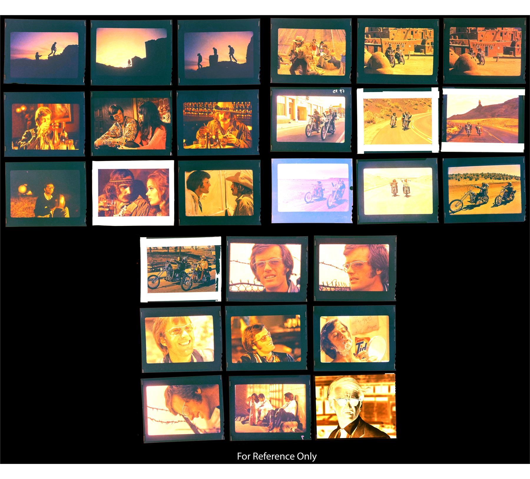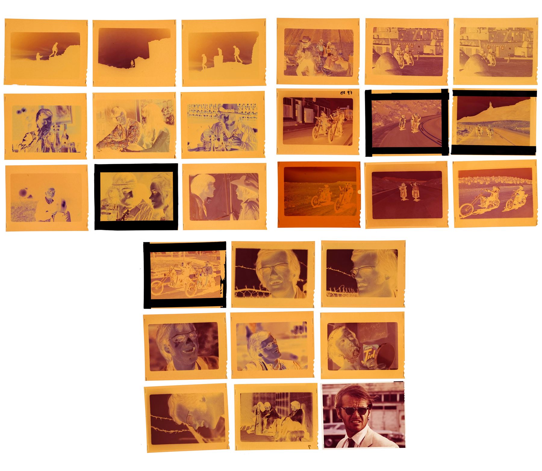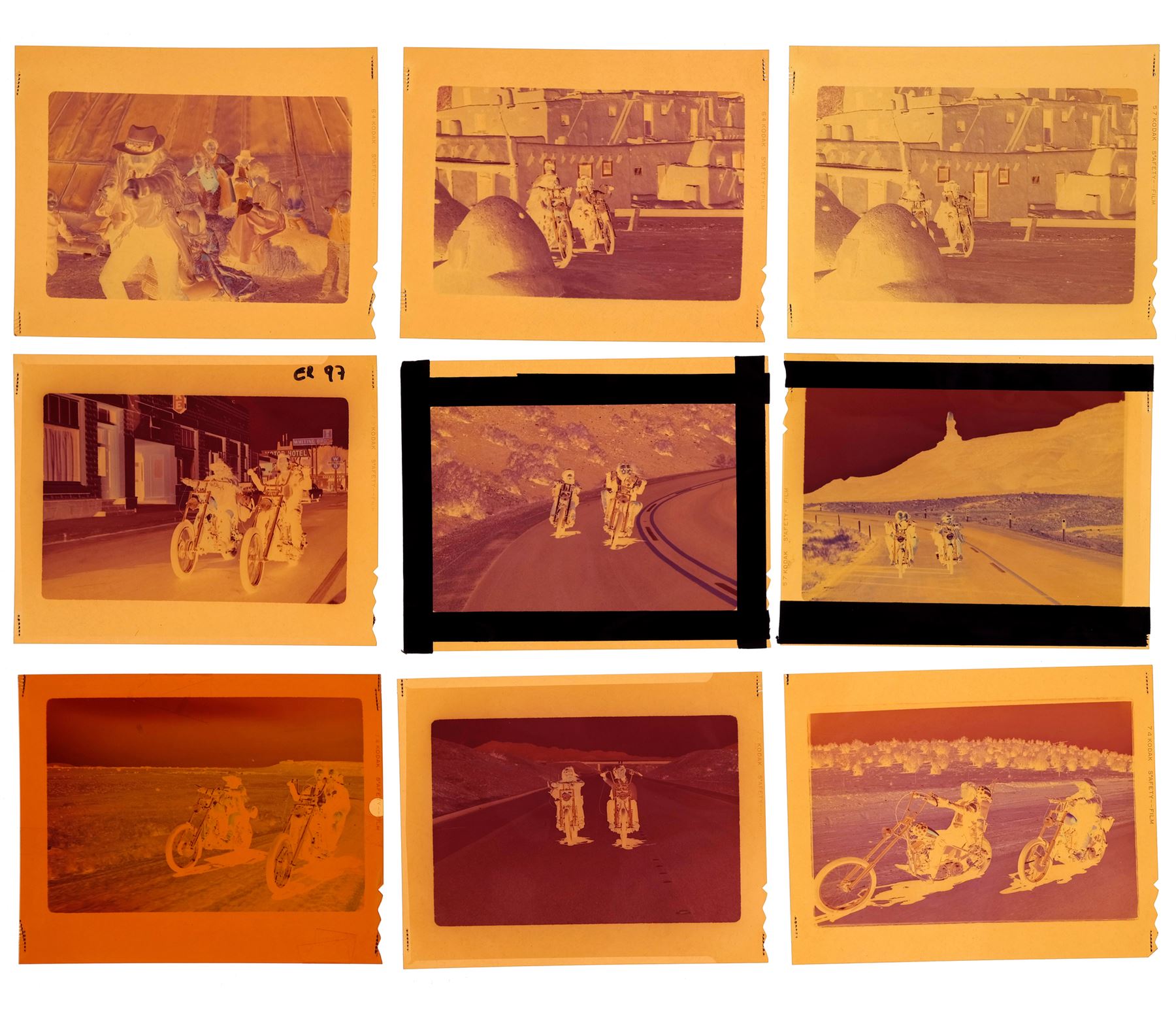 These large format 64 Kodak Safety Film color photo negatives feature images of Peter Fonda and Jack Nicholson with other cast and crew members in various landscapes from the film. Each photo negative is placed within a clear vellum sleeve for protection. Dimensions: (each) 4" x 5" (10.25 cm x 12.75 cm)