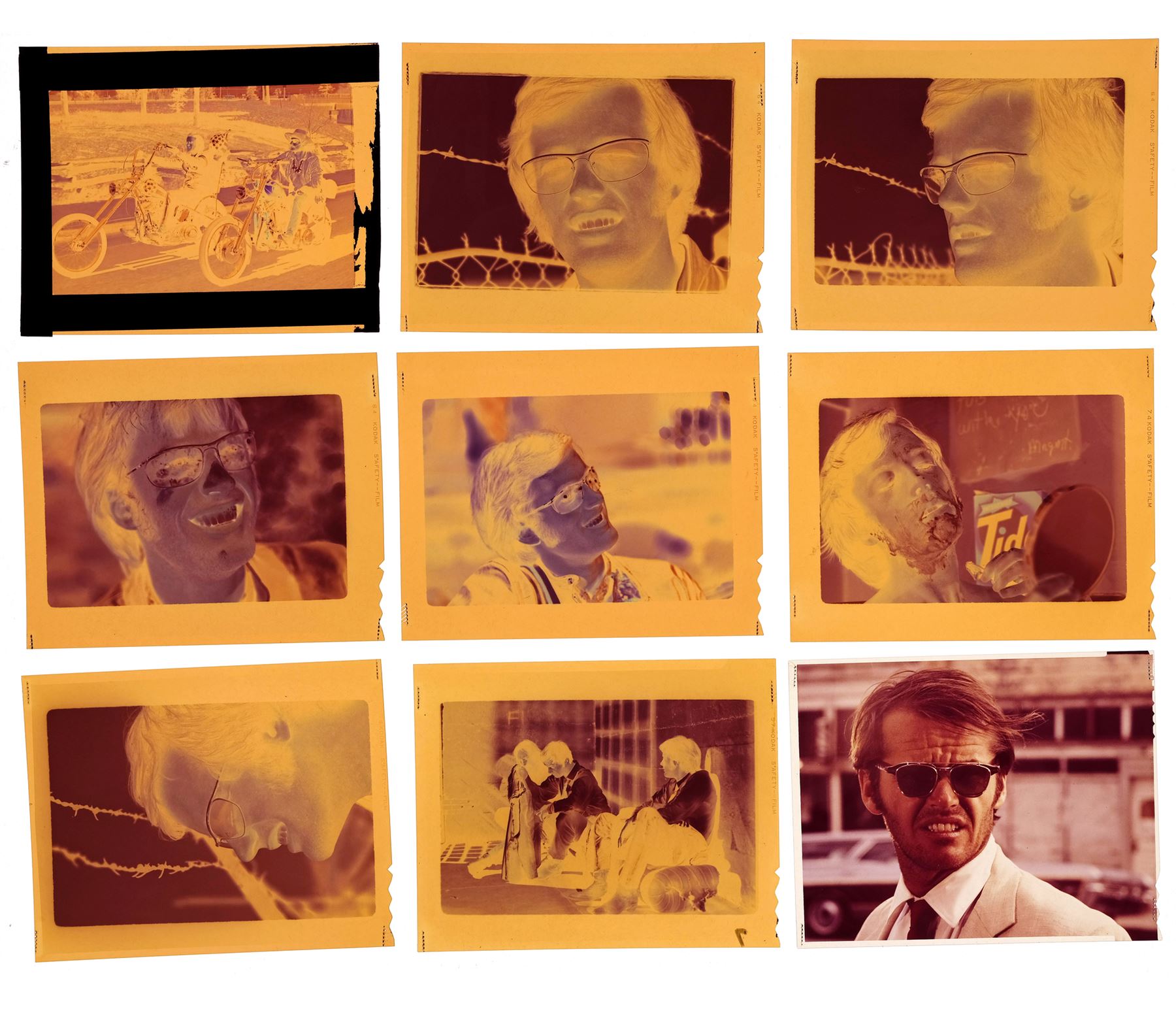 EASY RIDER (1969) - Set of 27 Production Photograph Negatives - A set of 27 production photograph negatives from Dennis Hopper's Easy Rider. Motorcyclists Wyatt (Peter Fonda) and Billy (Dennis Hopper) traveled across the country from Los Angeles to New Orleans for Mardi Gras where they met numerous individuals, including lawyer George Hanson (Jack Nicholson), who they later befriended.