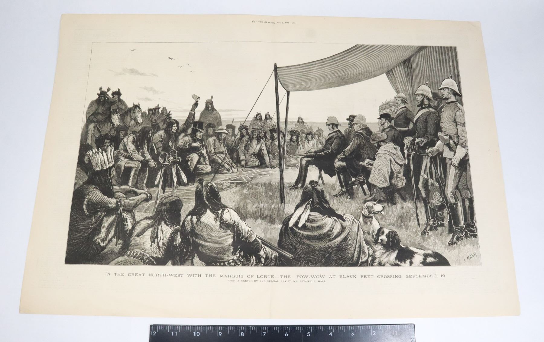 FROM THE GRAPHIC BRITISH NEWSPAPER SIZE IS 23.5X16 INCHES ENTITLED IN THE GREAT NORTH-WEST WITH THE MARQUIS OF LORNE - THE POW-WOW AT BLACK FEET CROSSING SEPTEMBER 10TH SYDNEY P HALL SKETCH NORTH WEST MOUNTED POLICE NWMP RCMP CANADIAN ABORIGINAL PRINT DATED NOVEMBER 5TH 1881