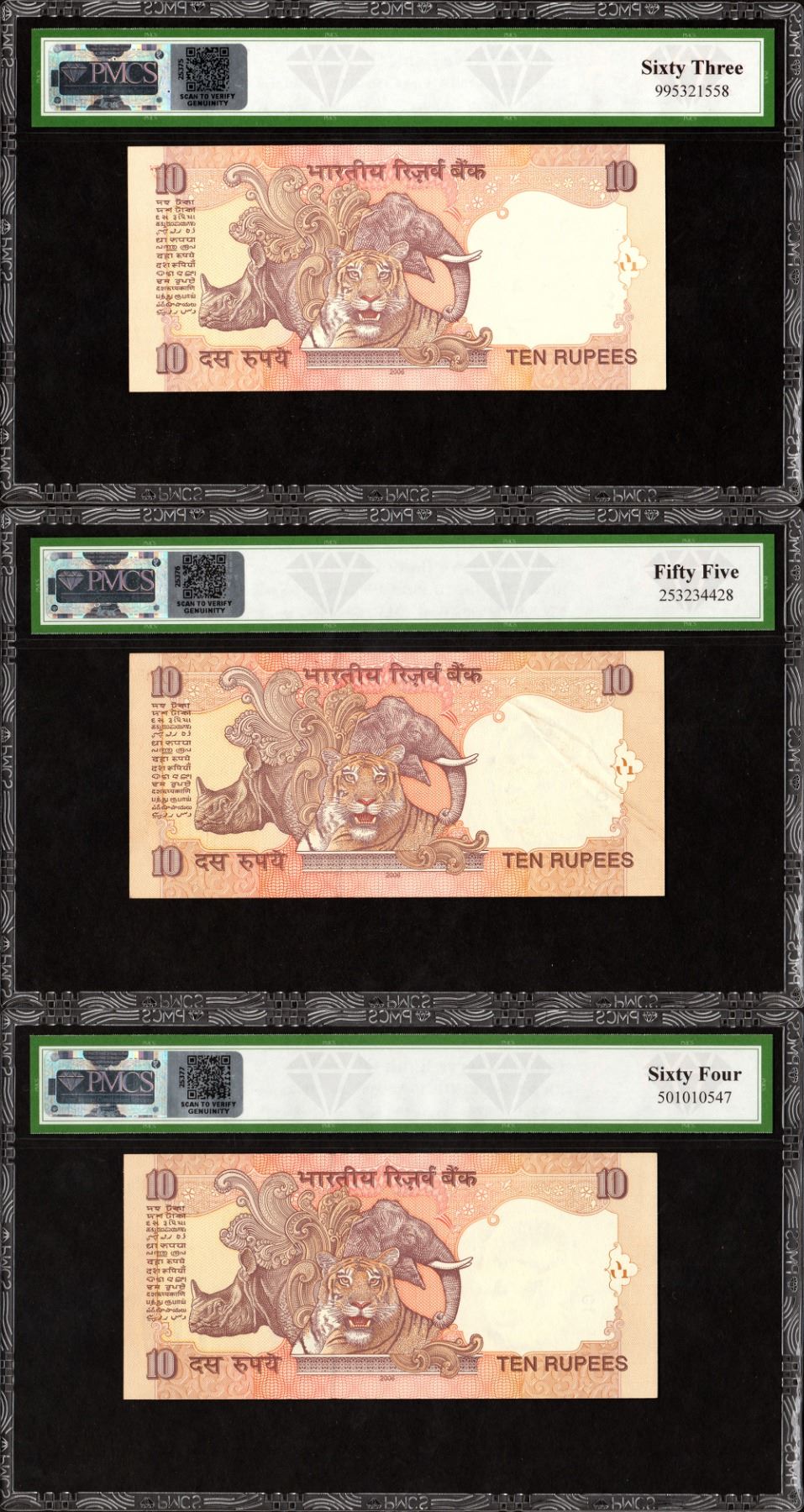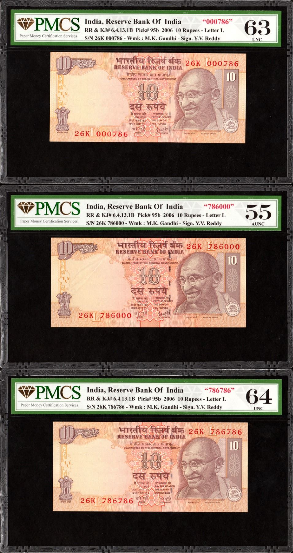 Republic India, 2006, 10 Rupees (3), 000786, 786000 & 786786, Fancy Number, Signed by Y.V. Reddy, L Inset, K Prefix, S. No. 26K 000786, 786000 & 786786, graded by PMCS as 63 UNC, 55 AUNC & 64 UNC, Very Rare.