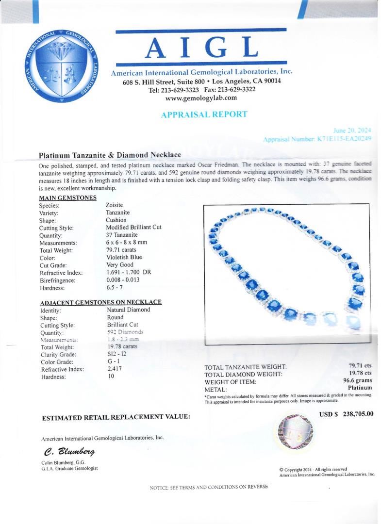One polished. stamped. and tested platinum necklace marked Oscar Friedman. The necklace is mounted with: 37 genuine faceted tanzanite weighing approximately 79.71 carats, and 392 genuine round diamonds weighing approximately 19.78 carats. The necklace measures 18 inches in length and is finished with a tension lock clasp and folding safety clasp. This item weighs 96.6 grams, condition is new, excellent workmanship. #MAIN GEMSTONES# Species: Zoisite; Variety: Tanzanite; Shape: Cushion; Cutting Style: Modified Brilliant Cut; Quantity: 37 Tanzanite; Measurements: 6 x 6 - 8 x 8mm; Total Weight: 79.71 carats; Color: Violetish Blue; Cut Grade: Very Good; Refractive Index: 1.691 - 1.700 DR; Birefringence: 0.008 - 0.013; Hardness: 6.5 - 7 #ADJACENT GEMSTONES ON NECKLACE# Identity: Natural Diamond; Shape: Round; Cutting Style: Brilliant Cut; Quantity: 592 Diamonds; Measurements: 1.8 - 2.3mm; Total Weight: 19.78 carats; Clarity Grade: SI2-I2; Color Grade: G-I; Refractive Index: 2.417; Hardness: 10; TOTAL TANZANITE WEIGHT: 79.71 cts; TOTAL DIAMOND WEIGHT: 19.78 cts; WEIGHT OF ITEM: 96.6 grams; METAL: Platinum #Size: 18