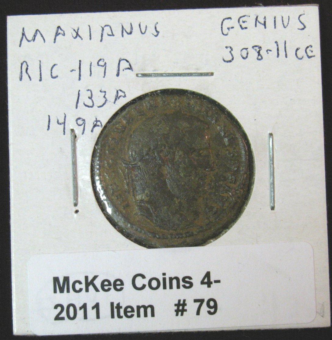 79. Maxianus Roman Bronze. Genius reverse. RIC-119A. 133A. 149A. 308-11 CE. Catalog $72.00.