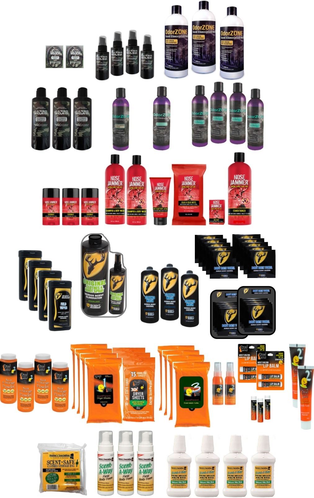 79 Pieces Scent Elimination, 9 x Carbomask, 2-Bar Soap, 4-Deodorant, 3-Shampoo, 8 x OdorZONE, 4-Body Wash 16 oz, 1-Lotion, 1-Conditioner, 3-Body Wash 8 oz, 9 x Nose Jammer, 3-2.25oz. Deodorant, 2-Shampoo, 1-5 oz Face Lotion, 1-All Purpose Wipes, 1-Bar Soap 6oz. , 1-Conditioner 16oz, 20 x Robertson Outdoors, 4-Field Wipes 20 Pack, 1-Scent Shield Combo, 3-Clothes Wash, 10-Bath Towel, 2-Bath Towels 4 Pk, 24 x Dead Down Wind, 4-Powder 4 oz, 7-Dryer Sheets 15ct, 4-Wash Cloths 20ct, 2-Mouth Spray 2oz, 5-Lip Balm, 2-Tooth Paste, 8 x Hunter Specialty, 1-Clothing Bag, 3-No Rinse Foam, 4-Breath Wash