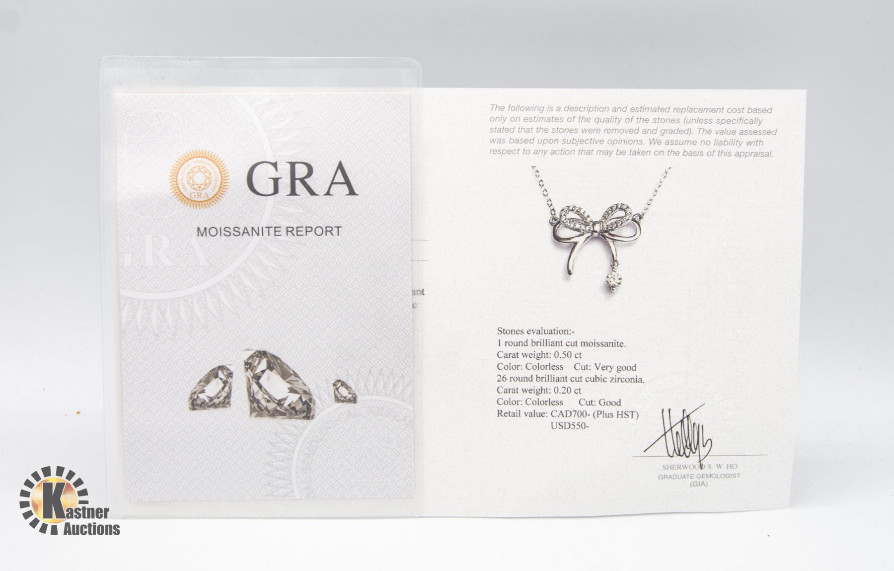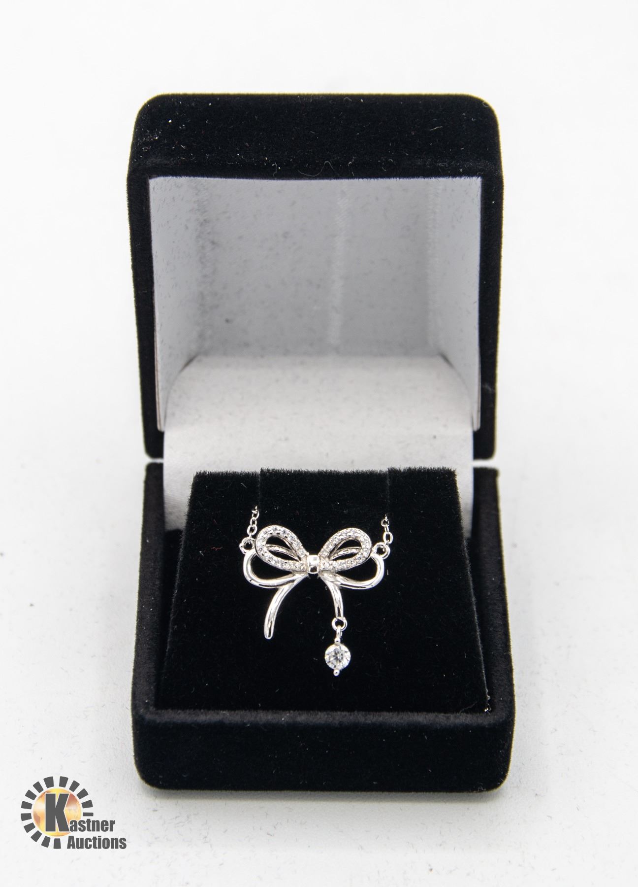 BOW TIE PENDANT WITH 0.50 MOISSANITE DANGLING FROM BOW TIE WITH 26 ROUND CZ SET IN 1 BOW OF THE PENDANT SET IN STERLING SILVER WITH CHAIN RETAIL VALUE $700.00