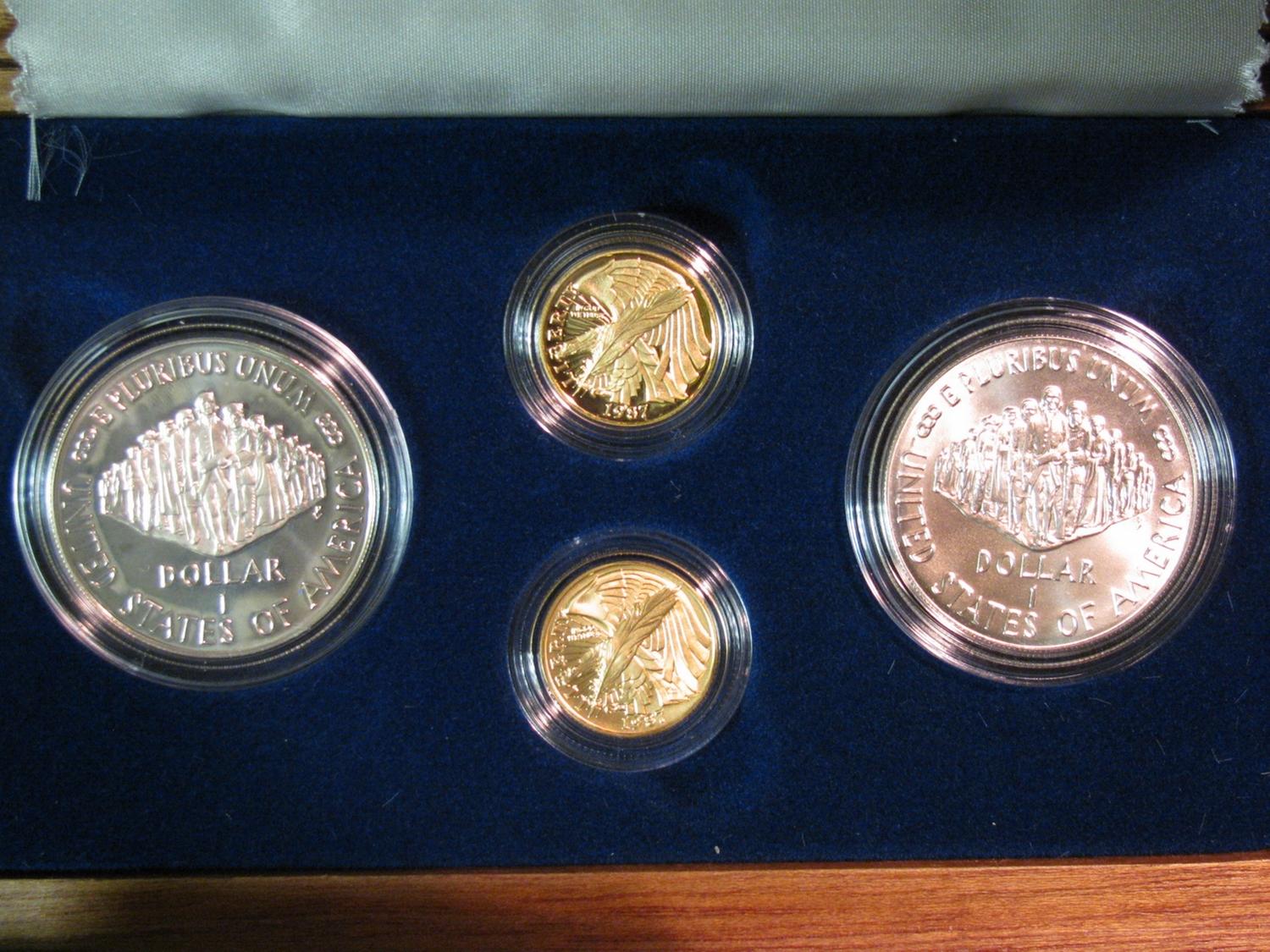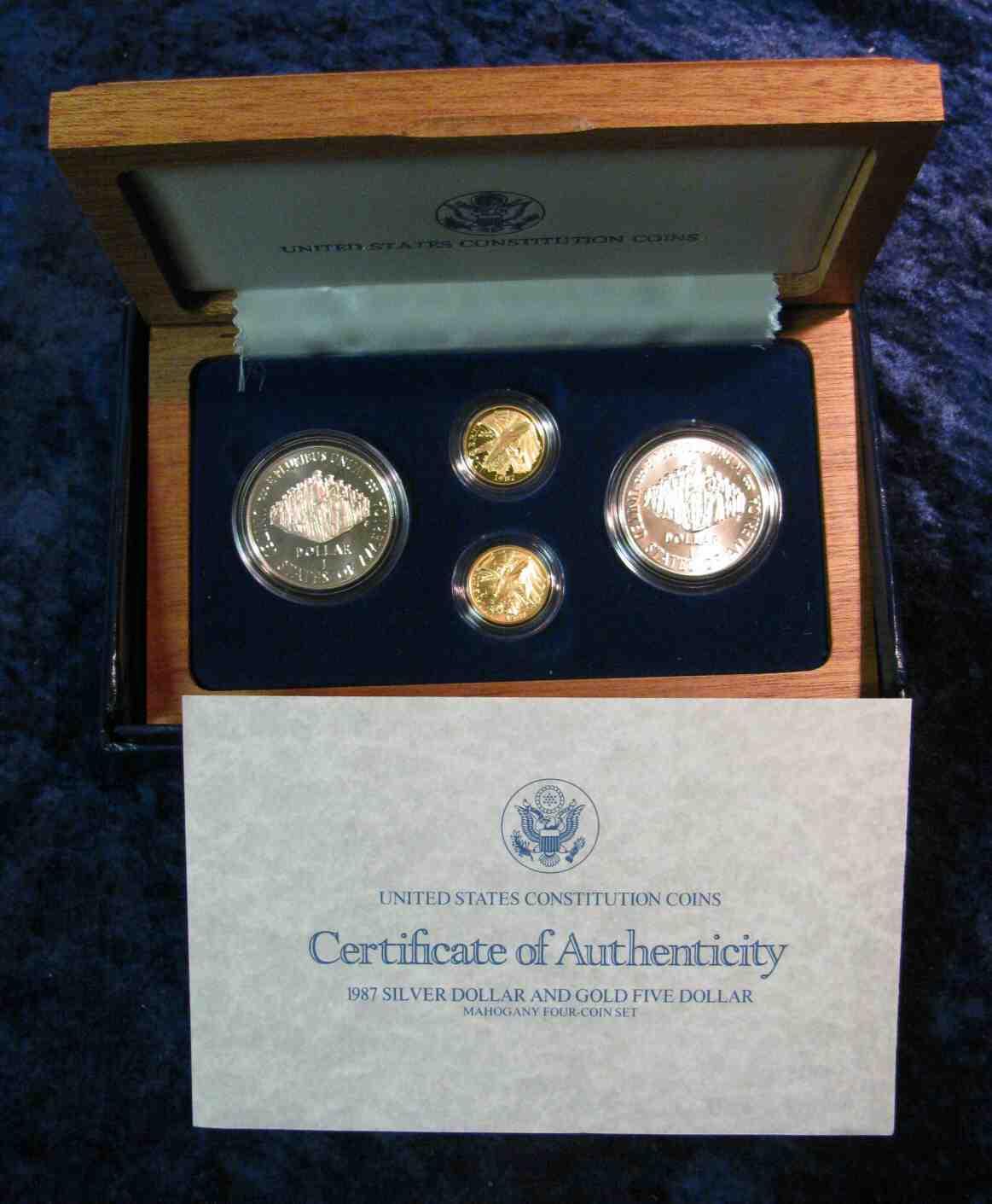 793. 1987 Constitution Silver Dollar and Gold Five Dollar Proof & Unc Mahogany Four-Coin Set. Original as issued.