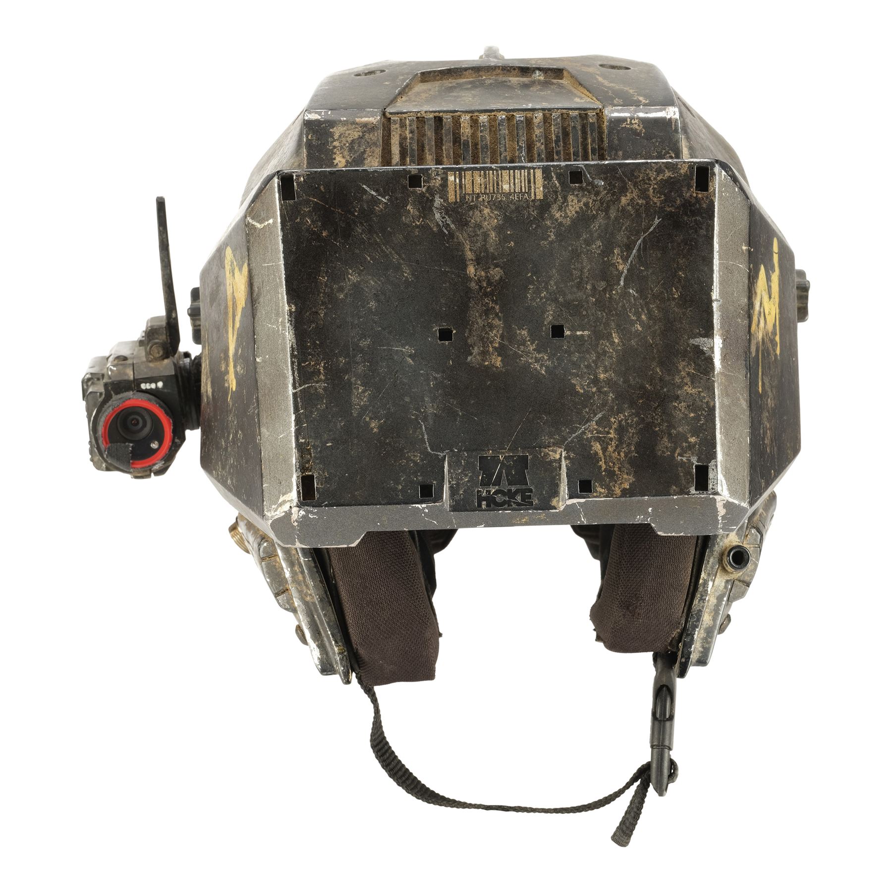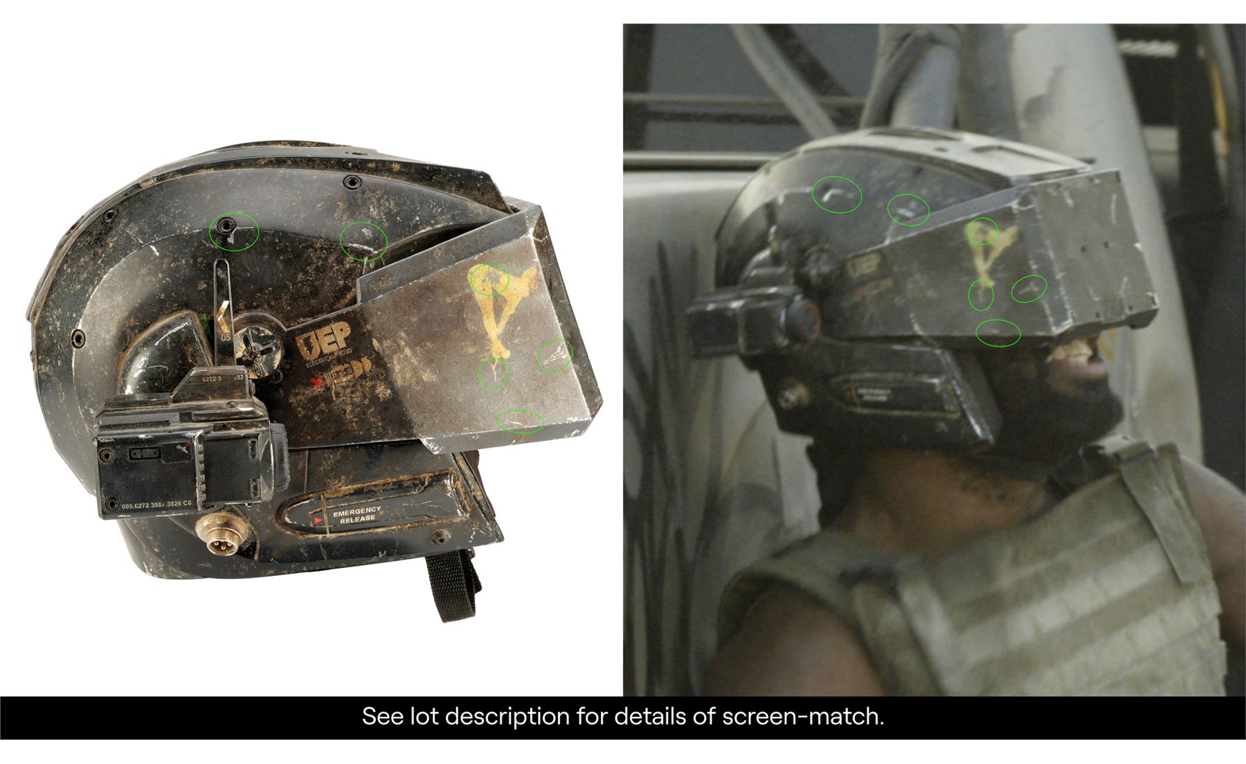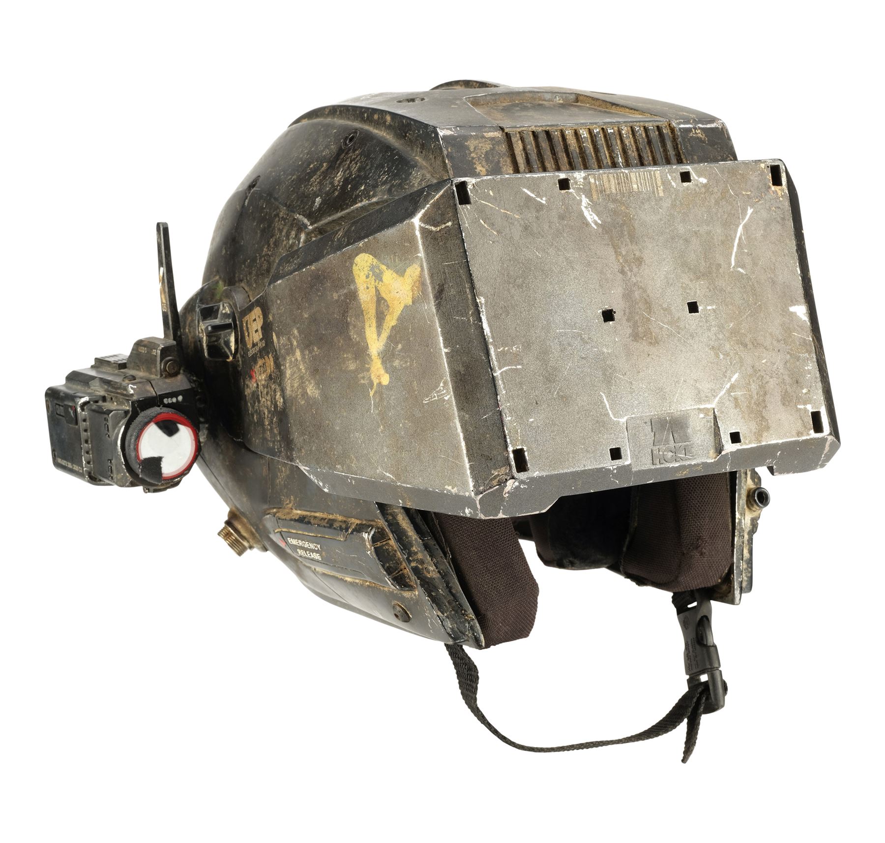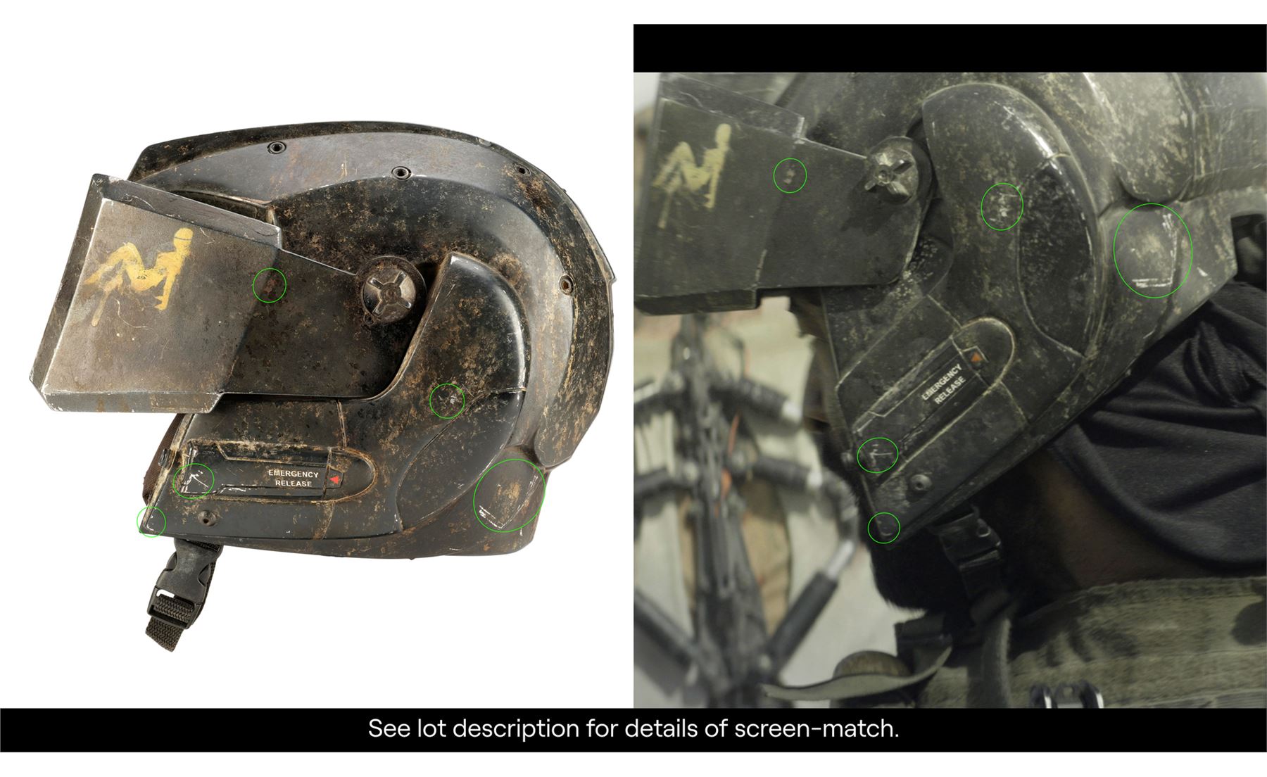 This lot consists of a black dense rubber helmet with a moveable visor and black foam padding on the interior. On the sides of the visor are yellow painted silhouettes of women in various poses. The side of the helmet is equipped with a moveable camera lens with a cable port on the backside. This helmet is covered in production added distress to resemble the dystopian environment. This lot exhibits notable loss of adhesion on the padding's connection to the interior.