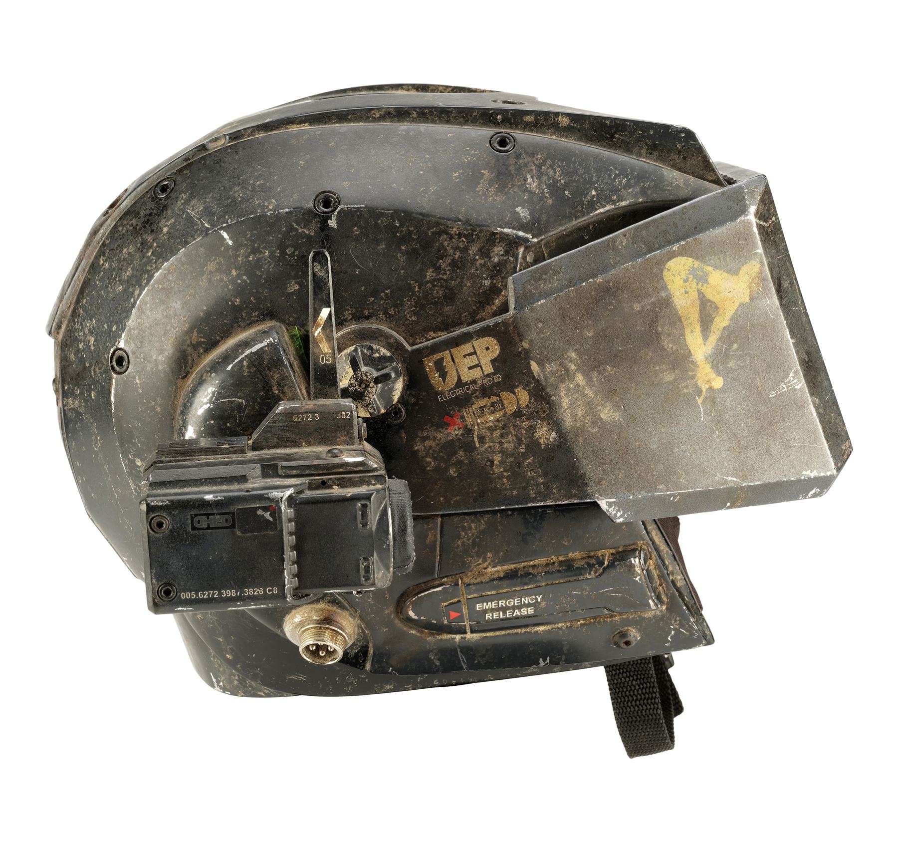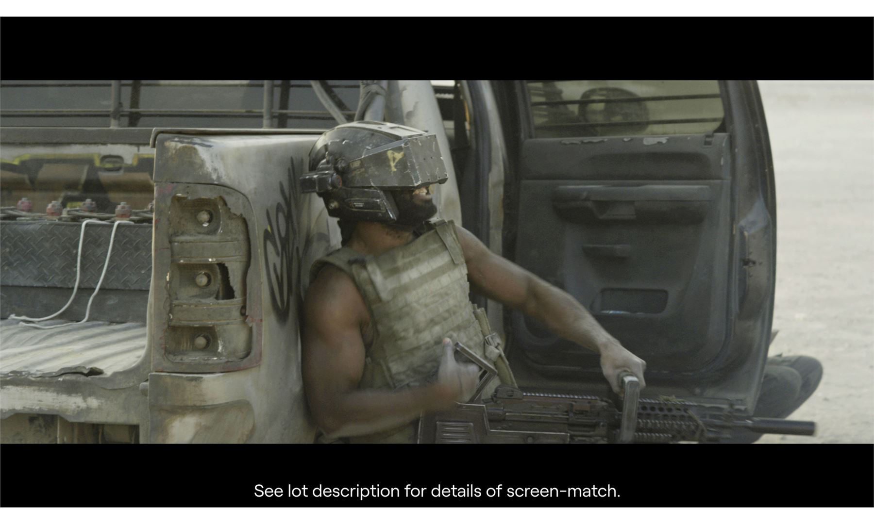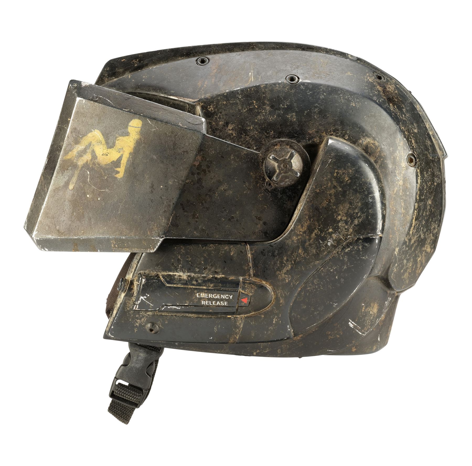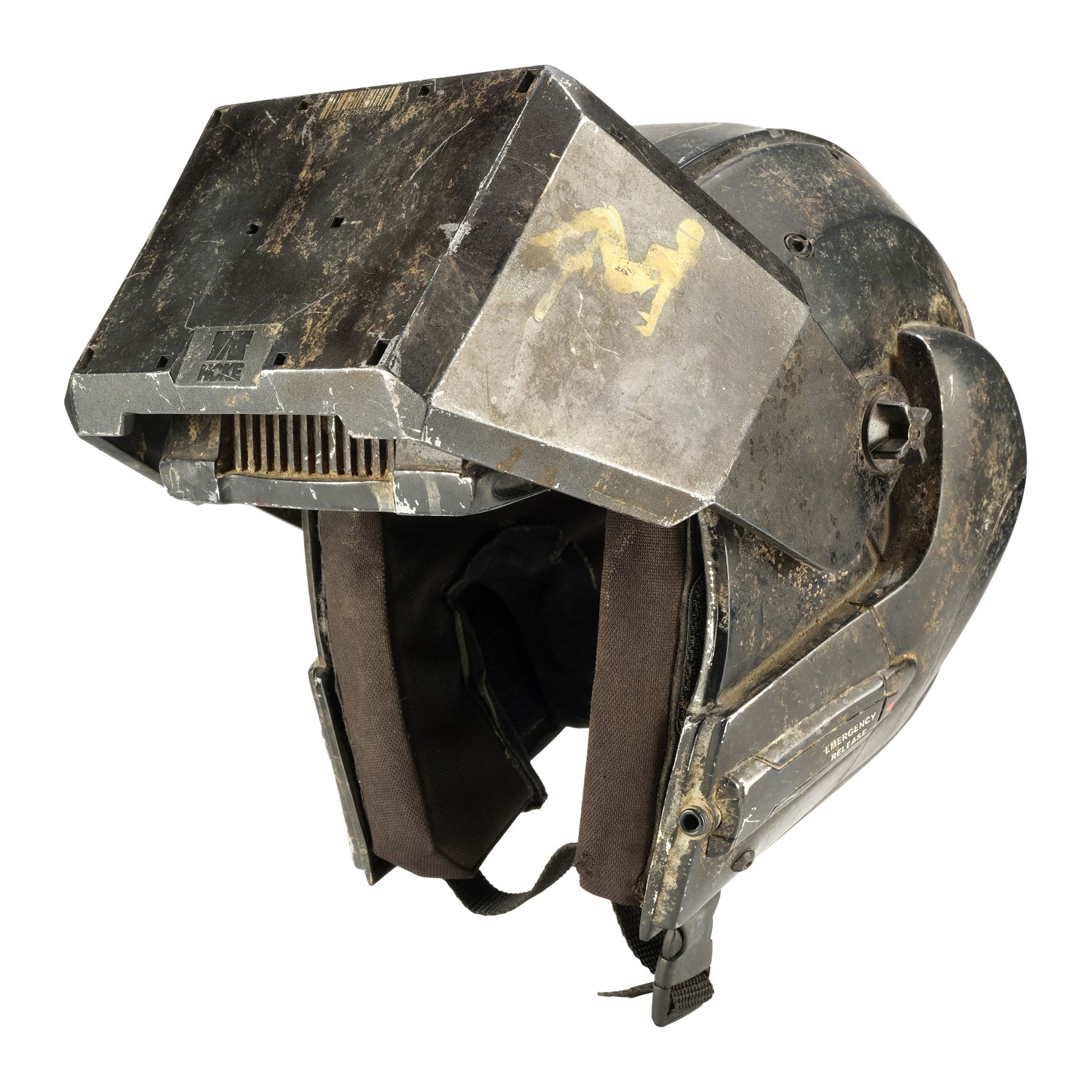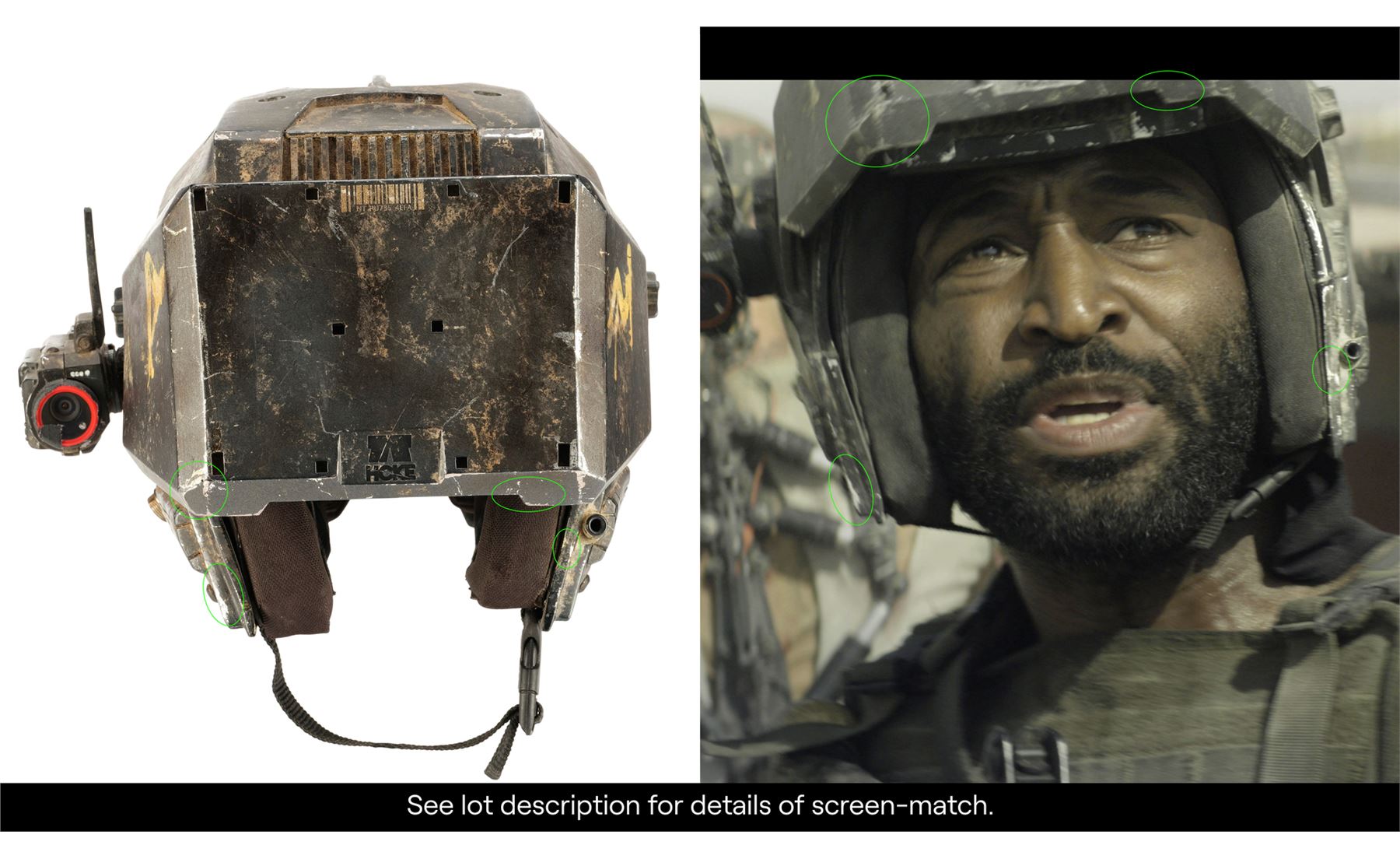 This lot consists of a black dense rubber helmet with a moveable visor and black foam padding on the interior. On the sides of the visor are yellow painted silhouettes of women in various poses. The side of the helmet is equipped with a moveable camera lens with a cable port on the backside. This helmet is covered in production added distress to resemble the dystopian environment. This lot exhibits notable loss of adhesion on the padding's connection to the interior.