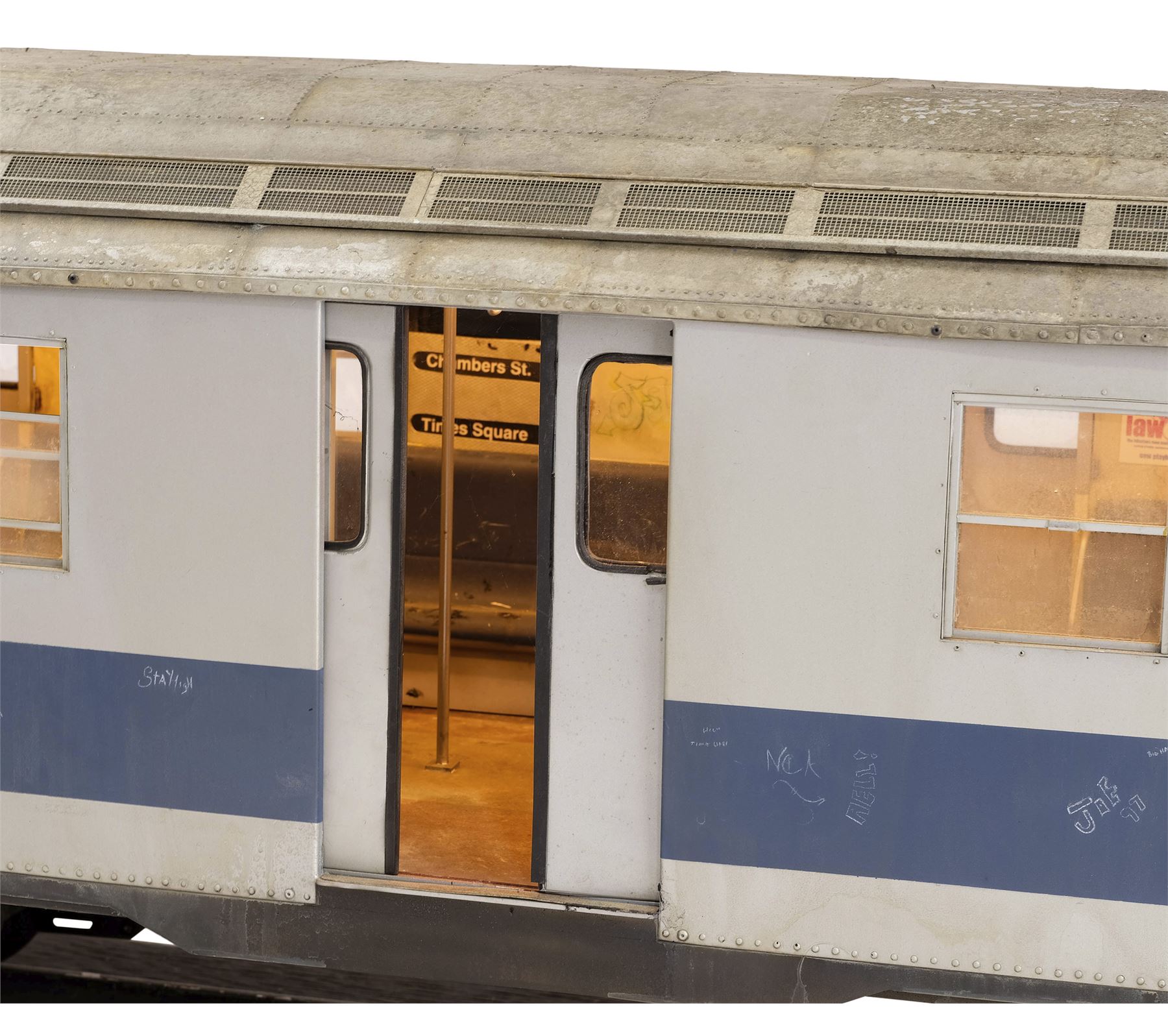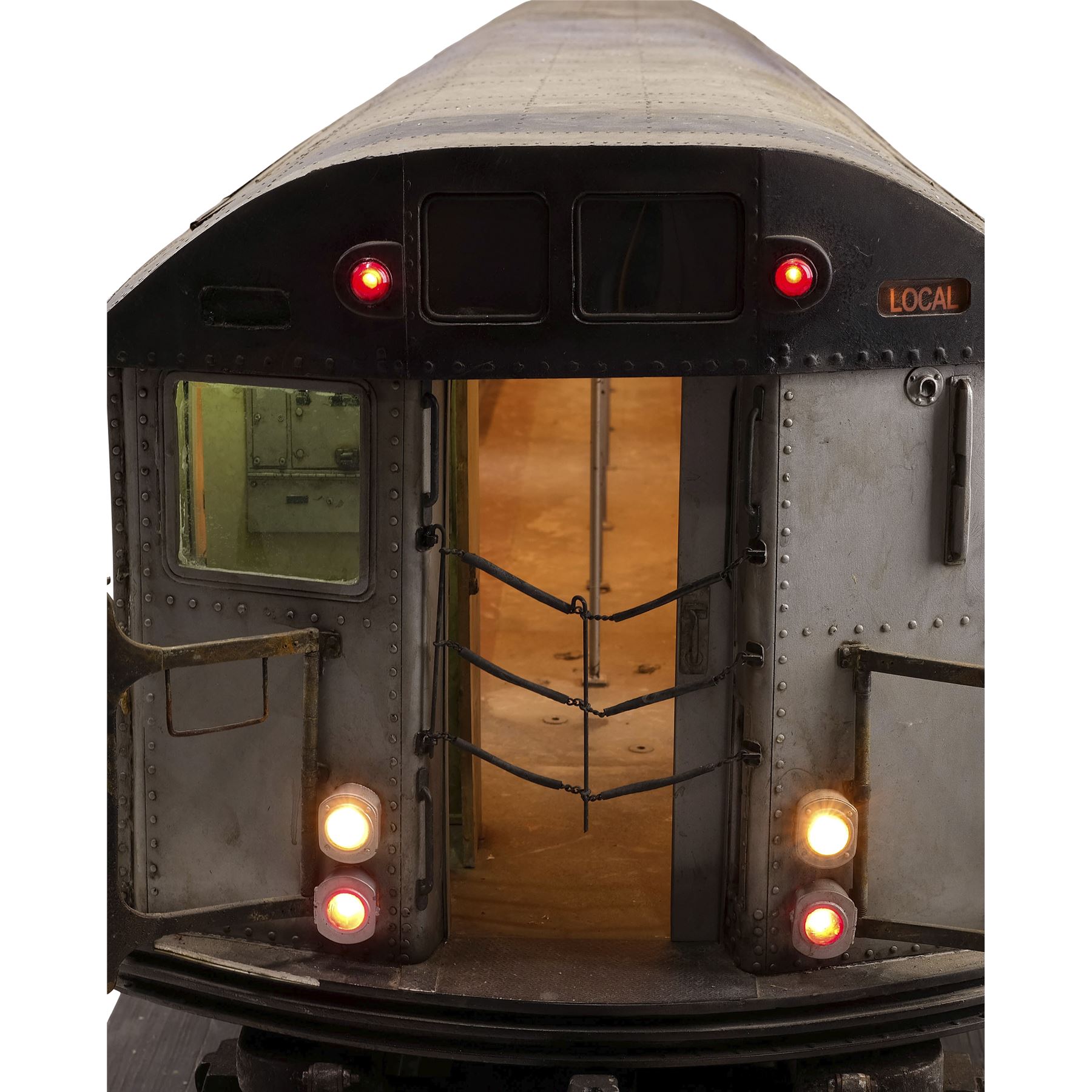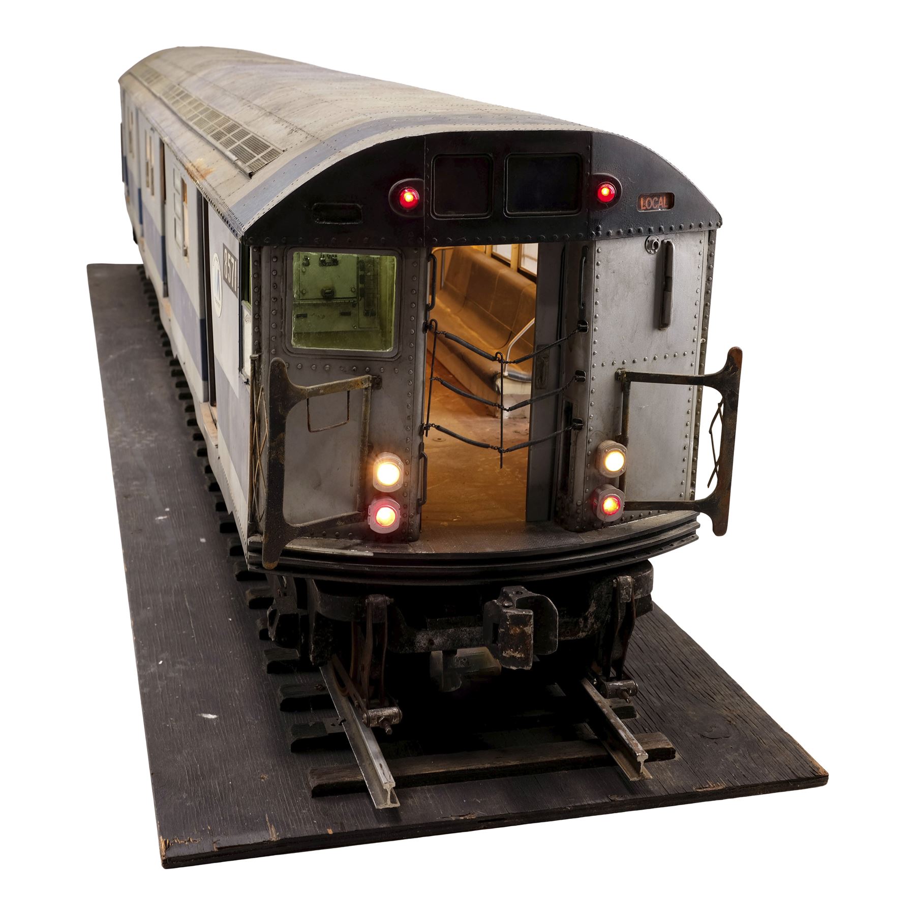 This miniature comes on a set of original production model tracks attached to a wood board painted black. Production intentionally distressed this miniature to give it the appearance of a well-used subway car, including graffiti on the walls. This lot exhibits chipped paint and a buildup of grime in the fine crevices. Dimensions: 95" x 22" x 22" (244 cm x 56 cm x 56 cm)