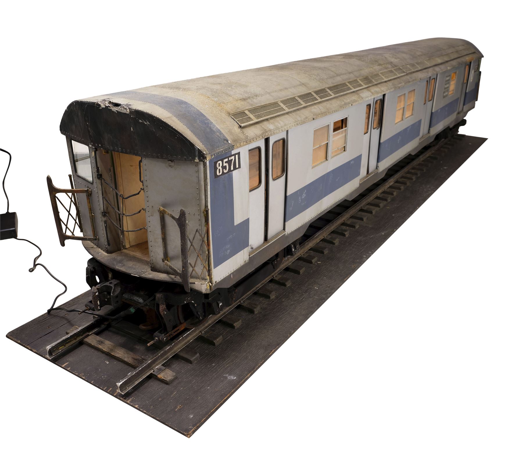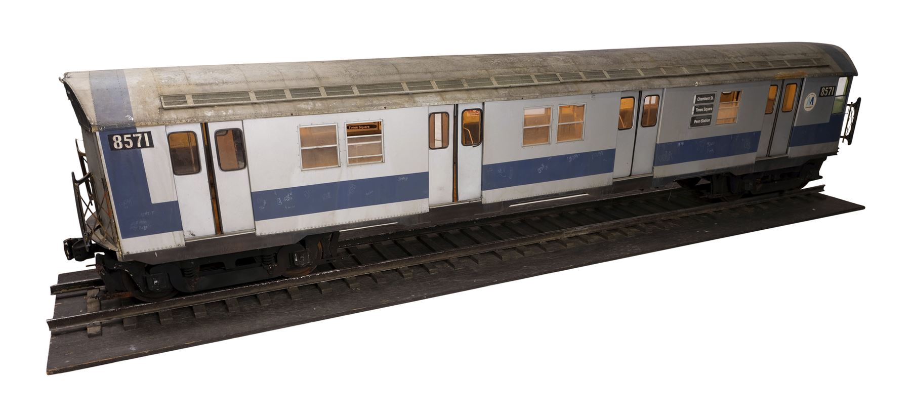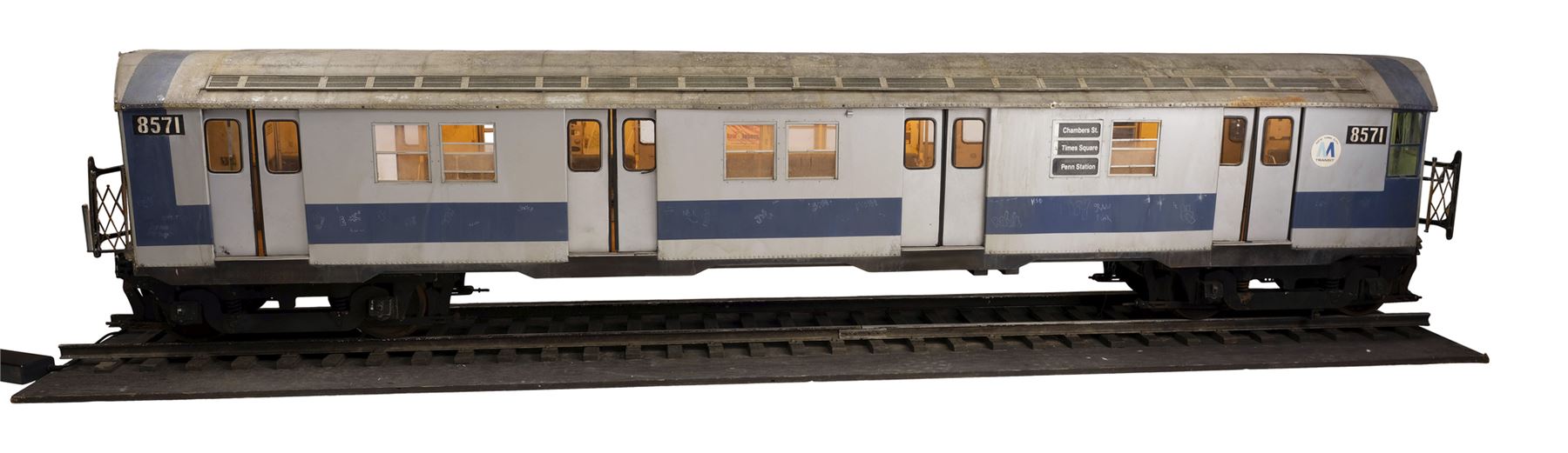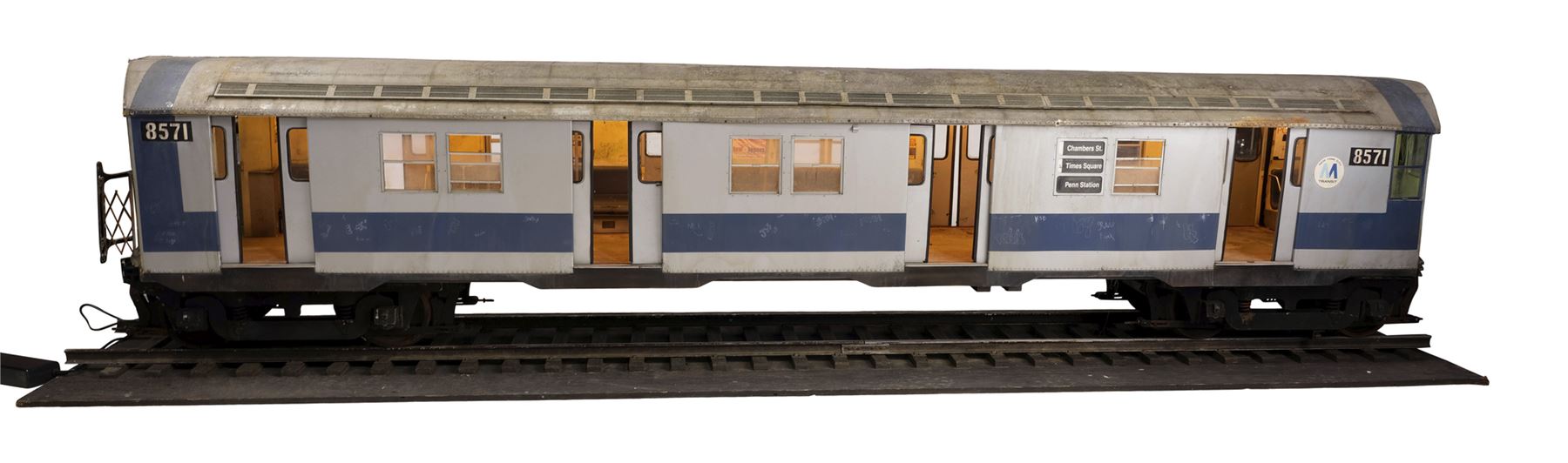 One of two train models used for the crash sequence by Stirber Visual Networks Inc., this large, detailed model miniature train car is made of wood, metal, and plastic with seats and poles on the interior, as well as decal posters and maps. It features the train car numbers "8571" and a "M Transit" decal on the exterior; doors that open and close; vents along the top, plastic windows, and greebles to resemble rivets in metal. The interior of the car lights up, as do the rear lights when powered with an AC adapter.
