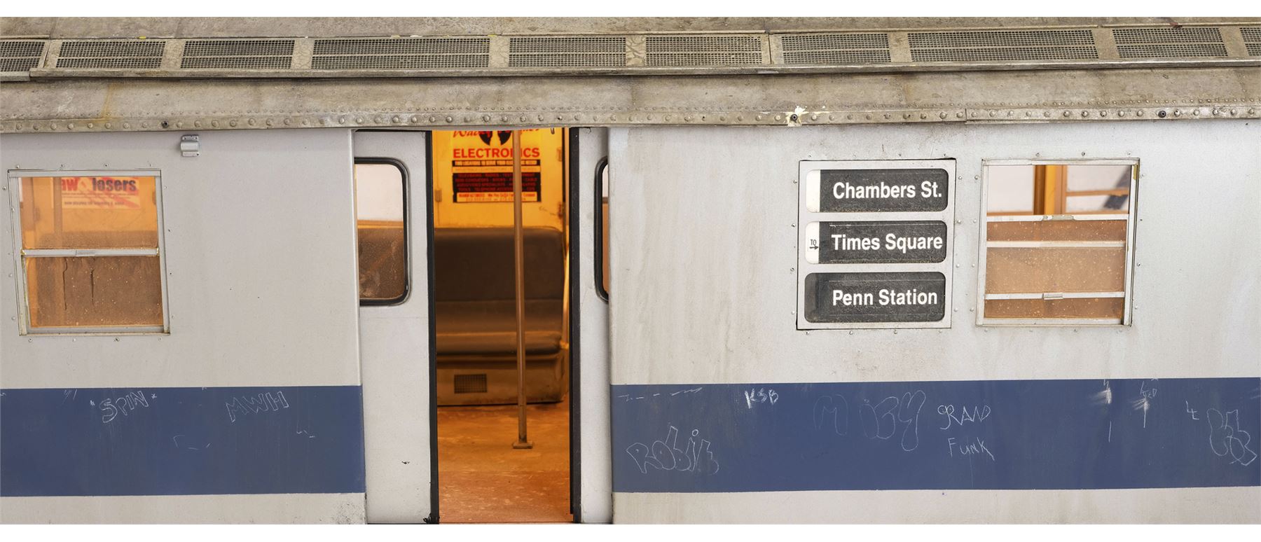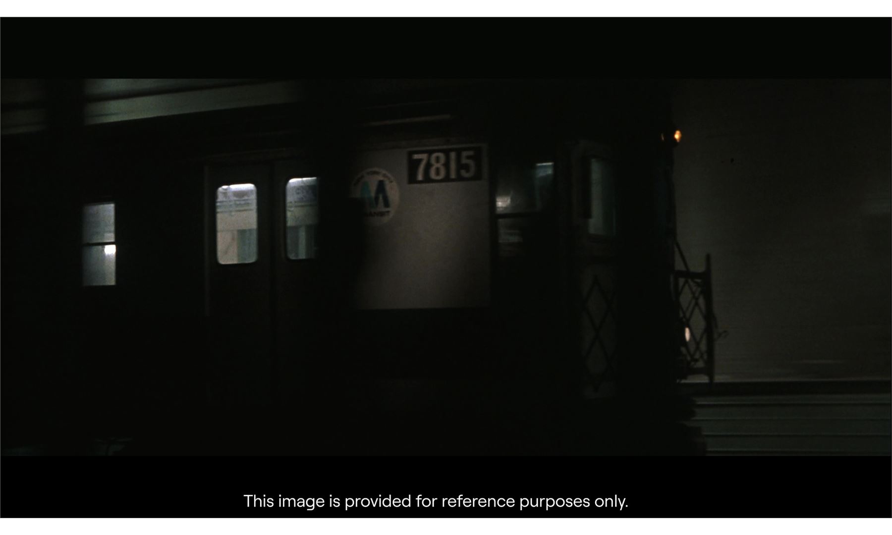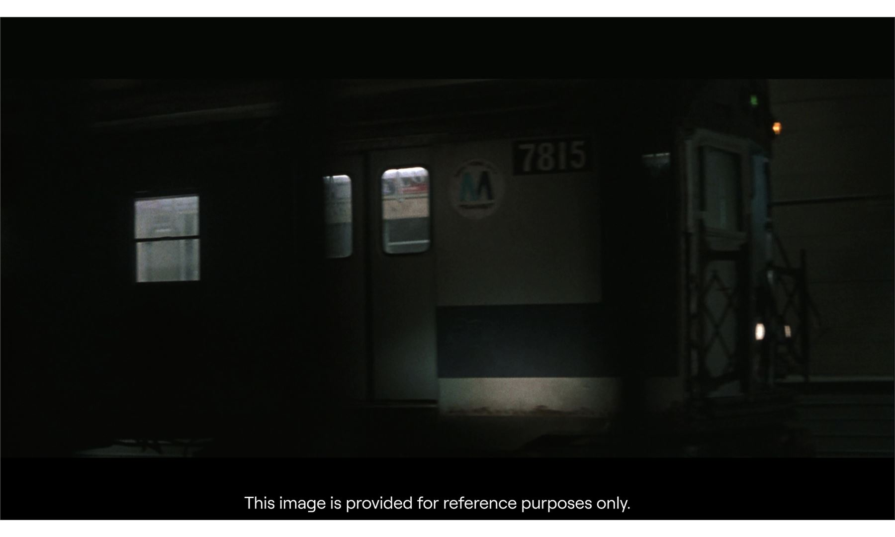 One of two train models used for the crash sequence by Stirber Visual Networks Inc., this large, detailed model miniature train car is made of wood, metal, and plastic with seats and poles on the interior, as well as decal posters and maps. It features the train car numbers "8571" and a "M Transit" decal on the exterior; doors that open and close; vents along the top, plastic windows, and greebles to resemble rivets in metal. The interior of the car lights up, as do the rear lights when powered with an AC adapter.