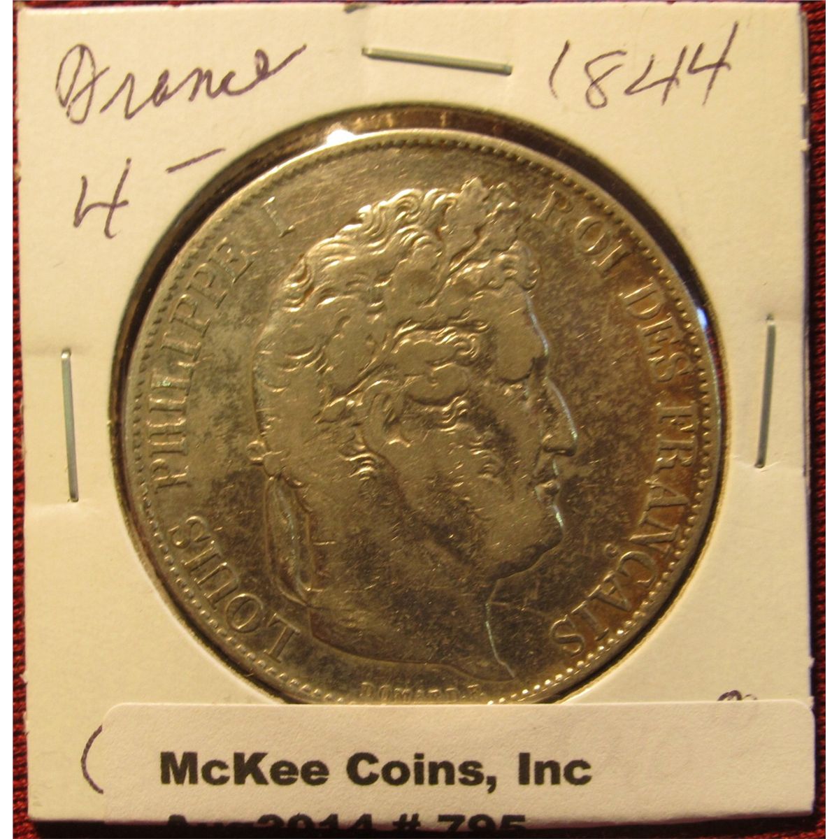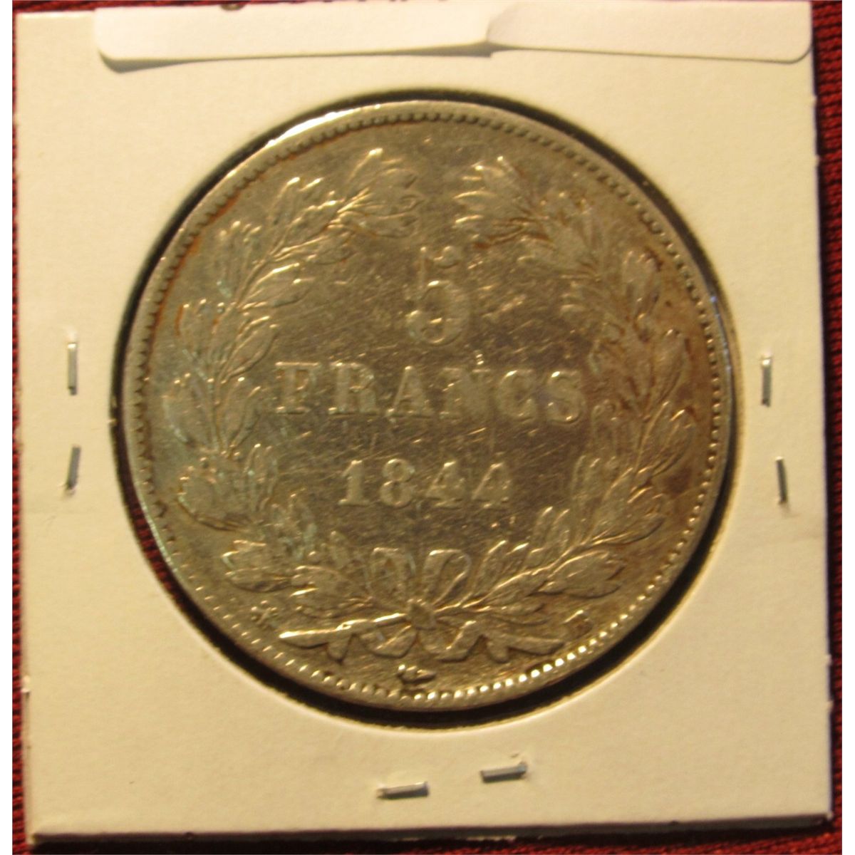 795. 1844 France Silver 5 Francs. Depicts Louis Philippe I. VF.