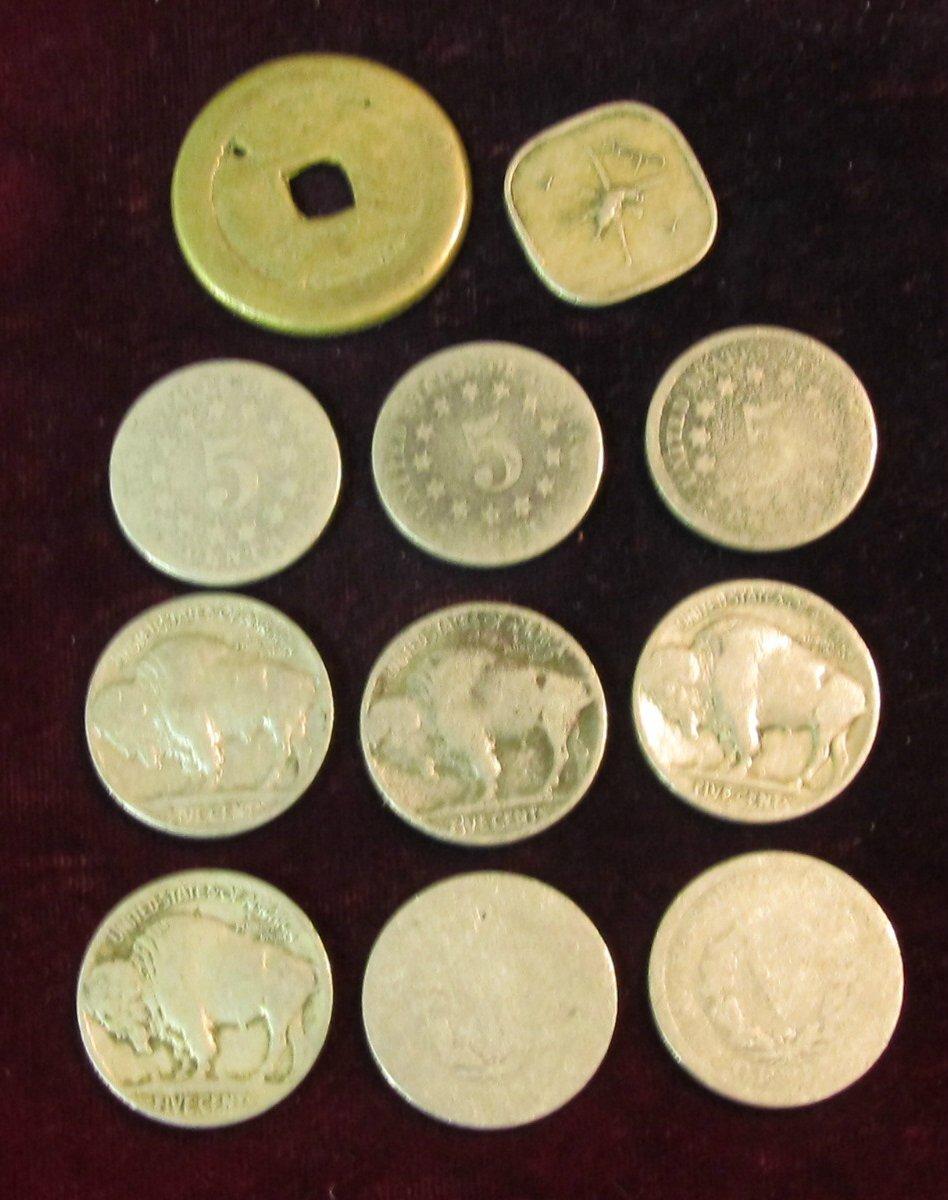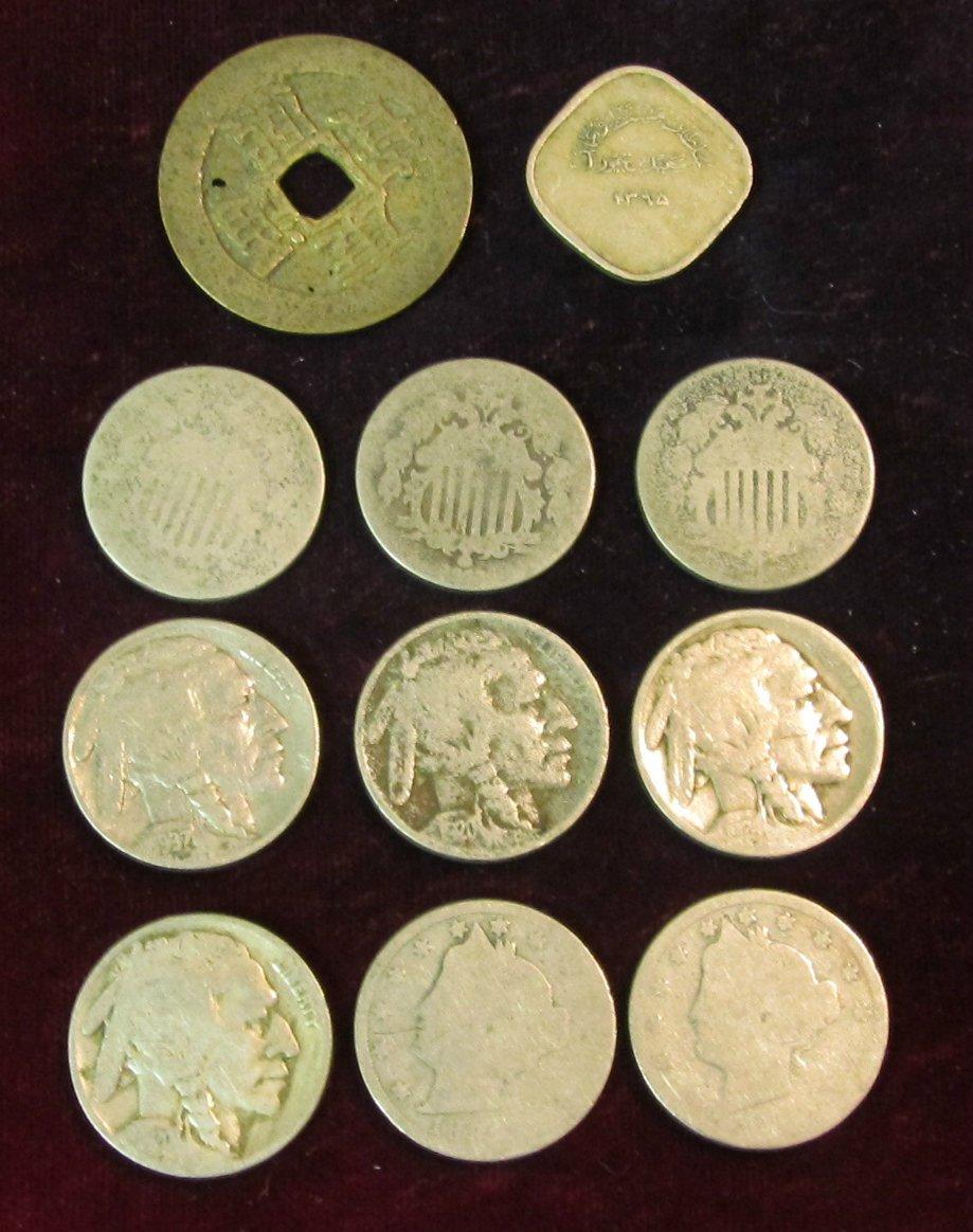 795. (2) Foreign Coins; (3) Shield, (2) Liberty, & (4) Buffalo Nickels. Circulated.
