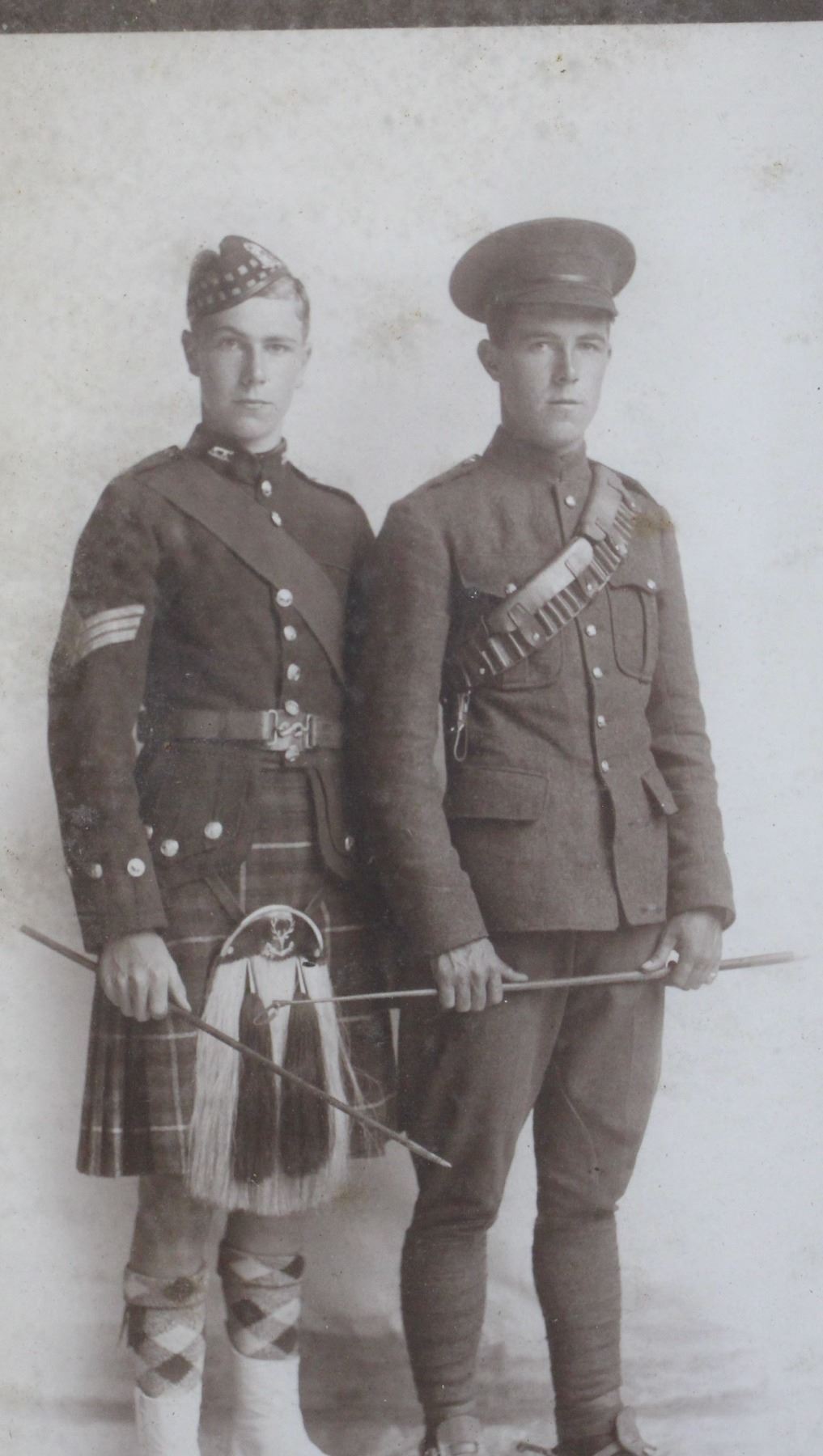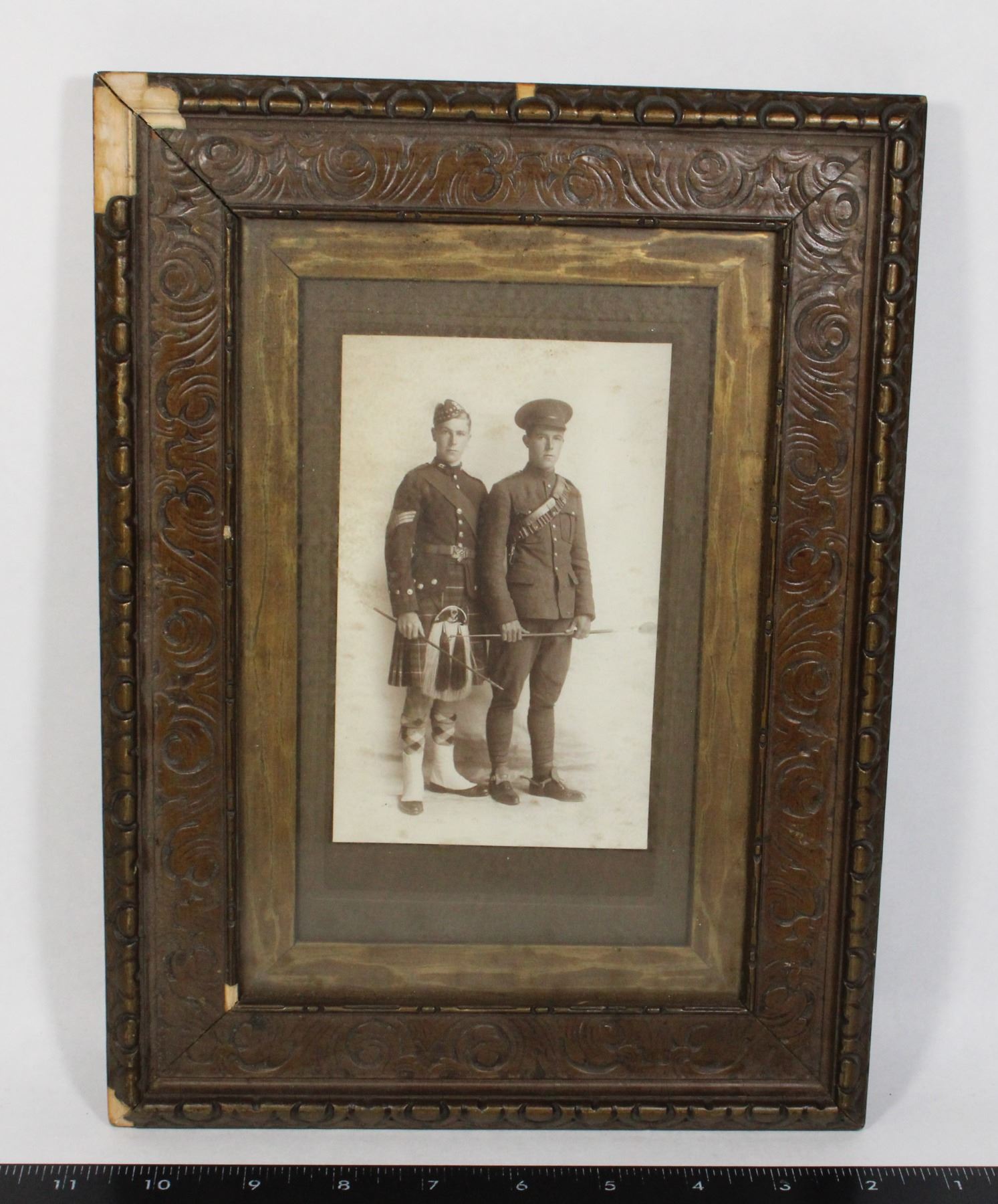 REAL PHOTO POST CARD RPPC FRAMED MEASURING 12 X 9 INCHES. DEPICTS 72ND REGIMENT SEAFORTH HIGHLANDERS OF CANADA SOLDIER WITH KILT COLLAR BADGES VISIBLE AND SOLDIER NEXT TO HIM. WORLD WAR ONE / EARLY 1900'S PHOTOGRAPH IN WORN FRAME