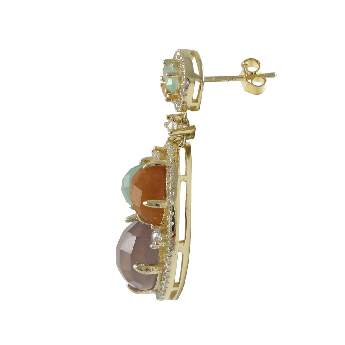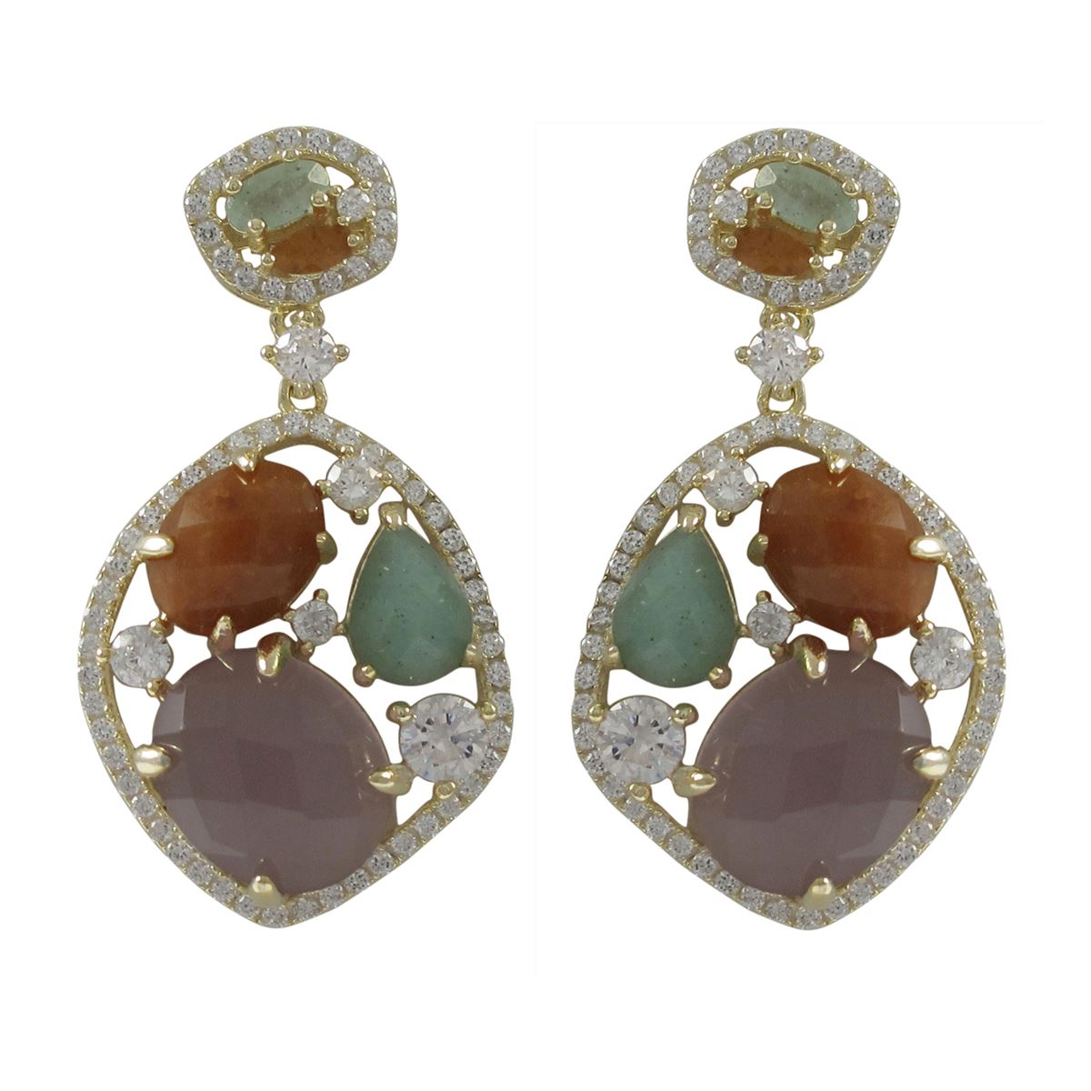 Gold Plated Sterling Silver CZ Post Earrings With Multi Color Combination Semi Precious Stones, 1.42"