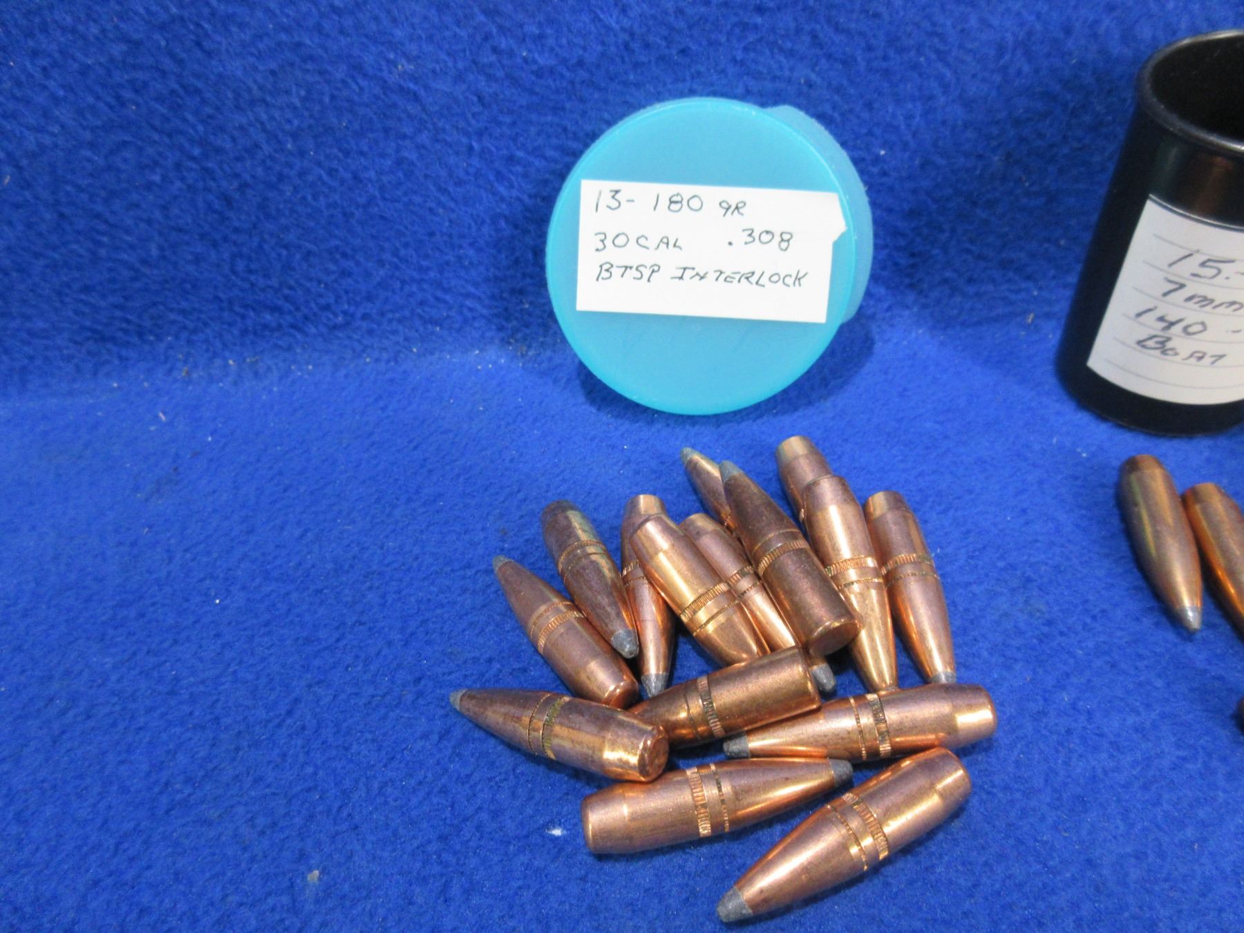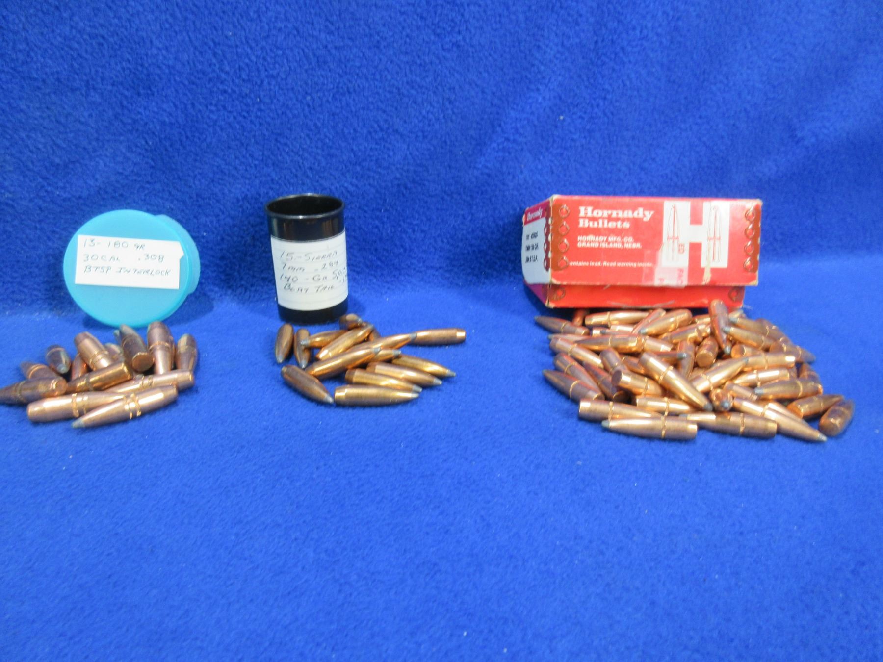 7MM .284" and 30 Cal. .308" Bullets - Box of 60 (7MM 139gr BTSP Hornady), Box of 15 (7MM 140gr Spitzer BT Sierra), Box of 13 (30 Cal. BTSP Interlock Hornady)