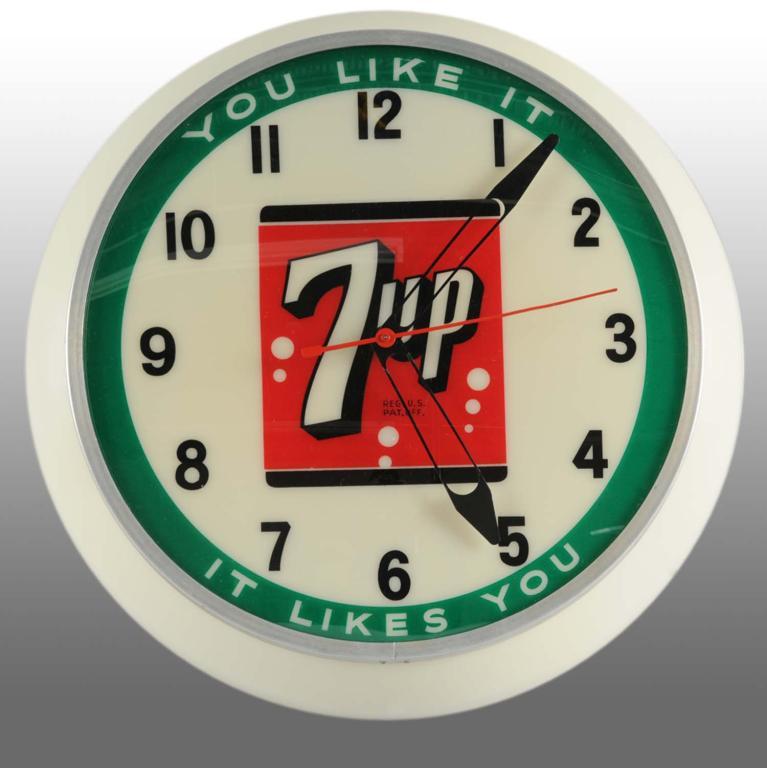 Marked “7UP You like it, it likes you”. Plastic border with case wear to the back. Runs quiet. Condition (9.5, Near Mint). Size 17" x 17".