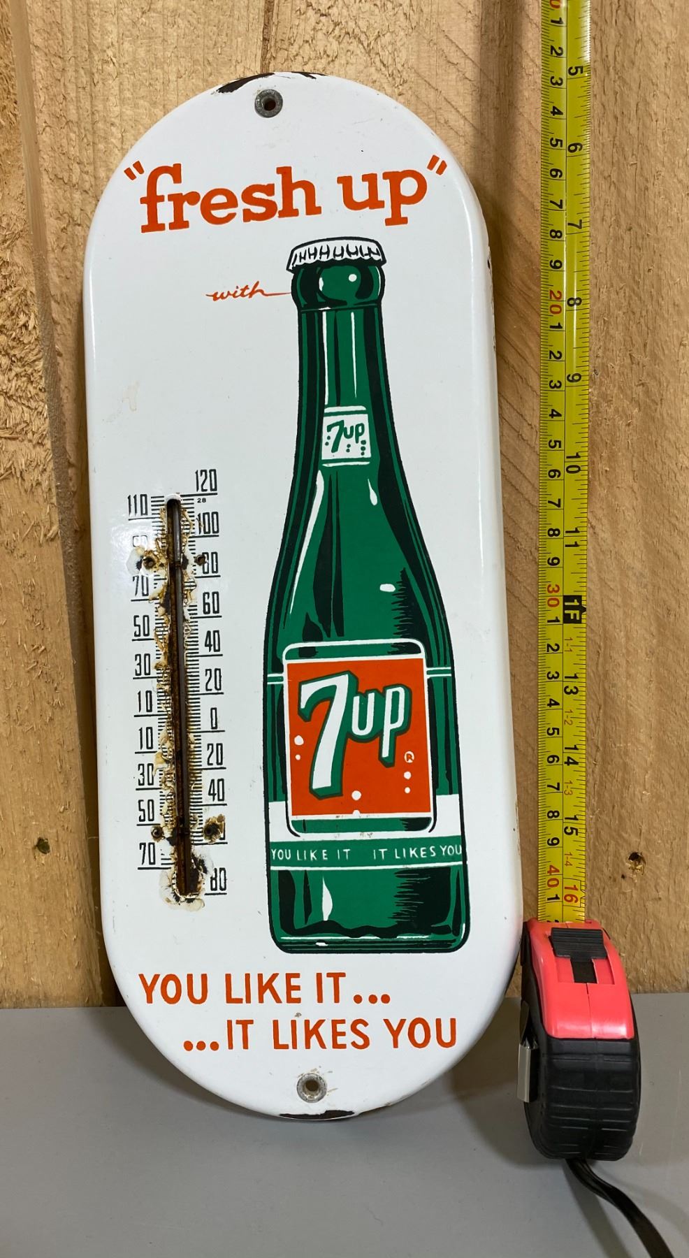 7UP PORCELAIN SIGN WITH THERMOMETER - 1950's