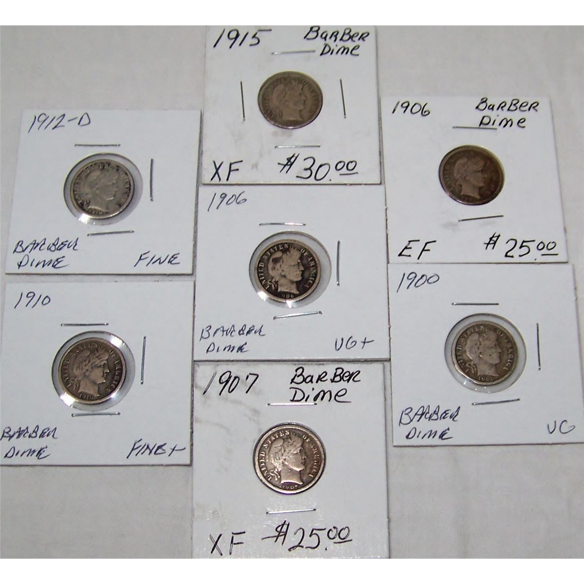 (7X$) CHOICE BARBER SILVER DIMES VG-XF 1900,(2) 1906,1907,1910,1912-D,1915