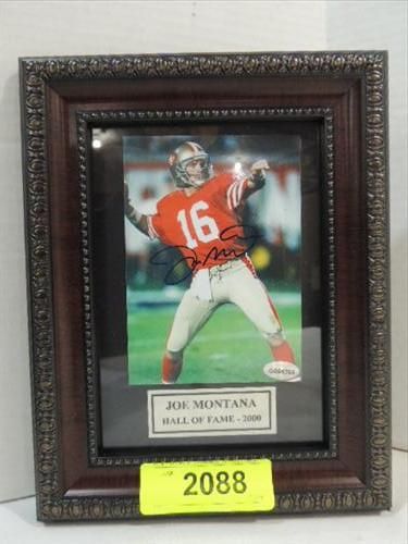 7X9 FRAMED FOOTBALL PHOTO AUTOGRAPH JOE MONTANA. INCLUDES COA FROM MFP II #G064366. AS SHOWN. VIEW PICTURE FOR DETAIL.