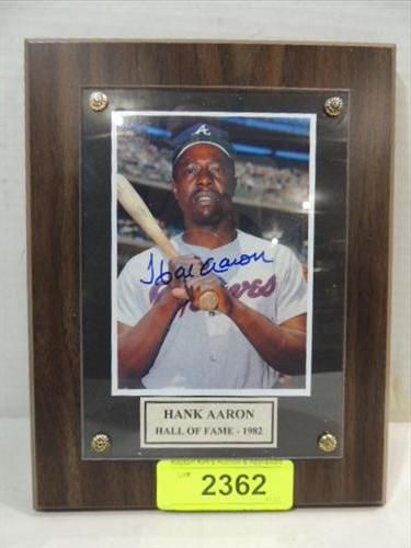 7X9 PLAQUE BASEBALL PHOTO AUTOGRAPH HANK AARON COA. INCLUDES COA FROM MFP II. AS SHOWN. VIEW PICTURE FOR DETAIL. PLEASE BE ADVISED, AND INFORMED REGARDING SIGNATURES OR AUTOGRAPHS THAT WE SELL AT AUCTION: WE ARE NOT AUTHENTICATORS, AND WE DO NOT AUTHENTICATE, OR VALIDATE ANY AUTOGRAPHS OR SIGNATURES THAT WE OFFER AT AUCTION. SOME AUTOGRAPHS OR SIGNATURES MAY COME WITH AN AUTHENTICATION FROM ANY ONE OF LITERALLY HUNDREDS OF AUTHENTICATORS ACROSS THE COUNTRY, AND AROUND THE WORLD. WE DO NOT ENDORSE ANY AUTHENTICATOR, NOR DO WE GUARANTEE THAT ANY AUTOGRAPH OR SIGNATURE IS AUTHENTIC, OR THAT IT WILL PASS AUTHENTICATION BY ANY AUTHENTICATOR. ALL AUTOGRAPHS OR SIGNATURES ARE SOLD