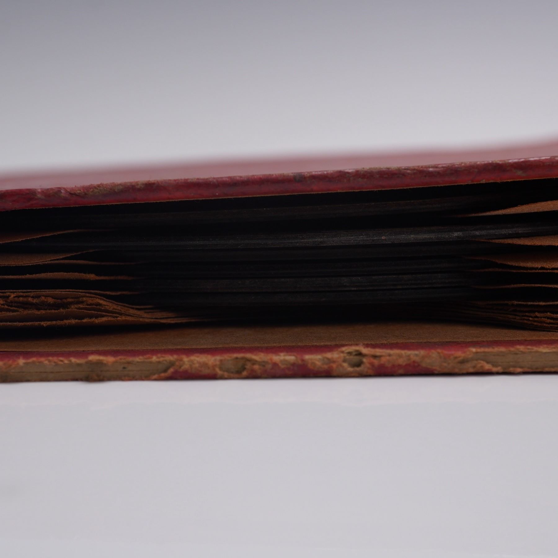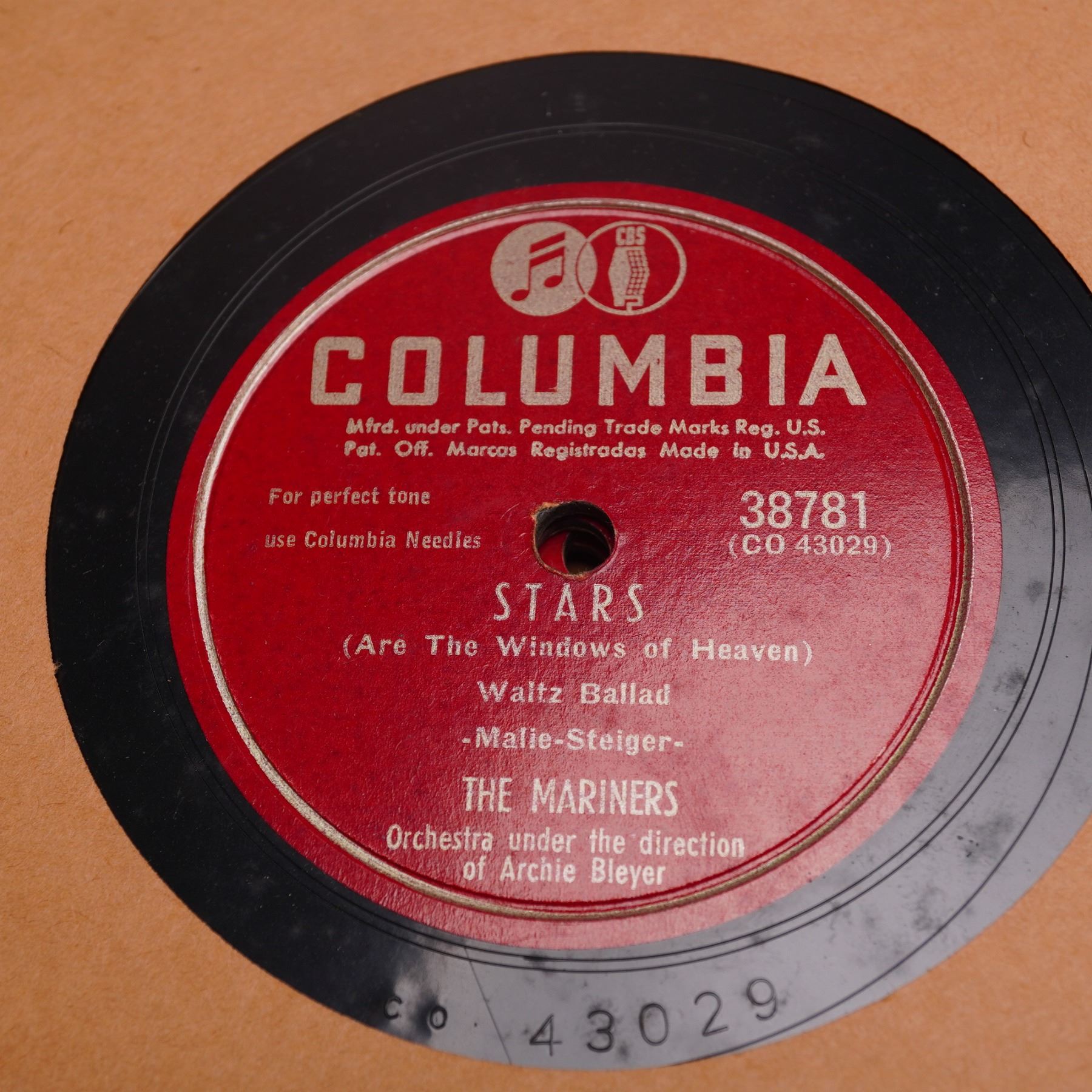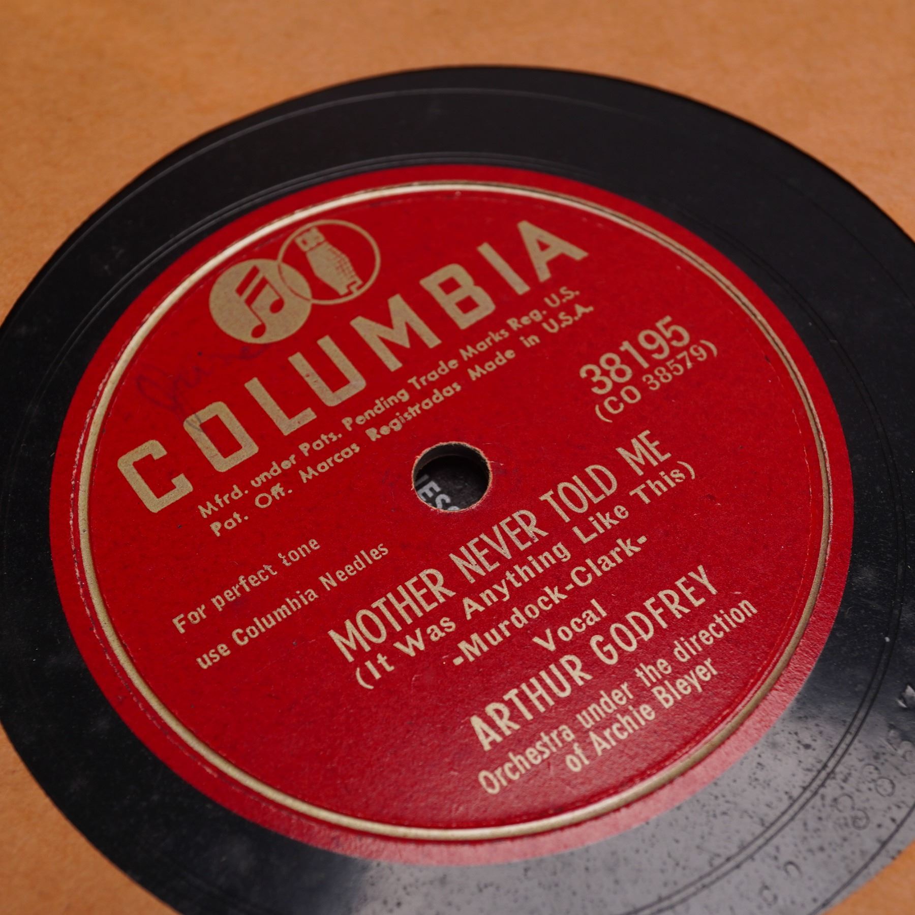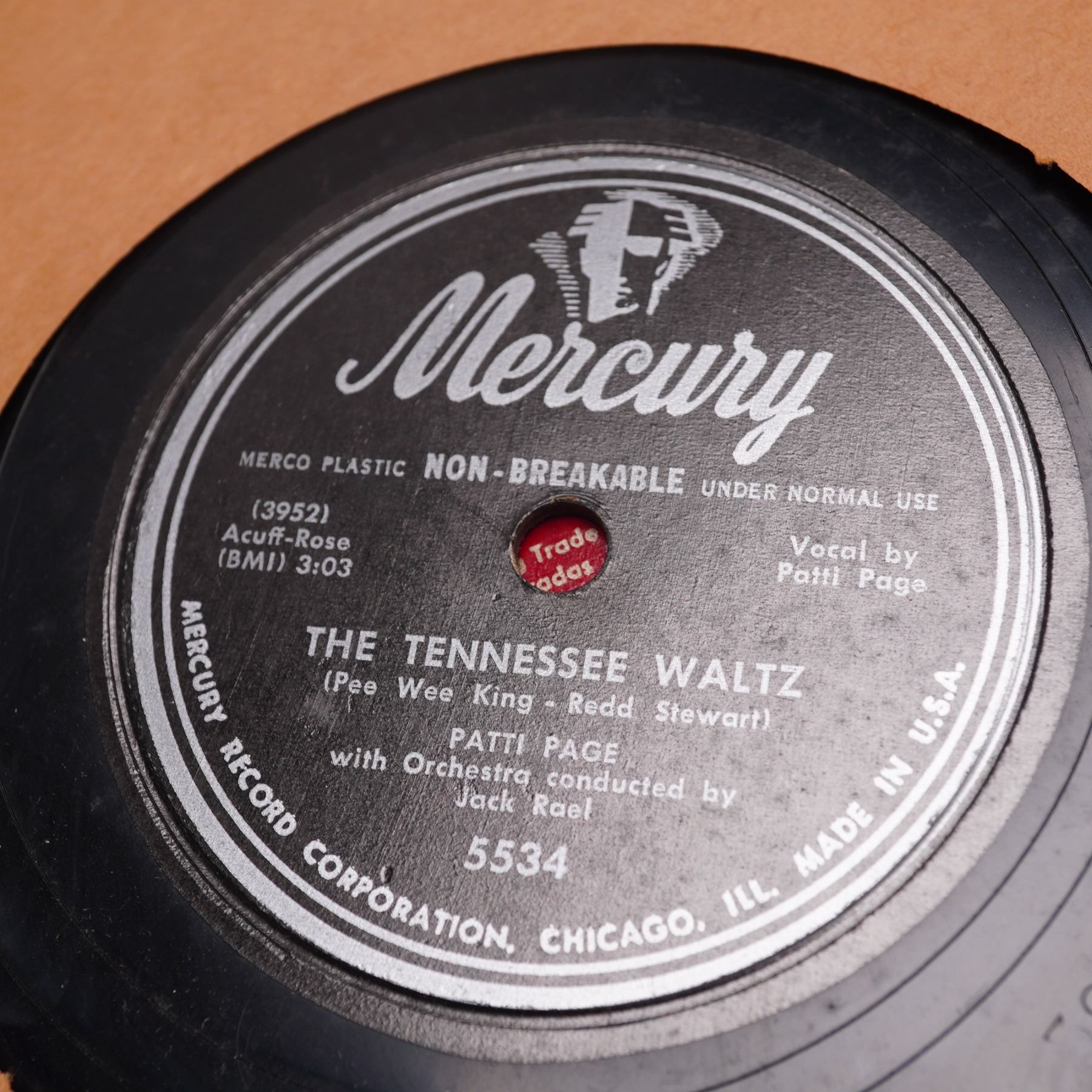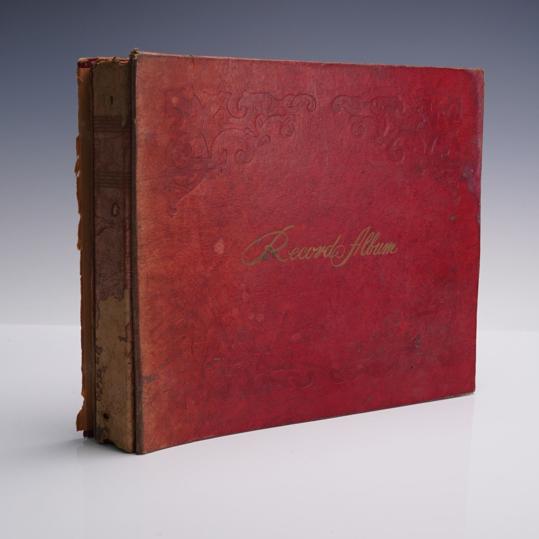 Vintage red vinyl-covered record album containing six 78 RPM records from artists including Patti Page, The Mariners, Arthur Godfrey and more. Labels include Columbia and Mercury, with songs such as 'The Tennessee Waltz', 'Stars (Are the Windows of Heaven)', 'Mother Never Told Me' and more. Records are stored in original paper sleeves inside a bound flip-style record album with handwritten index sheet. A charming mid-century snapshot of early American pop and ballads in classic shellac format.