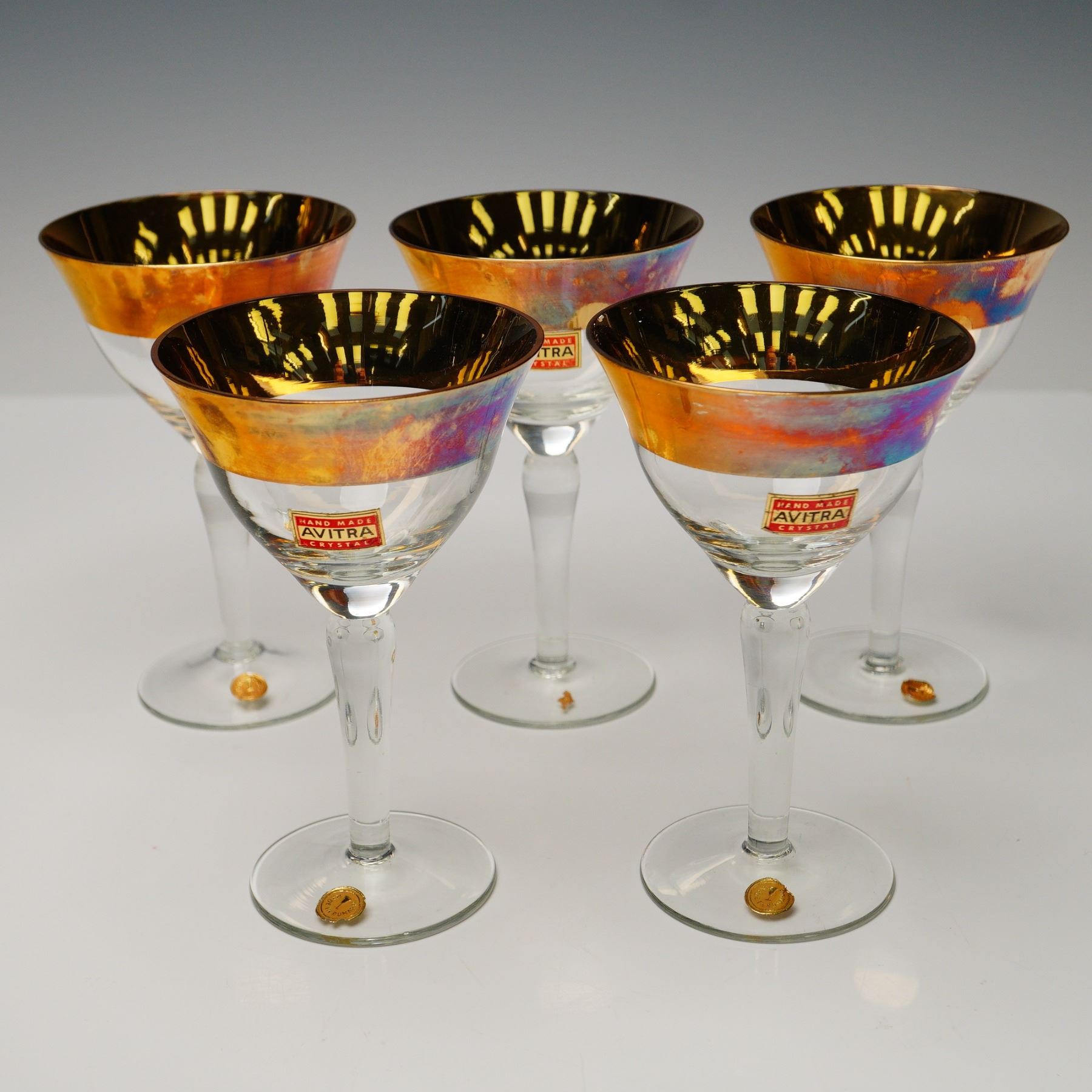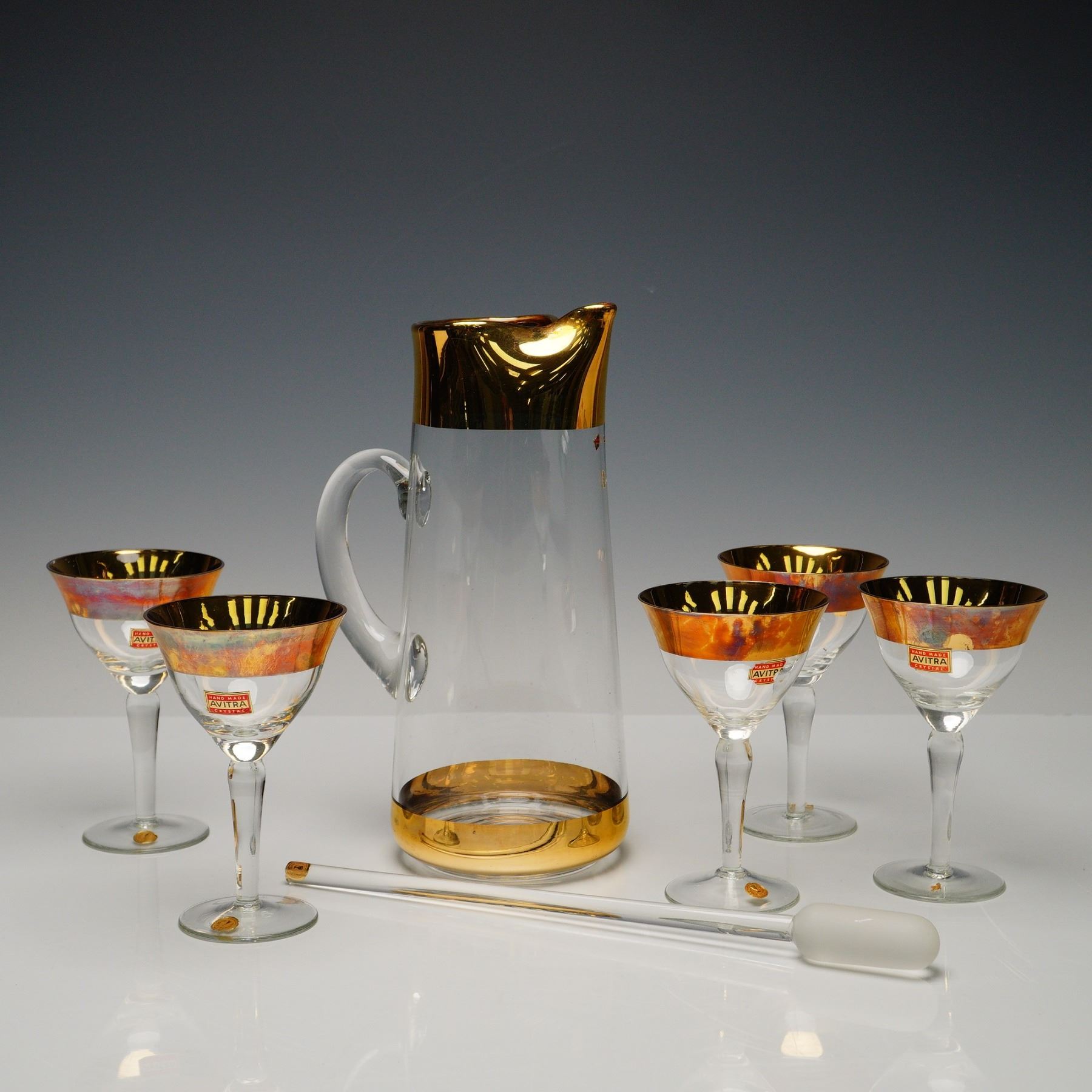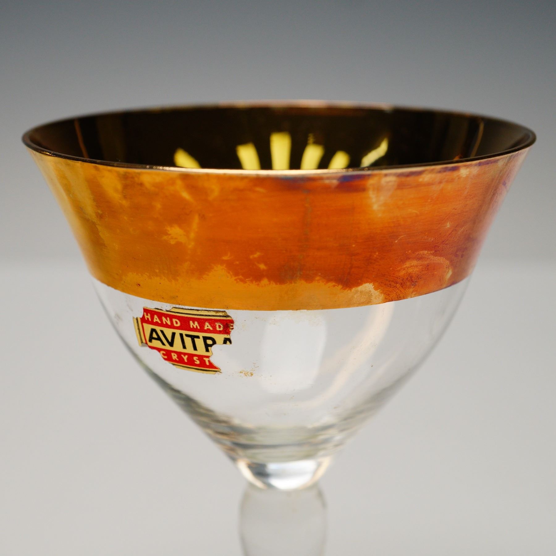 A seven-piece Avitra crystal cocktail set including a tall handled pitcher with matching stir rod and five elegant cocktail glasses. Each piece is clear crystal adorned with a wide iridescent copper-tone band beneath a mirror-polished gold rim, with matching gold detail at the base of the pitcher and the tip of the glass stirrer. The pitcher features a gently flared spout and applied handle, while the glasses stand on slender stems with classic shallow bowls. Several pieces retain their original "Avitra Crystal Handmade Romania" foil labels. The set exhibits only minor signs of handling and presents beautifully for use or display. This Romanian-made ensemble blends midcentury style with hand-finished refinement.