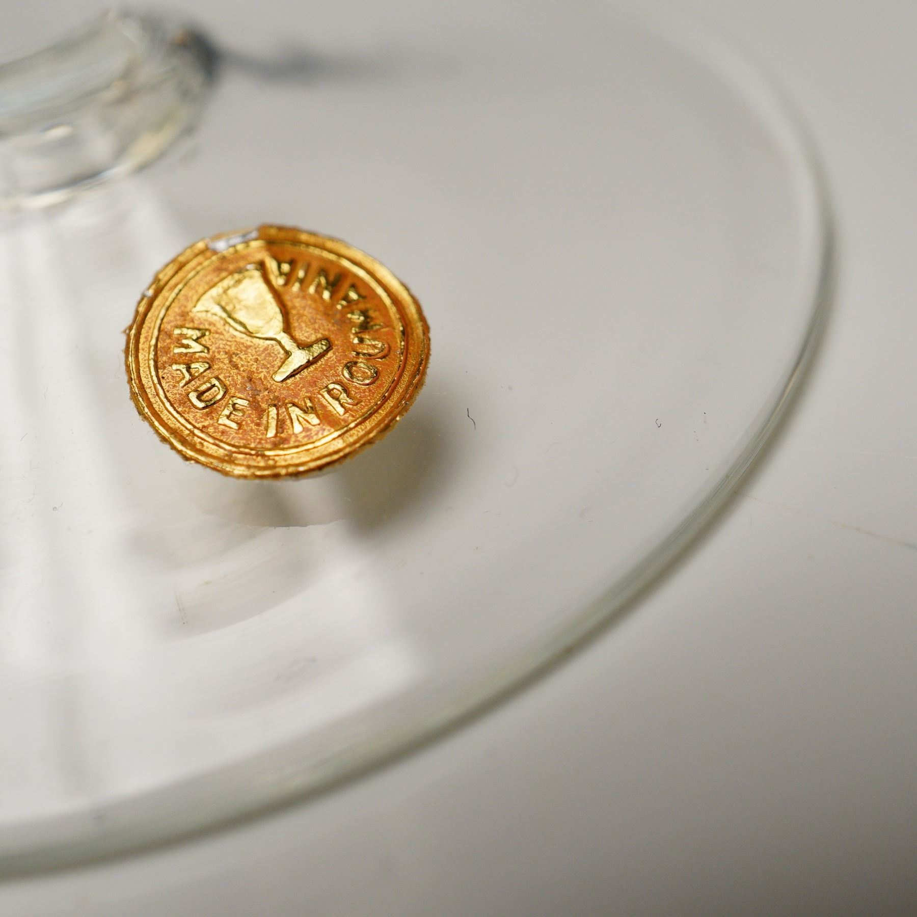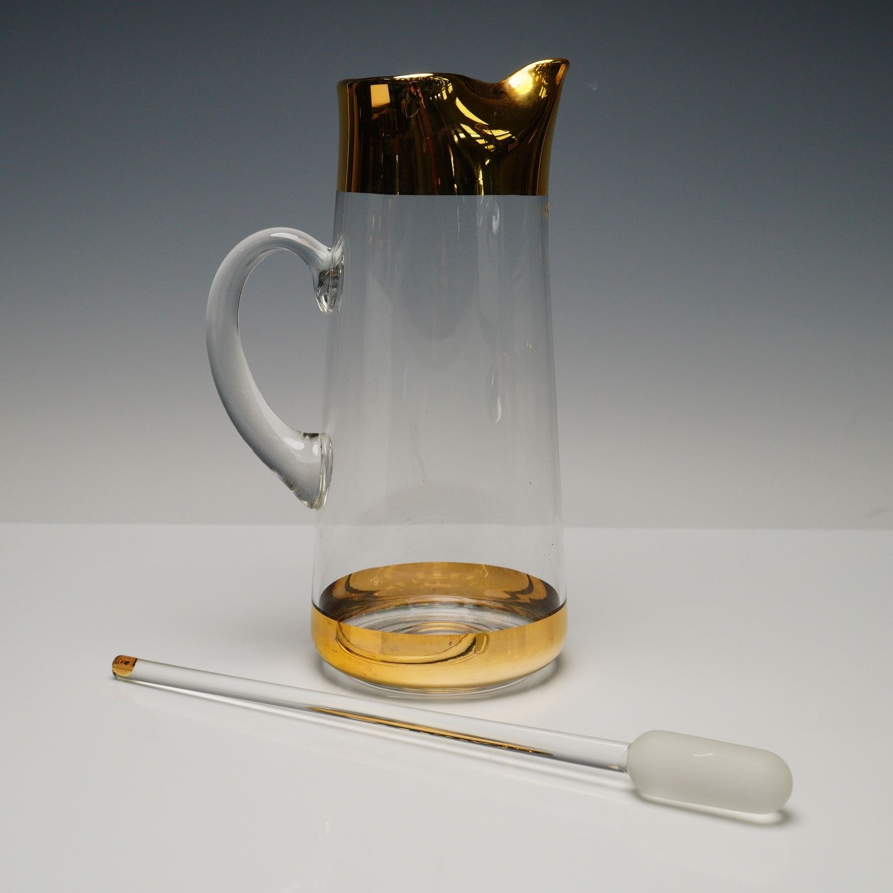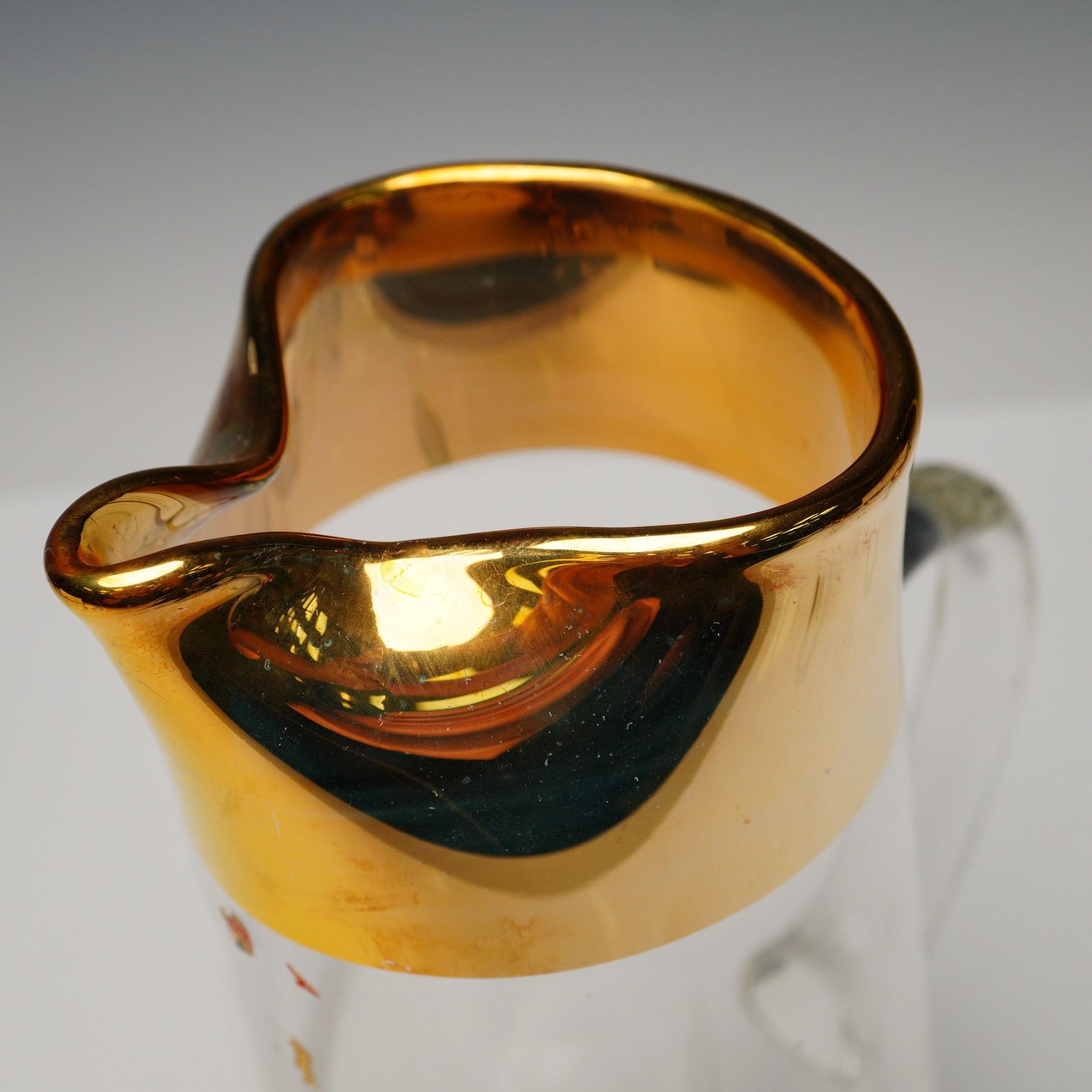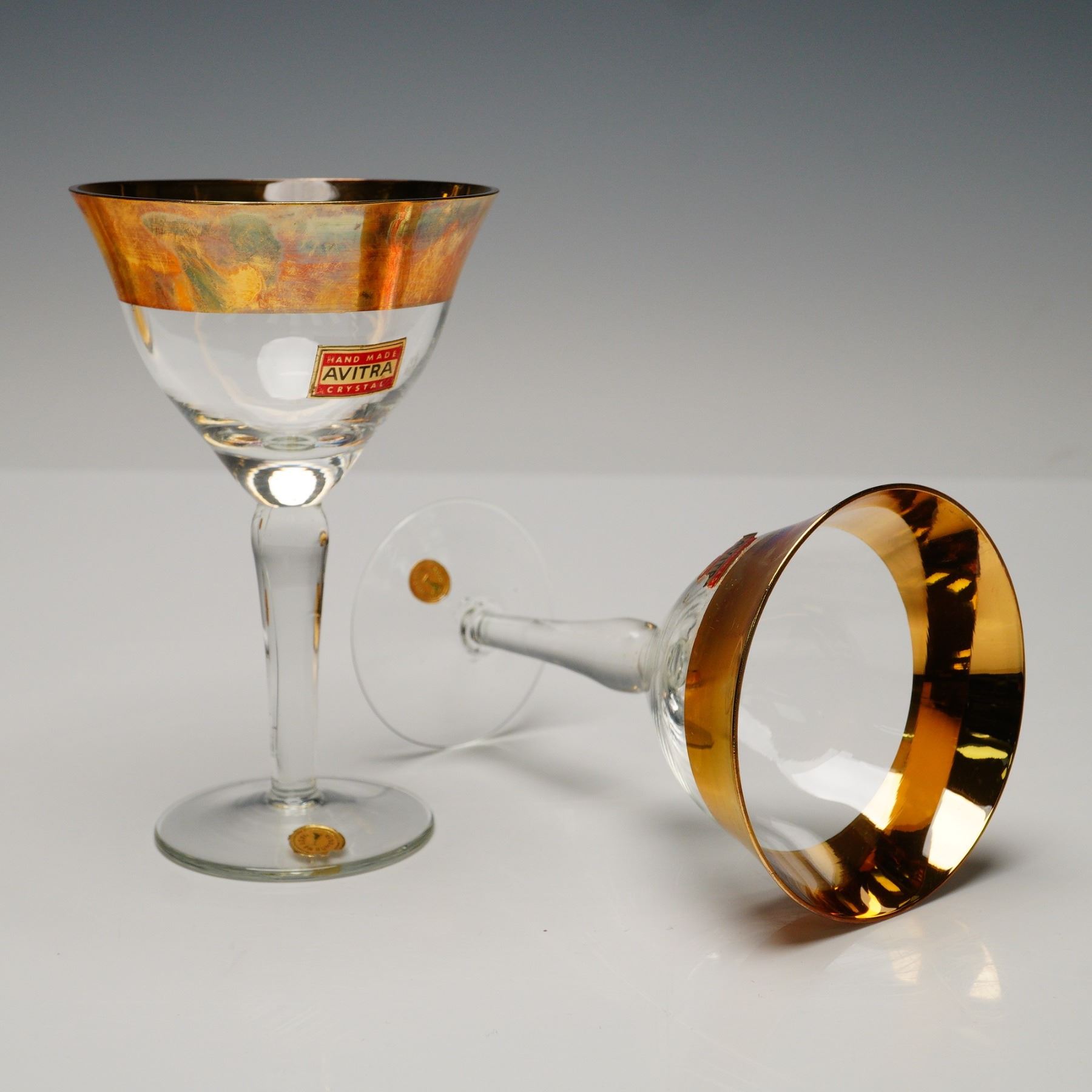 A seven-piece Avitra crystal cocktail set including a tall handled pitcher with matching stir rod and five elegant cocktail glasses. Each piece is clear crystal adorned with a wide iridescent copper-tone band beneath a mirror-polished gold rim, with matching gold detail at the base of the pitcher and the tip of the glass stirrer. The pitcher features a gently flared spout and applied handle, while the glasses stand on slender stems with classic shallow bowls. Several pieces retain their original "Avitra Crystal Handmade Romania" foil labels. The set exhibits only minor signs of handling and presents beautifully for use or display. This Romanian-made ensemble blends midcentury style with hand-finished refinement.
