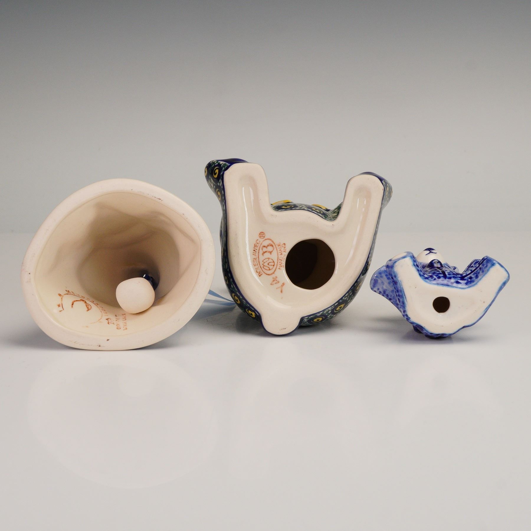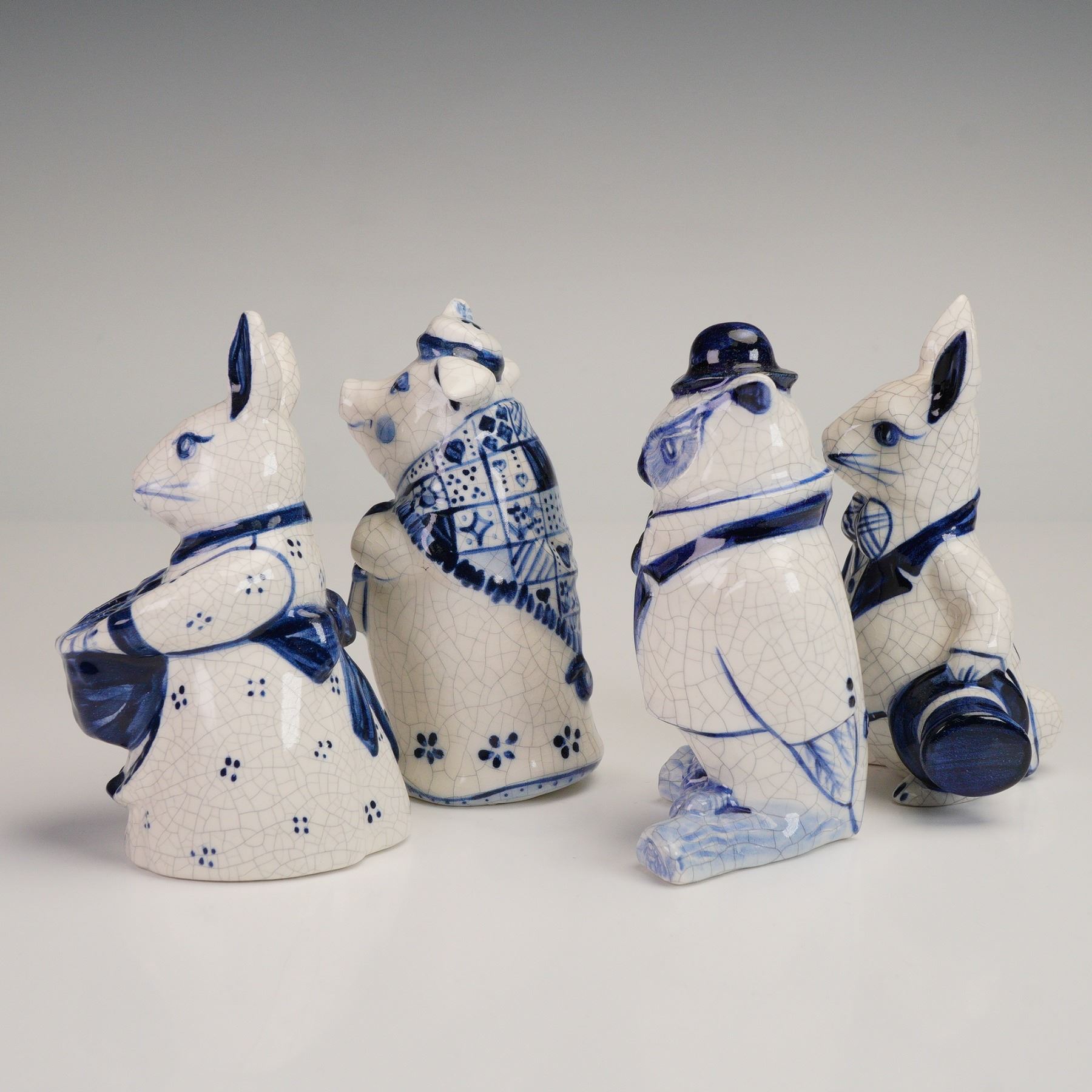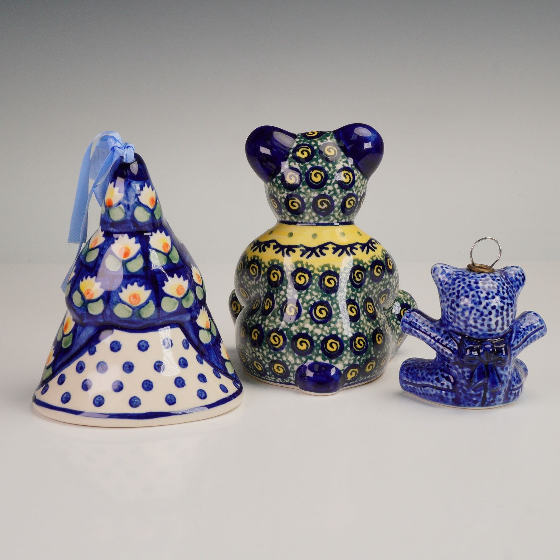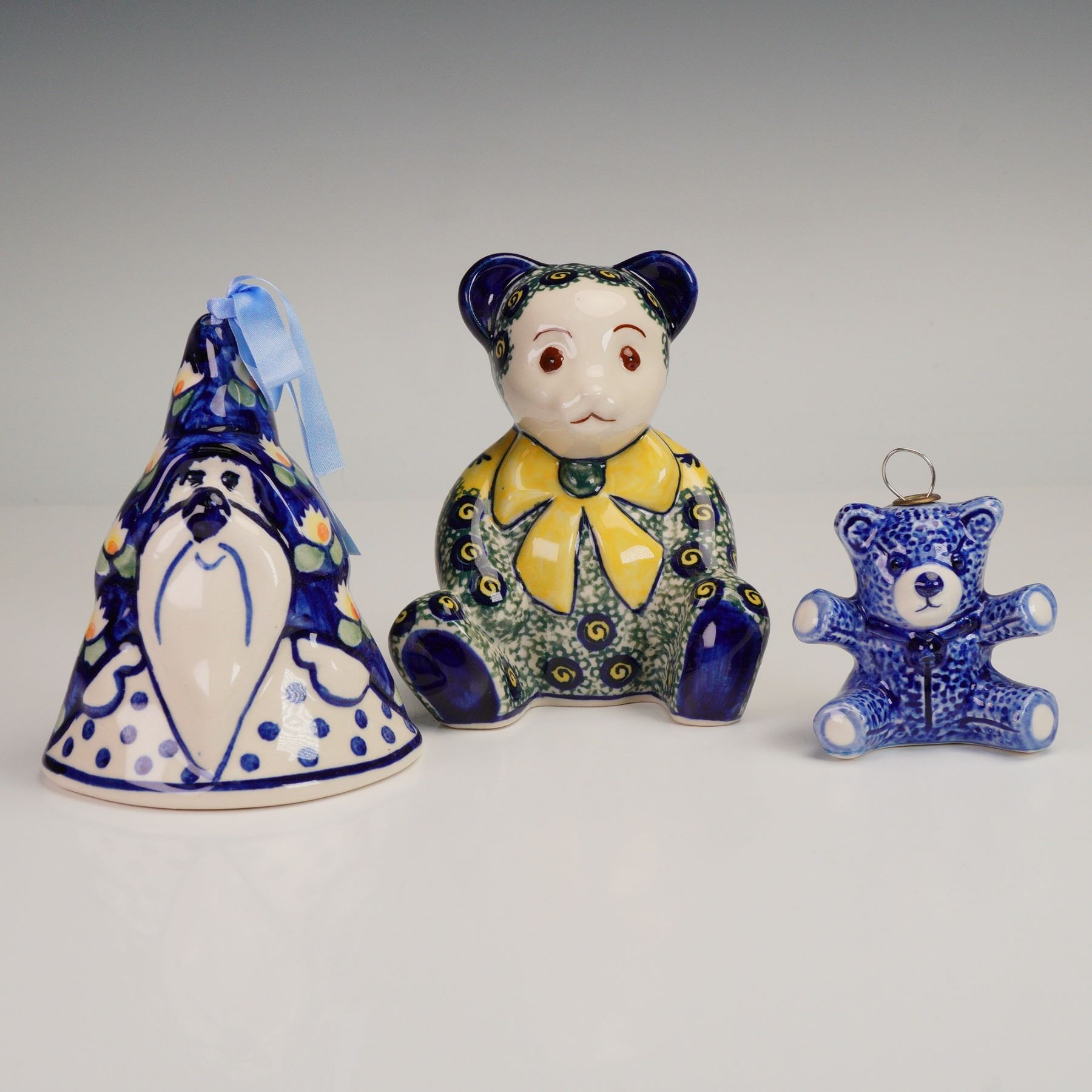 A charming collection of hand-painted ceramic animal figurines, including examples of Polish pottery from Boleslawec and Delft-style crackle-glazed pieces. The grouping features a large bear with yellow bow, small blue teddy, and bonneted rabbit, all marked with Polish pottery stamps to the base, together with a whimsical bell form hound decorated with floral accents and ribbon, and four additional figures comprising a pig, owl, and two rabbits in formal attire, each hand-inscribed and glazed in traditional blue and white tones. Various maker's marks to the undersides as shown.