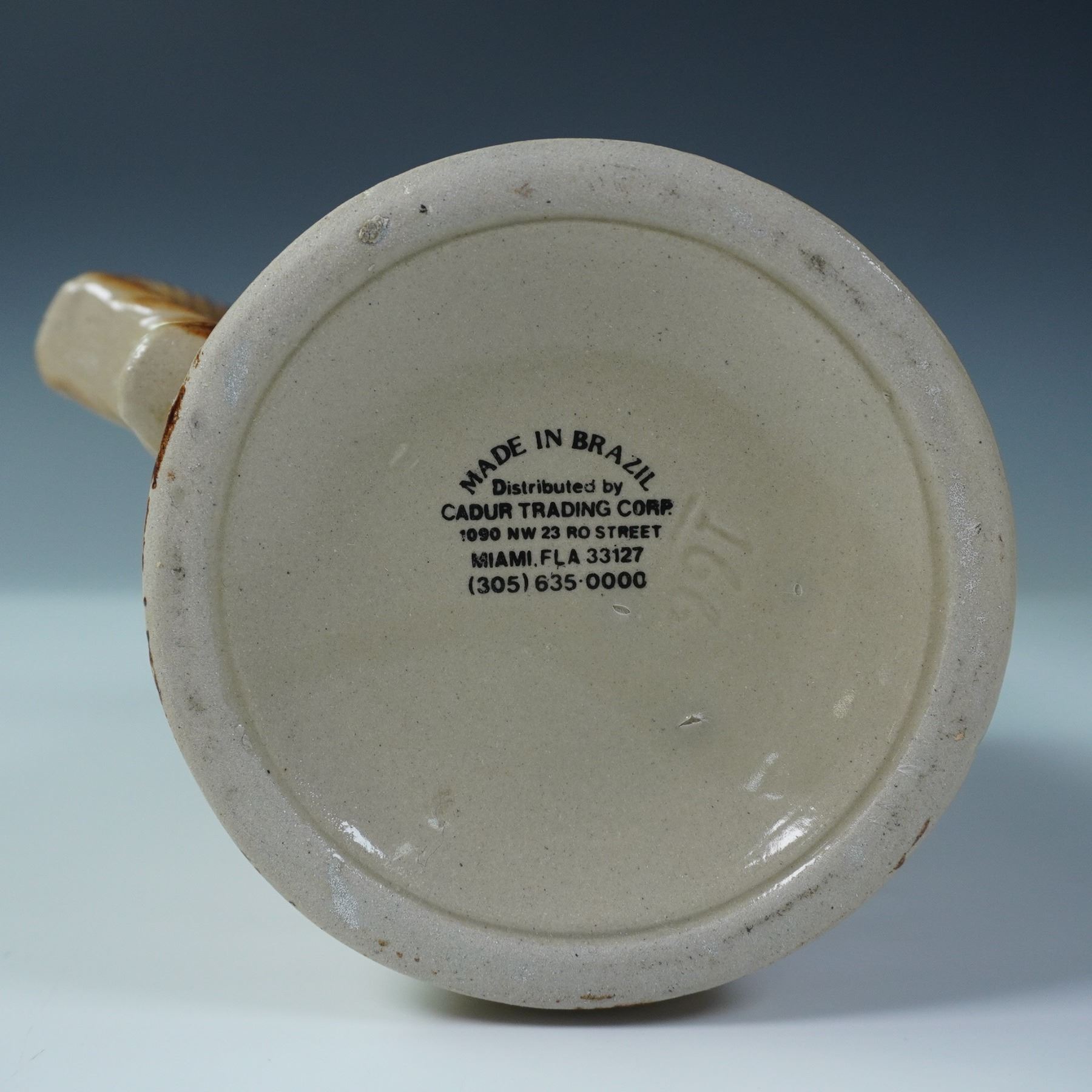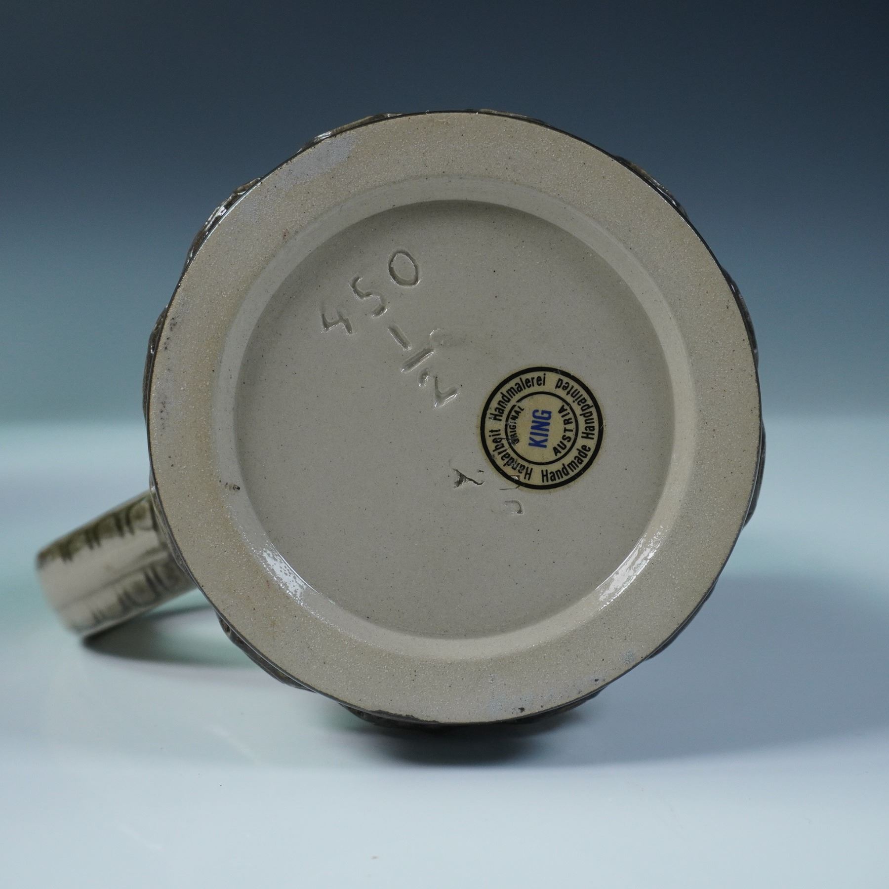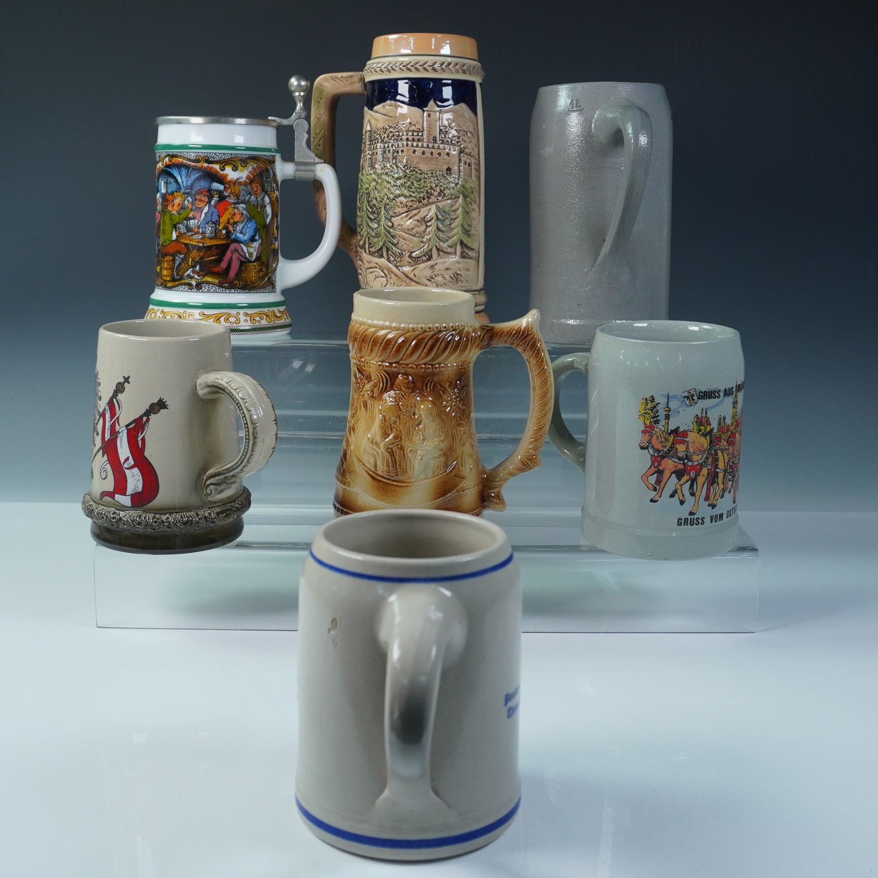 Eclectic group of seven vintage beer steins from various origins, including Germany, Austria, Brazil, and Puerto Rico. This collection showcases a range of styles from hand-painted figural scenes and Oktoberfest motifs to heraldic crests and architectural landmarks. Highlights include a lidded stein marked by KING, Germany; a KMP-marked figural stein; and a stoneware Brauerei Rohrl Ellsbrunn stein. Several pieces feature molded relief decoration and printed text, while others are stamped or labeled with origin marks such as Made in Brazil and Cadur Trading Corp. The set reflects both mass-produced and hand-decorated craftsmanship, ideal for display or themed decor. Largest measures approximately 8.5"H.