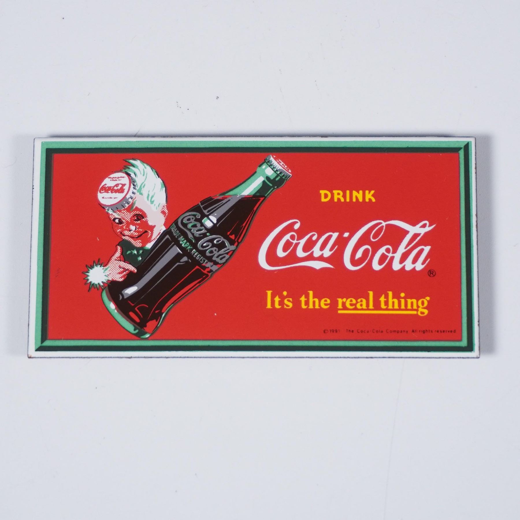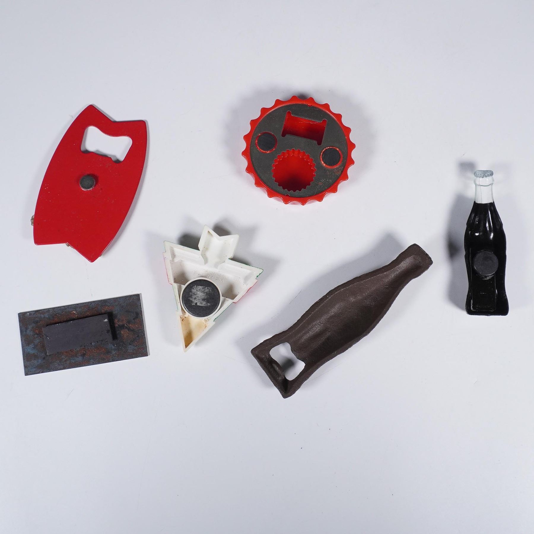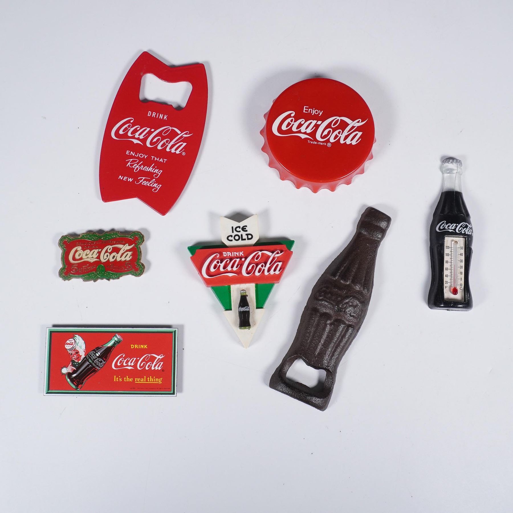 Group of seven Coca Cola-themed novelty magnets featuring vibrant retro branding and various functions. Includes three magnets with integrated bottle openers along with one magnet featuring a working thermometer. The remaining magnets showcase iconic logos and slogans such as It’s the real thing and 5 cents at fountains and in bottles. Mixed materials including plastic, metal, and cast iron. A fun and functional collection for any Coca Cola enthusiast or vintage kitchen decor. Largest magnet measures 5.25"H.