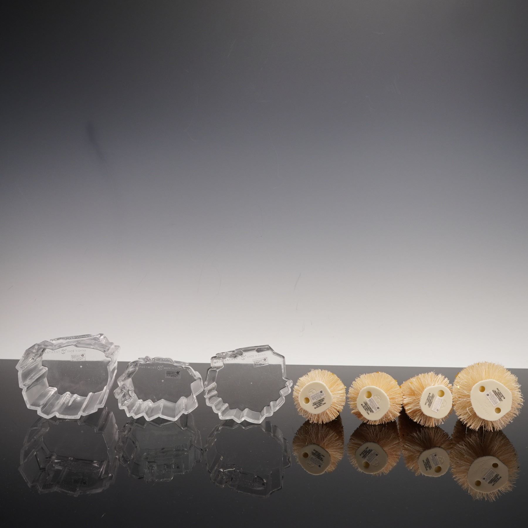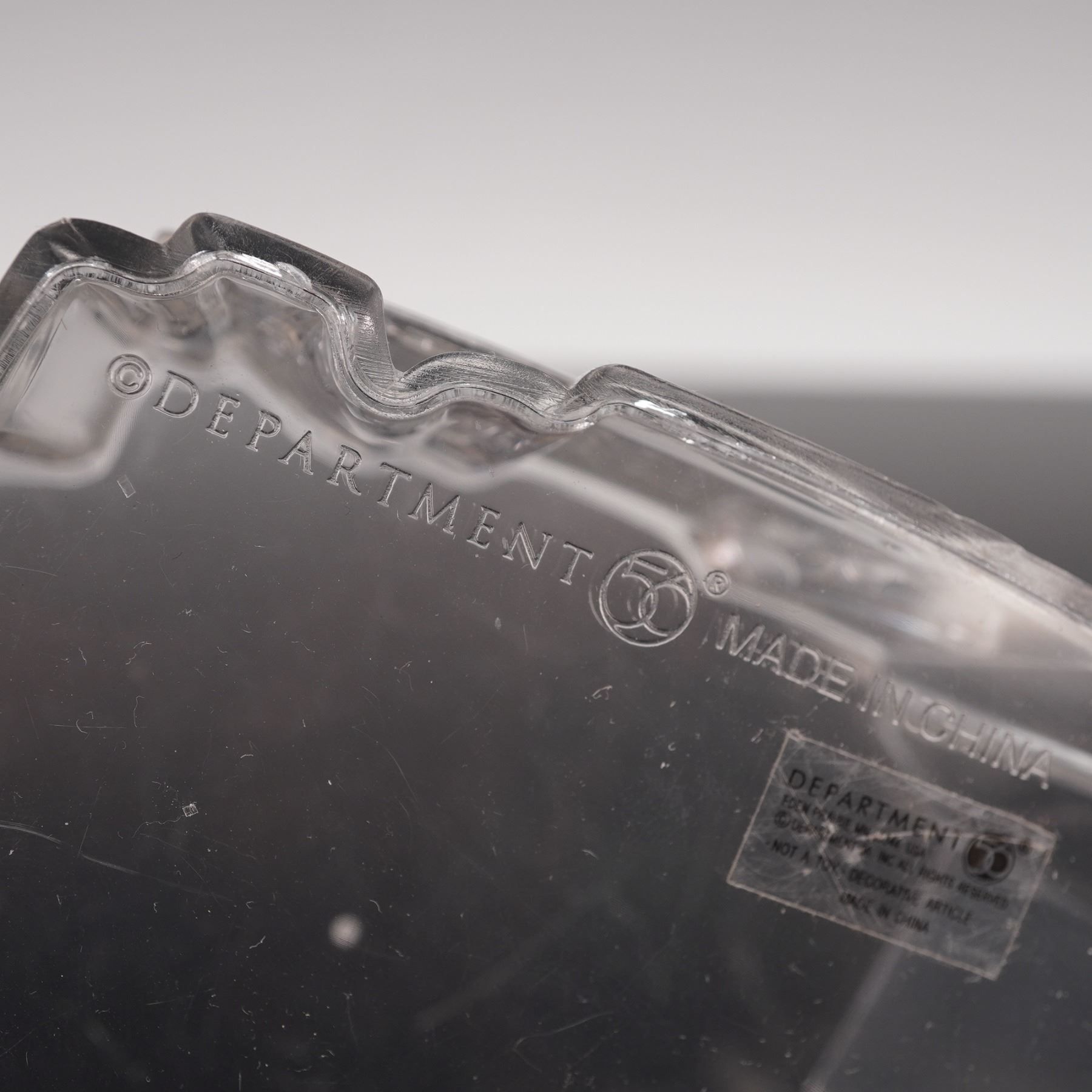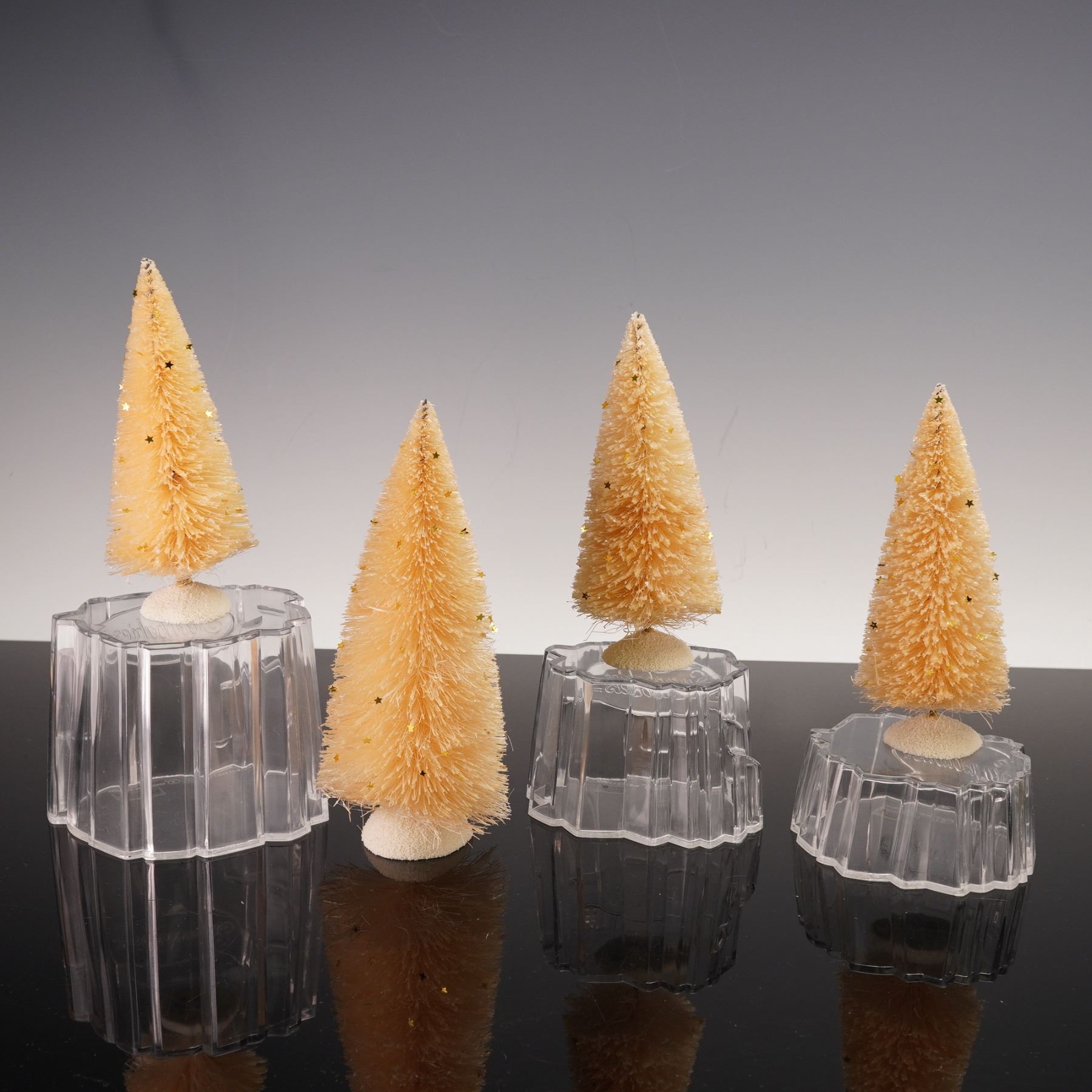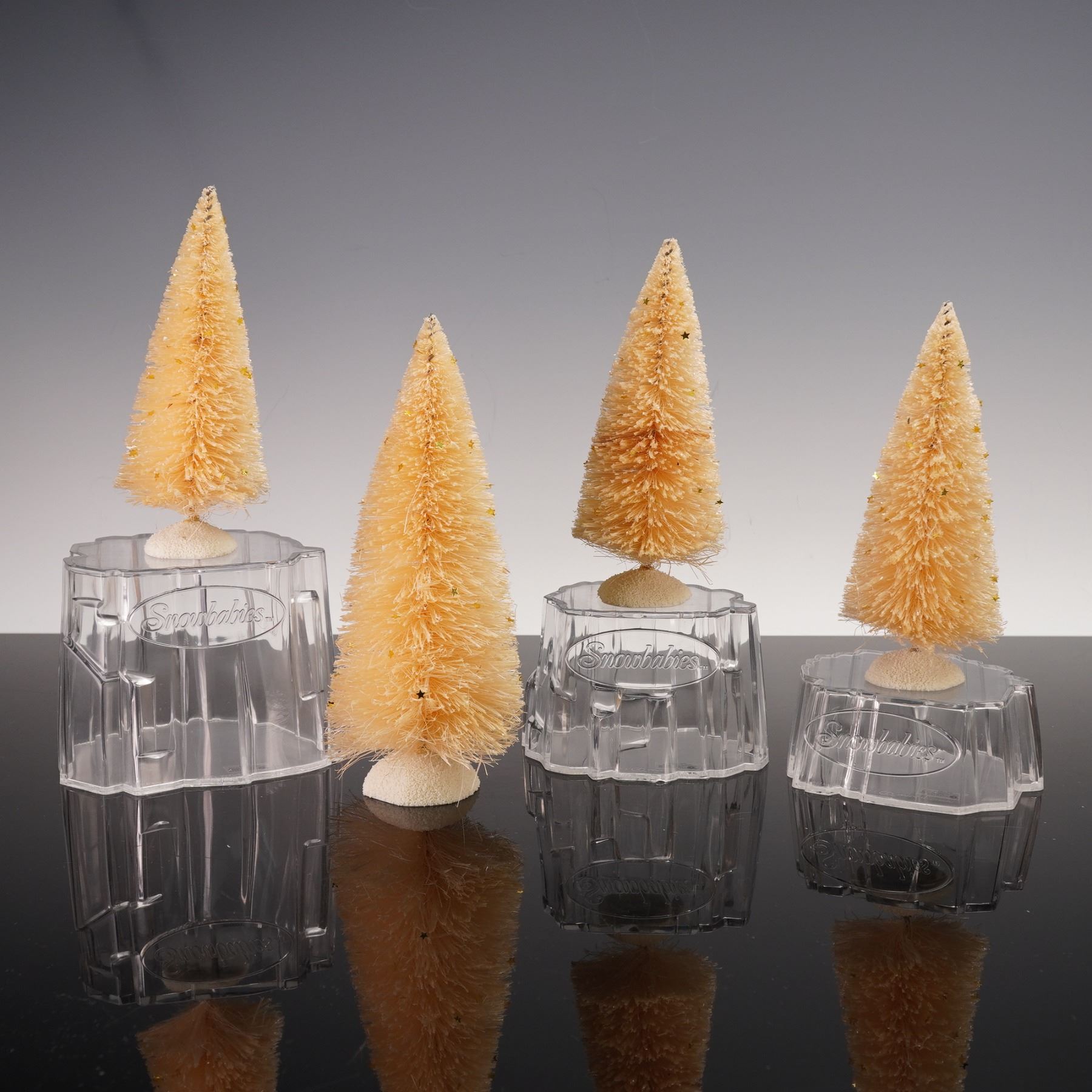 This 7 piece Department 56 Snowbabies Jolly Friends Forevermore Tree Figurine set includes four frosted trees and three clear bases. The trees are soft cream in color with a touch of gold glitter and tiny golden stars that give them a gentle shimmer. The clear textured bases are shaped like ice and feature the Snowbabies logo, creating a cheerful winter scene perfect for holiday displays. Department 56 backstamp. Department 56 manufacturing sticker