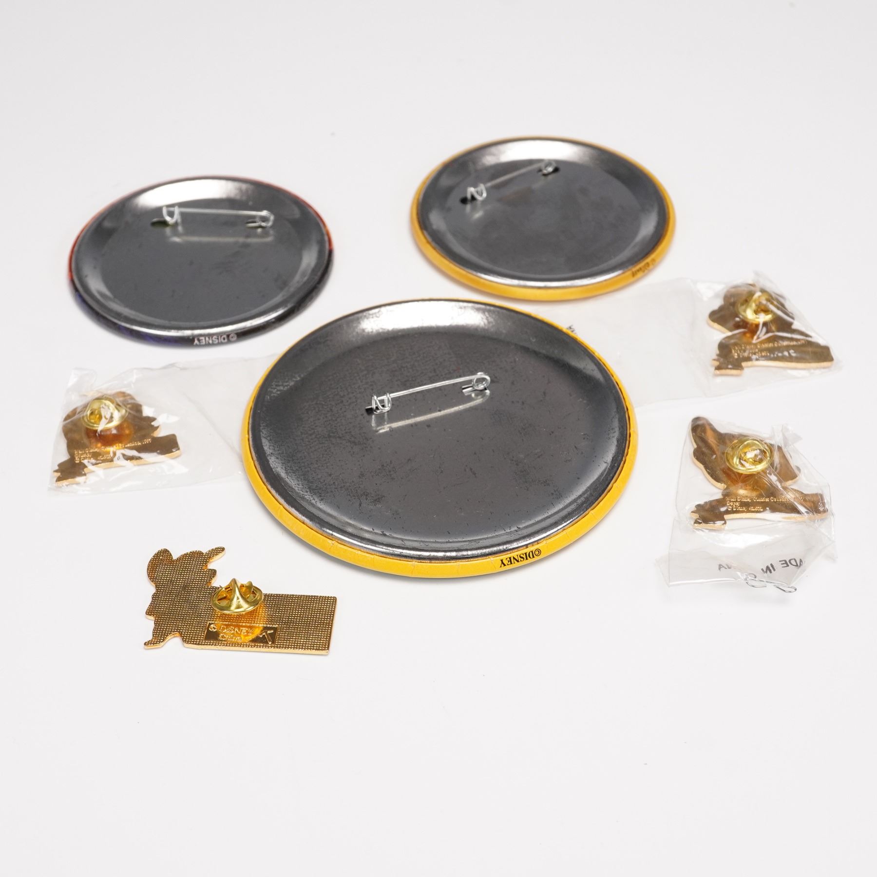 Group of seven Disney collectibles including pin-back buttons and enamel pins. A highlight of this lot is the large 1999 Official Disneyana Convention button from Walt Disney World, featuring Mickey, Minnie, Donald, and Goofy in a safari-themed design. Also included are buttons from Pocahontas and The Lion King, adding representation from two of Disney's most celebrated animated films of the 1990s. Enamel pins feature classic characters such as Snow White, Dopey, and Timothy Mouse, with several retaining their original packaging. Together, this small but vibrant assortment bridges park history, special fan conventions, and enduring character collectibles.