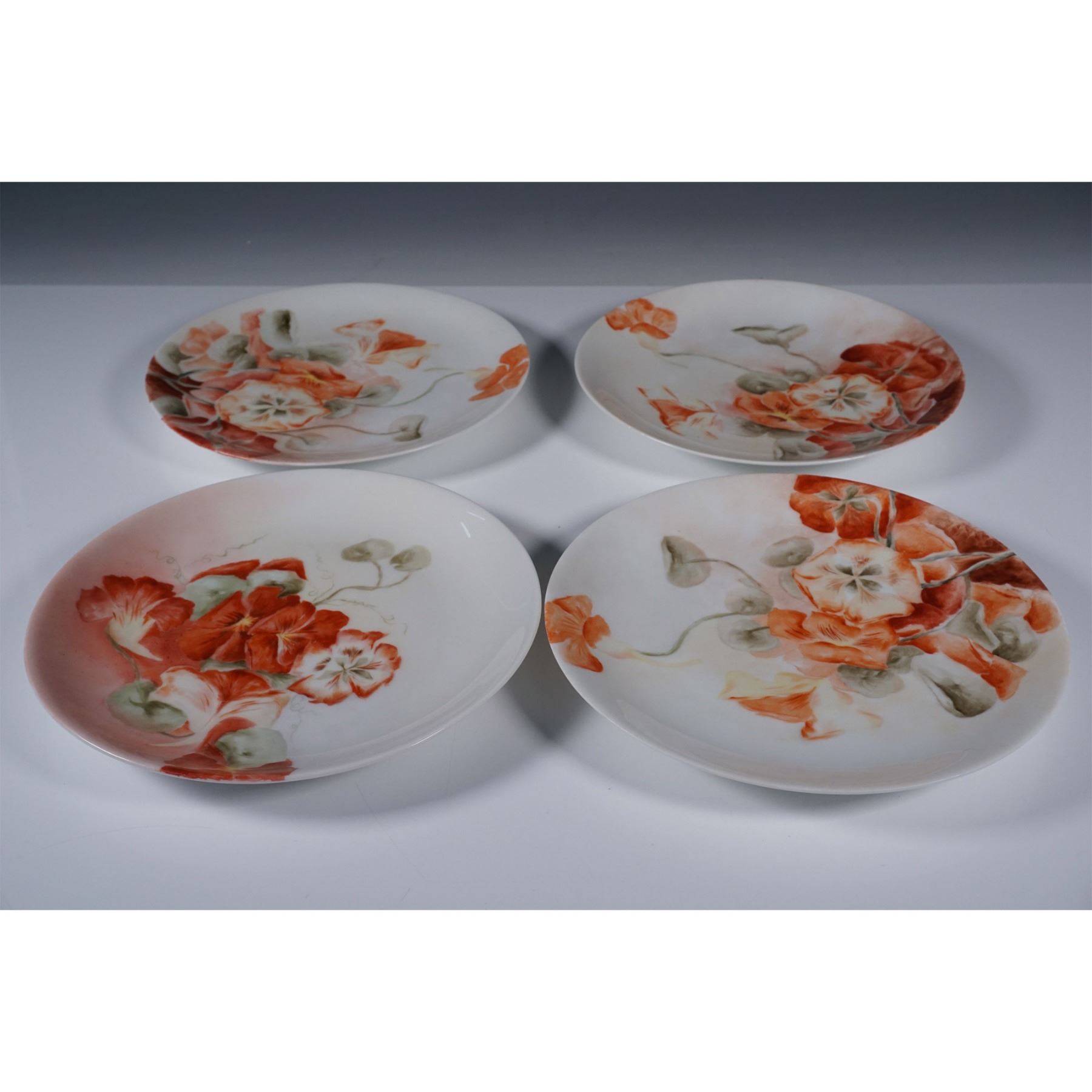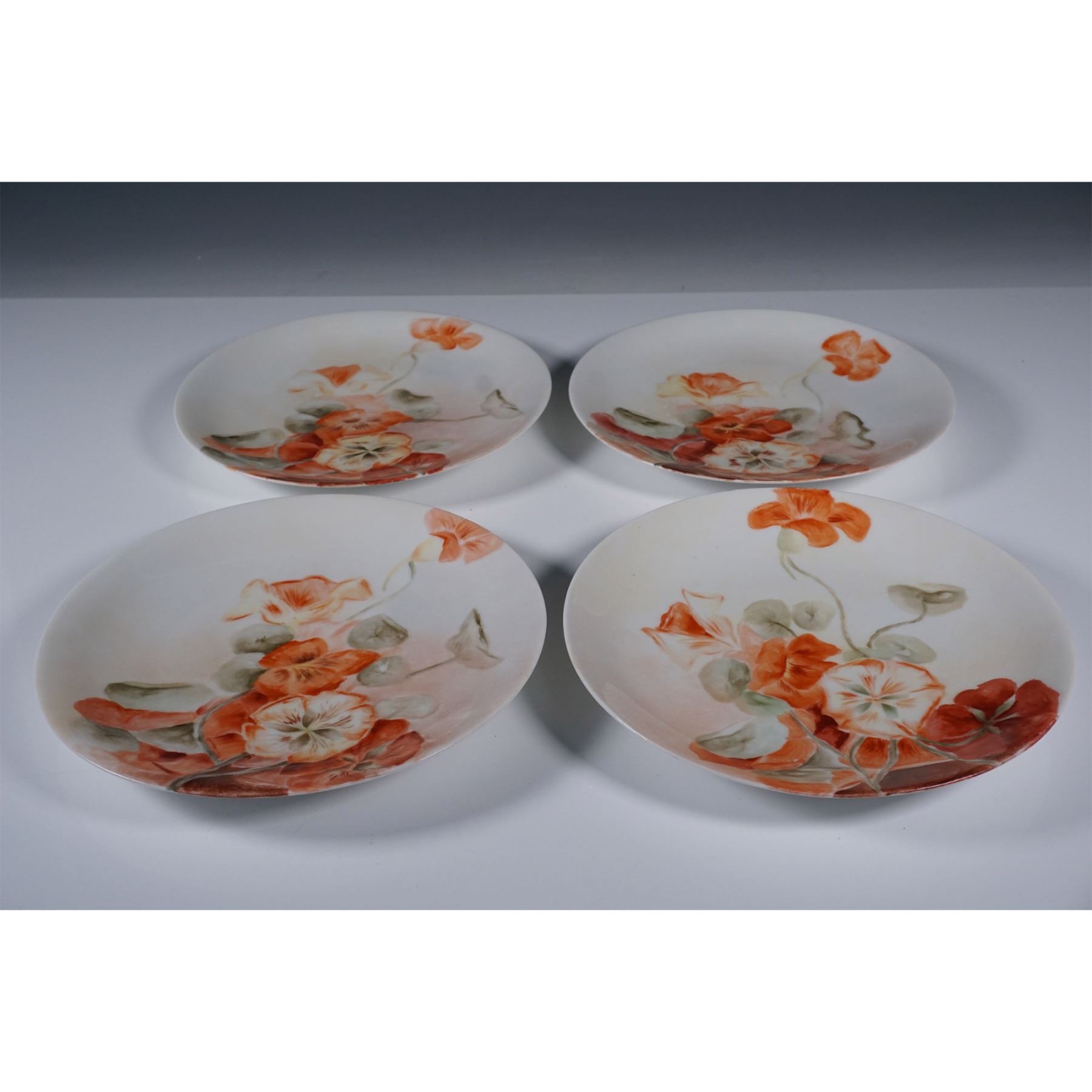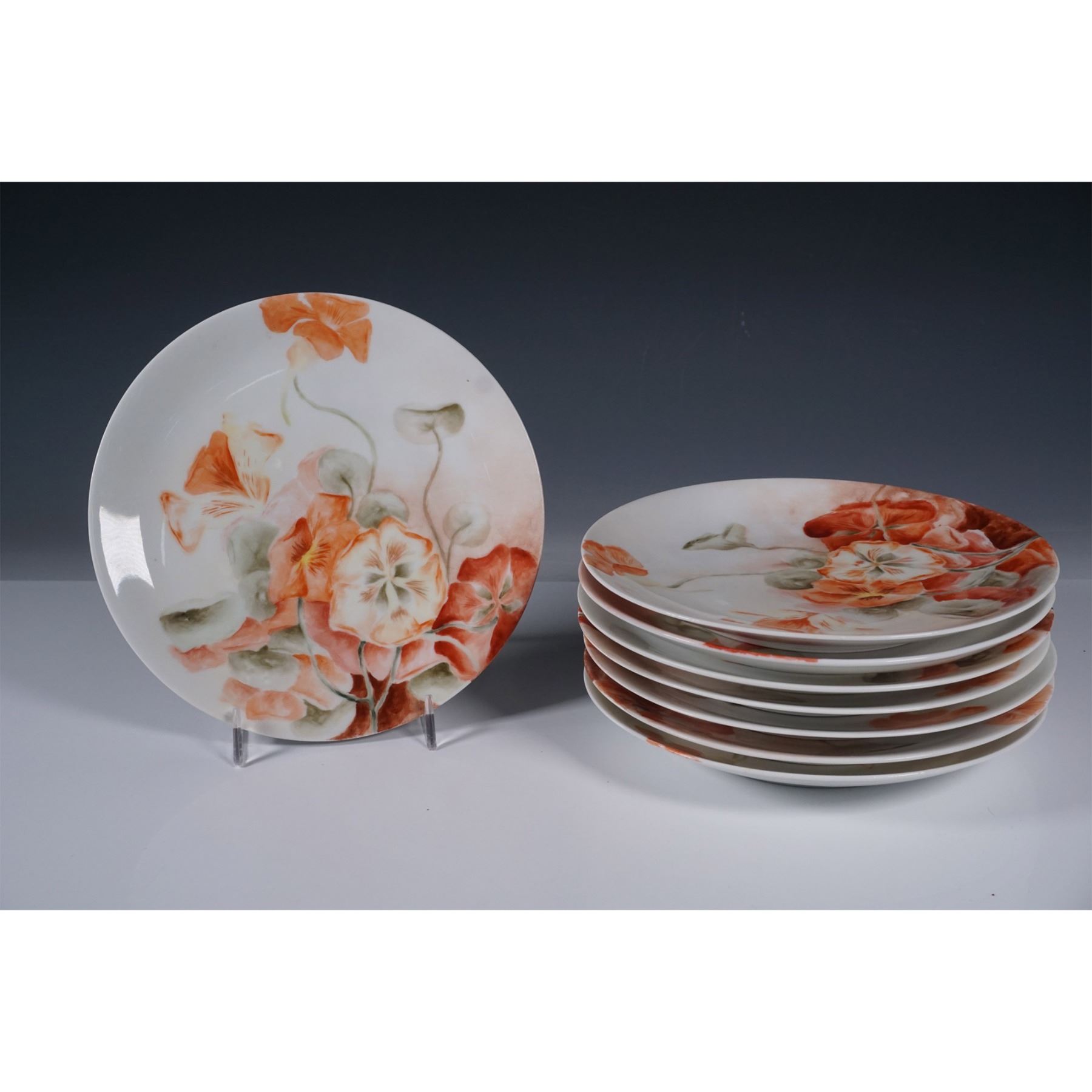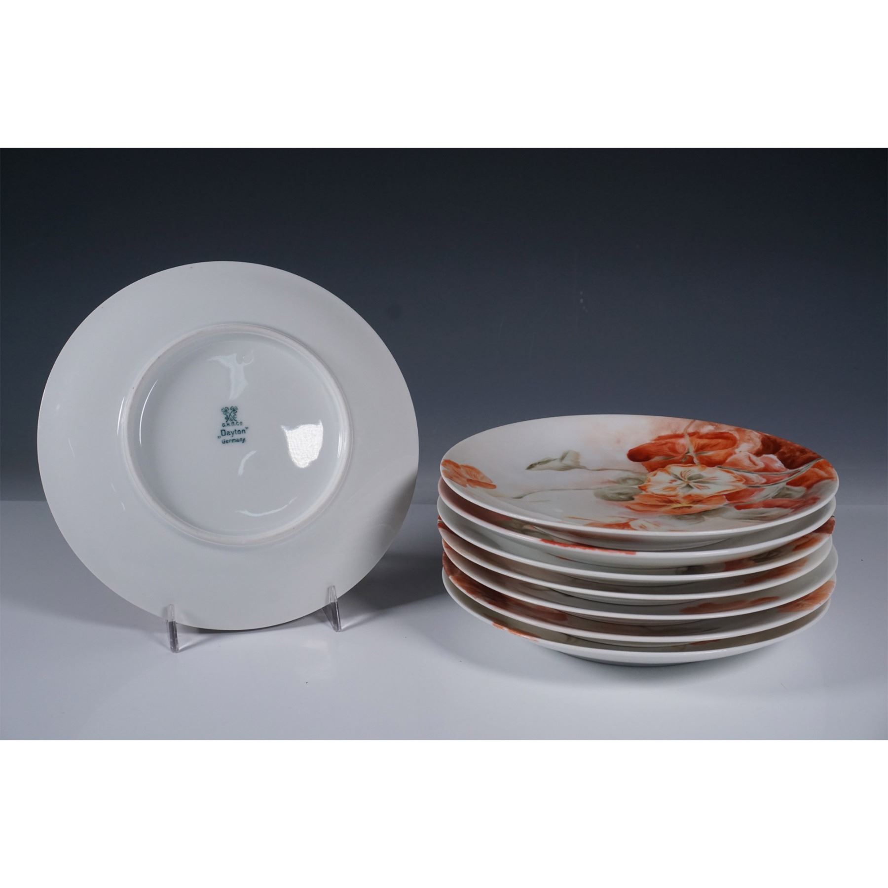 Set of seven German porcelain plates featuring a hand-painted floral design in warm orange and green tones. Six plates are marked Jaeger & Co., while one is marked Hutschenreuther Selb, both renowned for their high-quality porcelain craftsmanship. Each plate showcases delicate detailing with a soft, naturalistic composition. The backstamps indicate their origin and fine artistry. A beautiful addition to any porcelain collection or table setting.