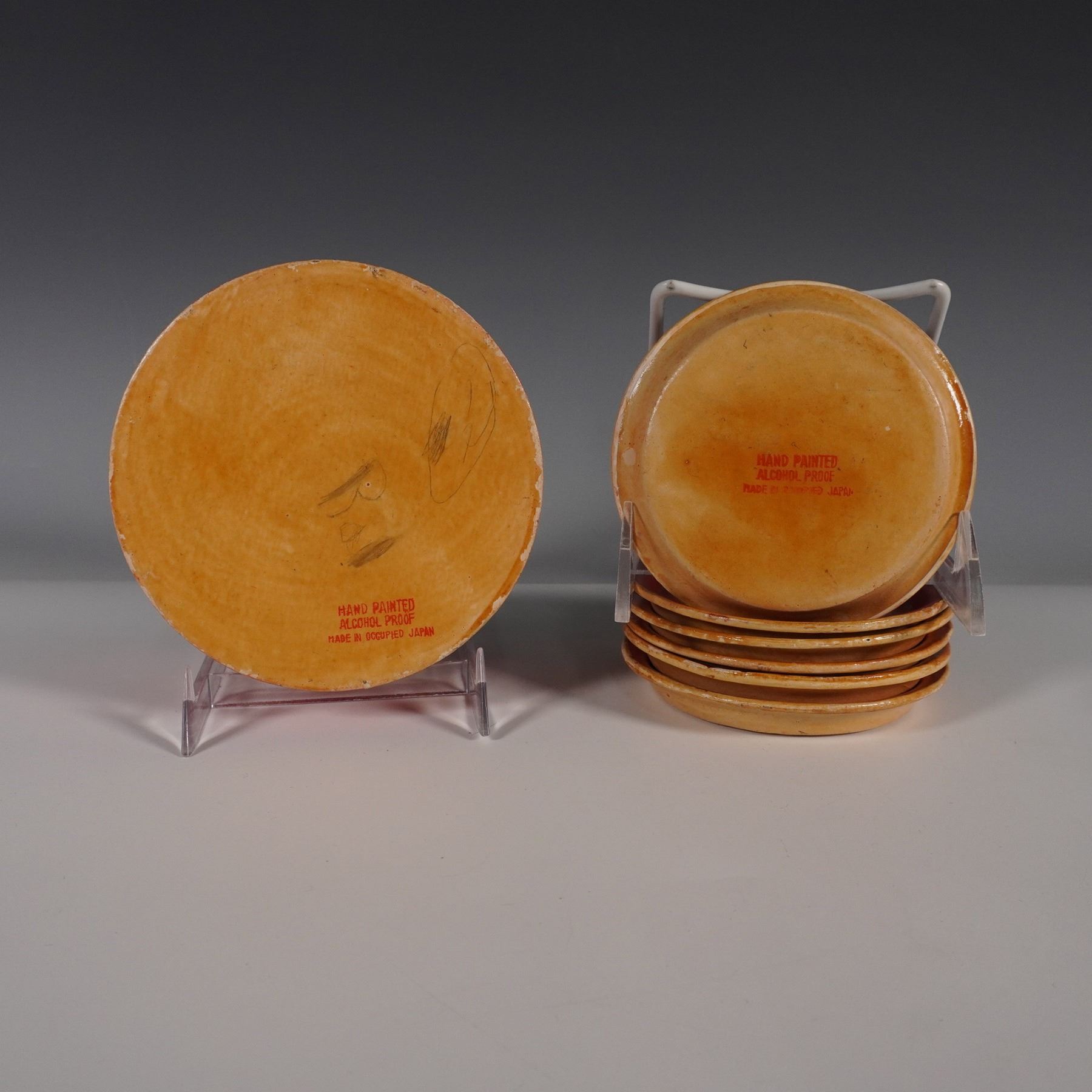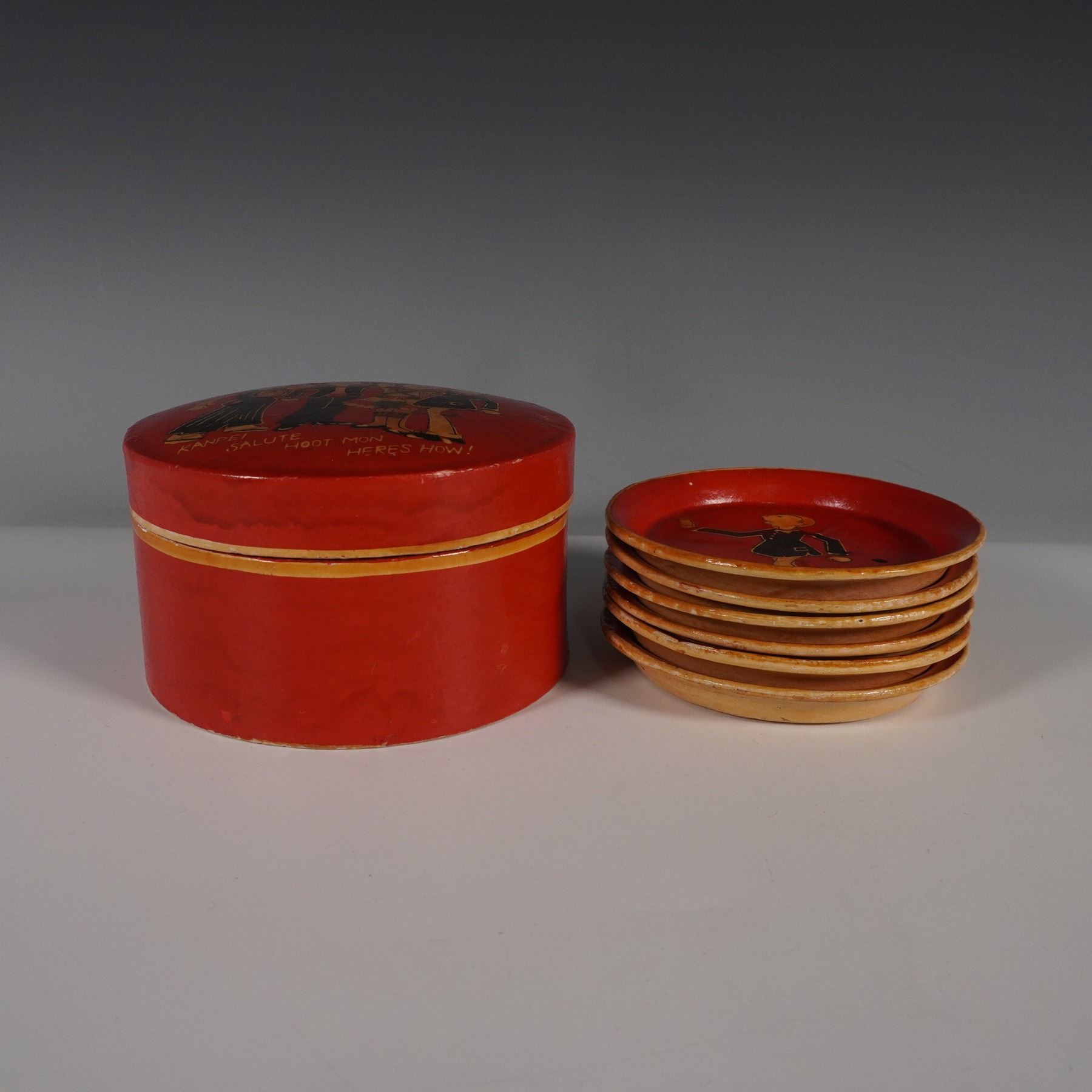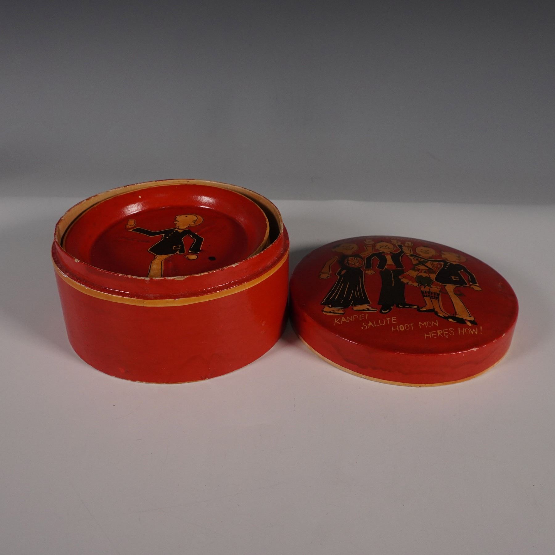 Vintage hand-painted coaster set from Occupied Japan, featuring six coasters and a matching lidded storage box. Each coaster is adorned with whimsical illustrations of figures in traditional attire, raising a toast with international drinking salutations such as "Kanpei," "Salute," "Hoot Mon," and "Here's How!" The underside of each coaster is marked, Hand Painted Alcohol Proof Made in Occupied Japan.