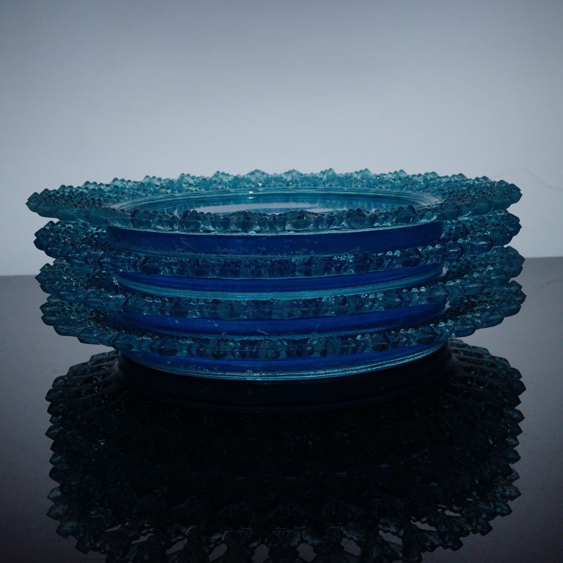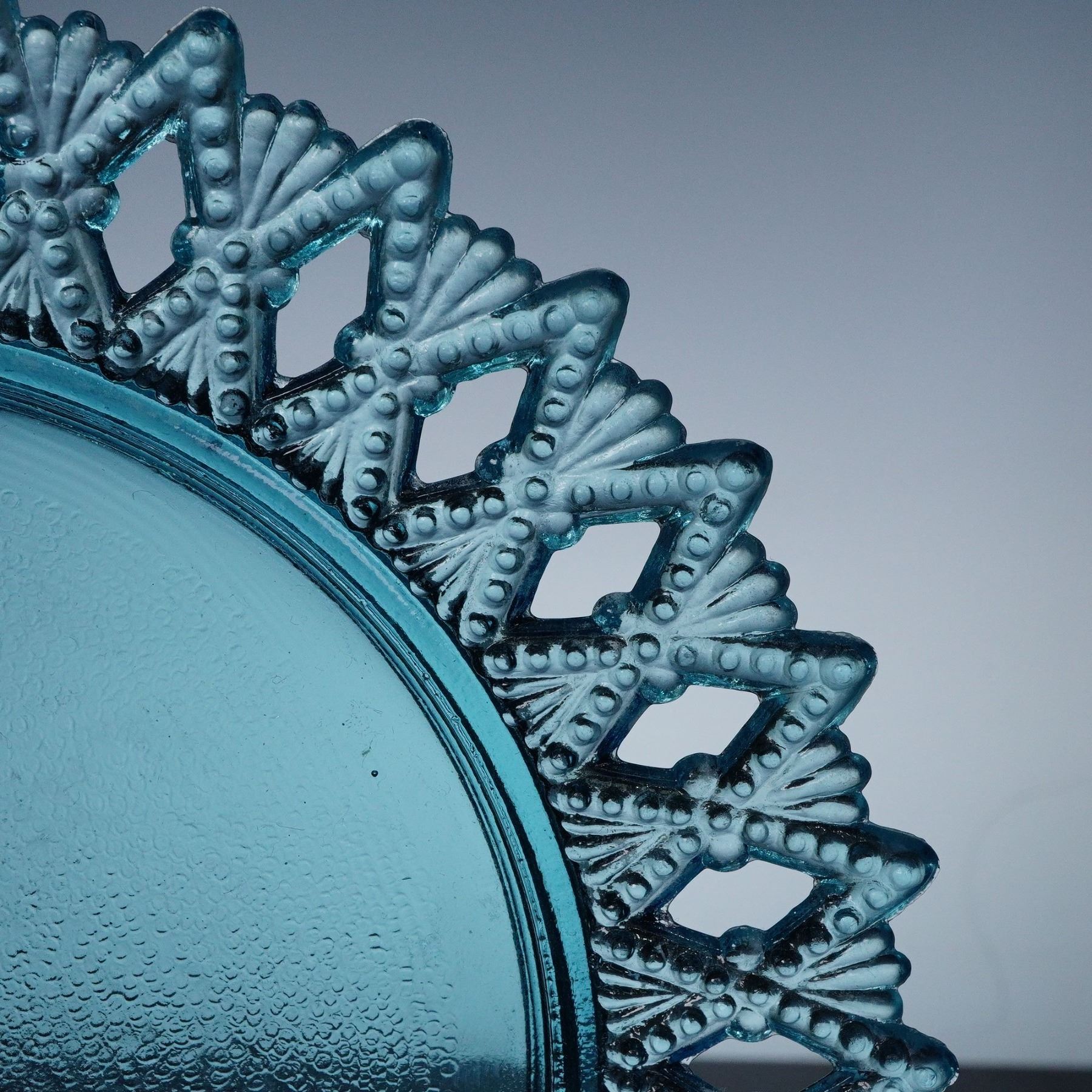 Beautiful set of seven pressed glass plates in vibrant aqua blue, produced by Kemple Wheaton Glass. Each plate features an intricate open lace or "reticulated" rim with shell and fan motifs surrounding a finely textured center. The design combines early American pattern glass charm with mid-century color vibrancy, making this a striking display or serving set for collectors and entertainers alike. The underside of each piece is marked KW, denoting Kemple Wheaton's craftsmanship in decorative glassmaking.