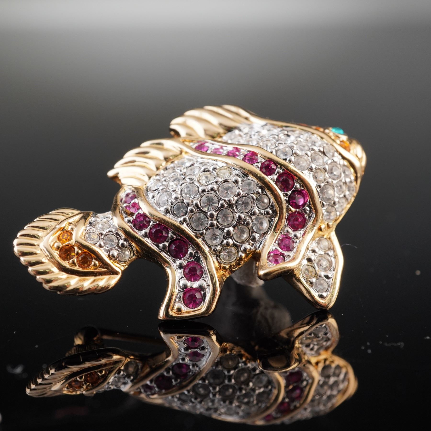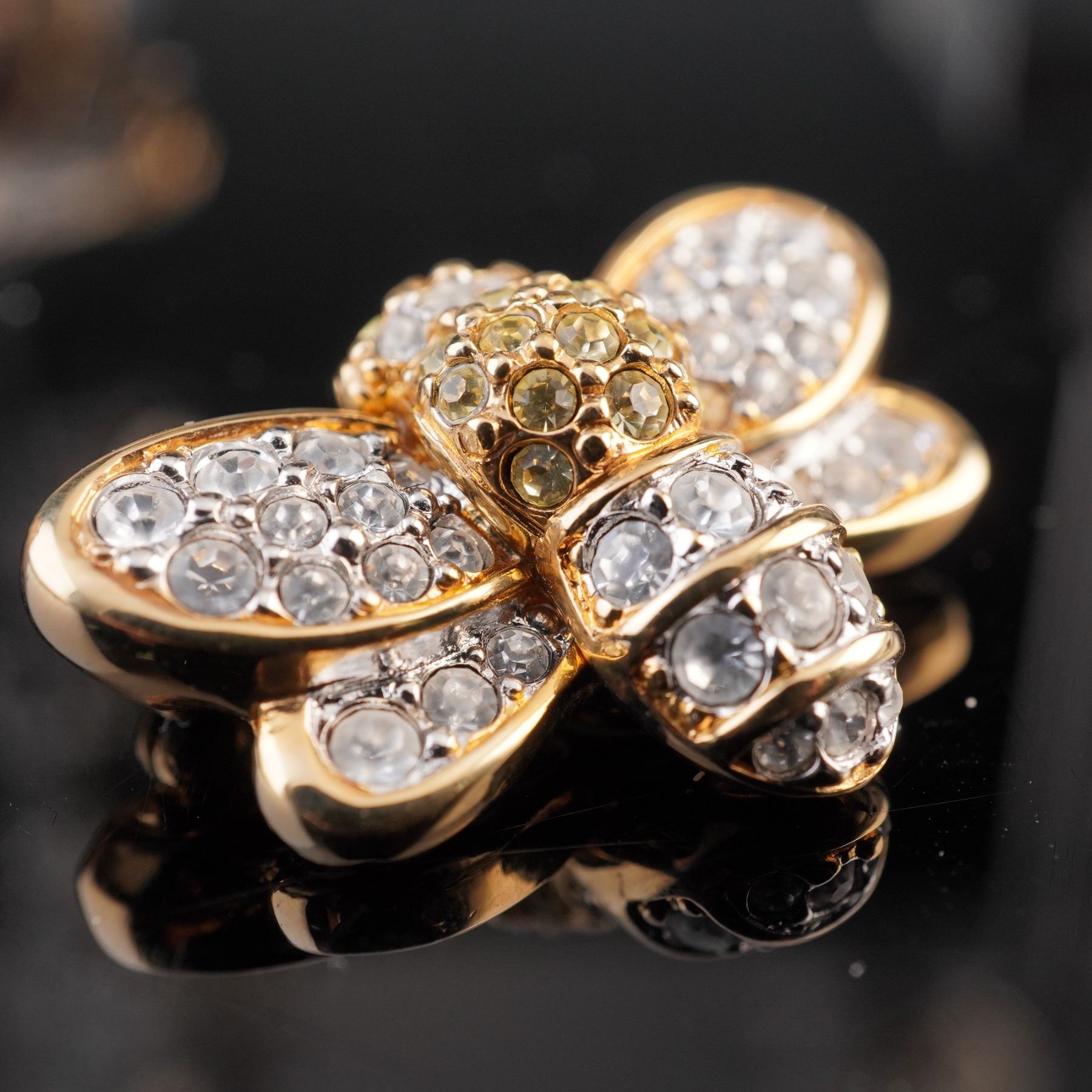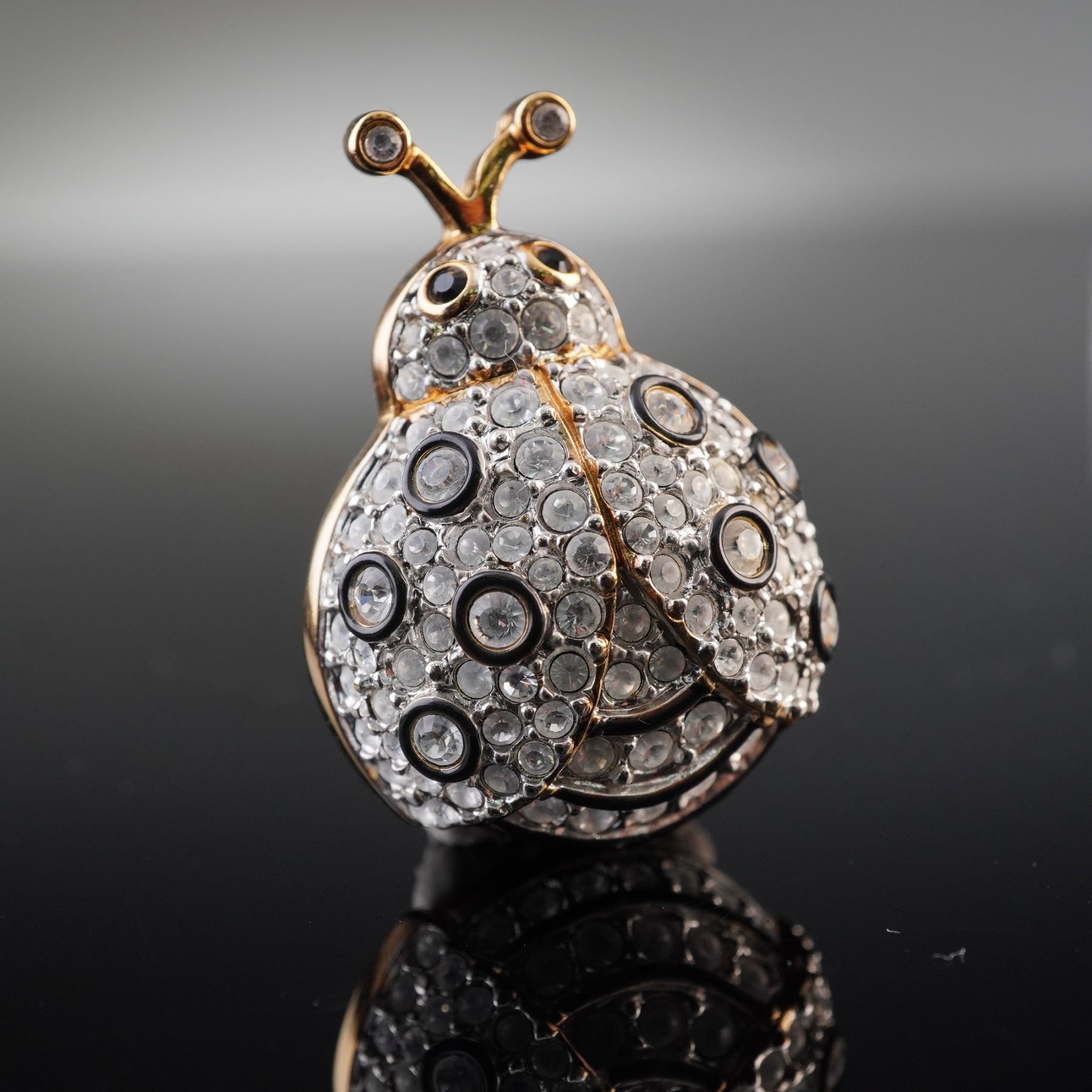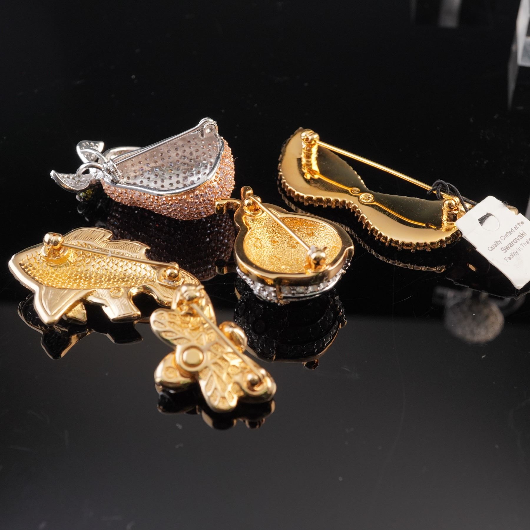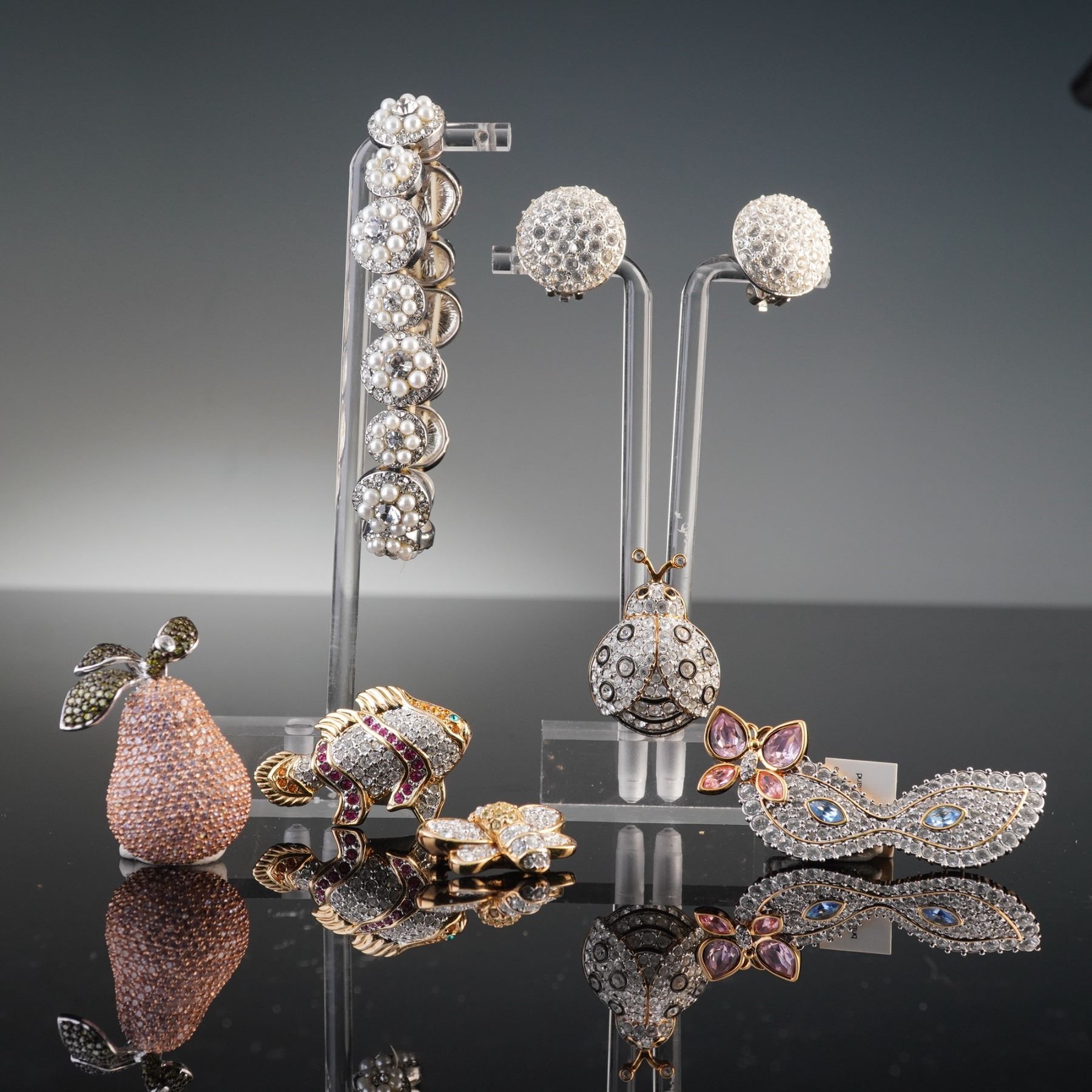 Group includes a bracelet, one pair of earrings, and five brooches, totaling eight pieces. The gold-toned brooches are marked Swarovski and feature figural motifs including bee, fish, ladybug, and mask designs. The silver-toned pear-form brooch is marked 925. The bracelet is composed of circular links accented with simulated pearls and rhinestones, accompanied by domed rhinestone clip earrings.