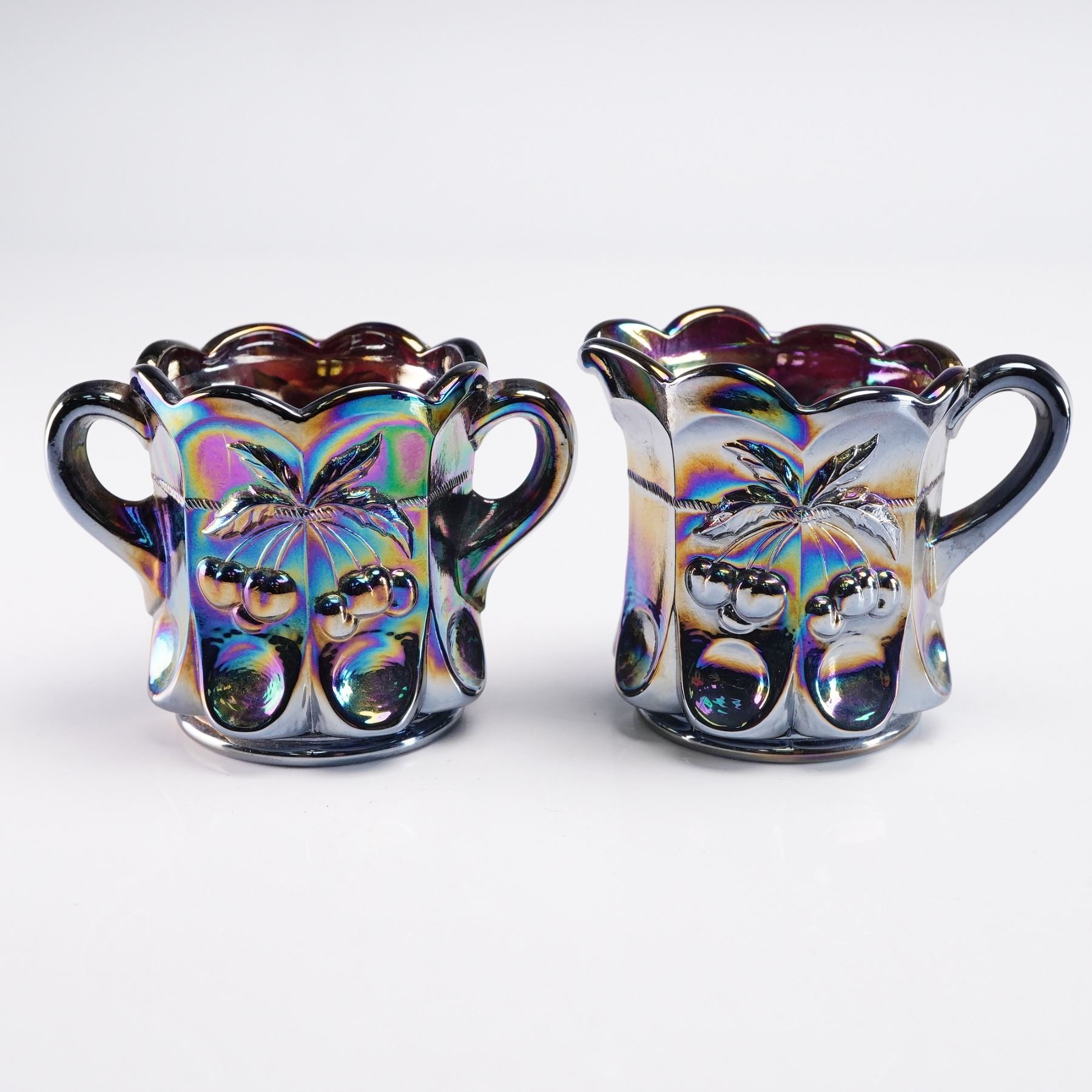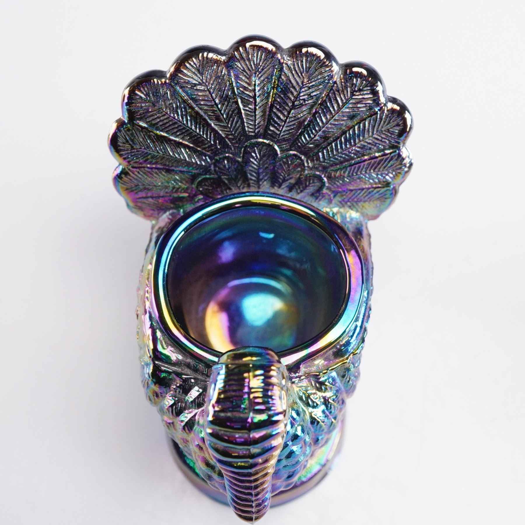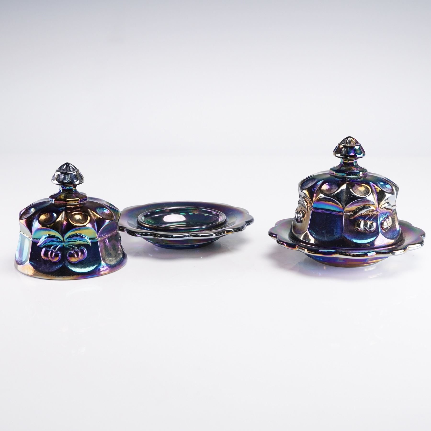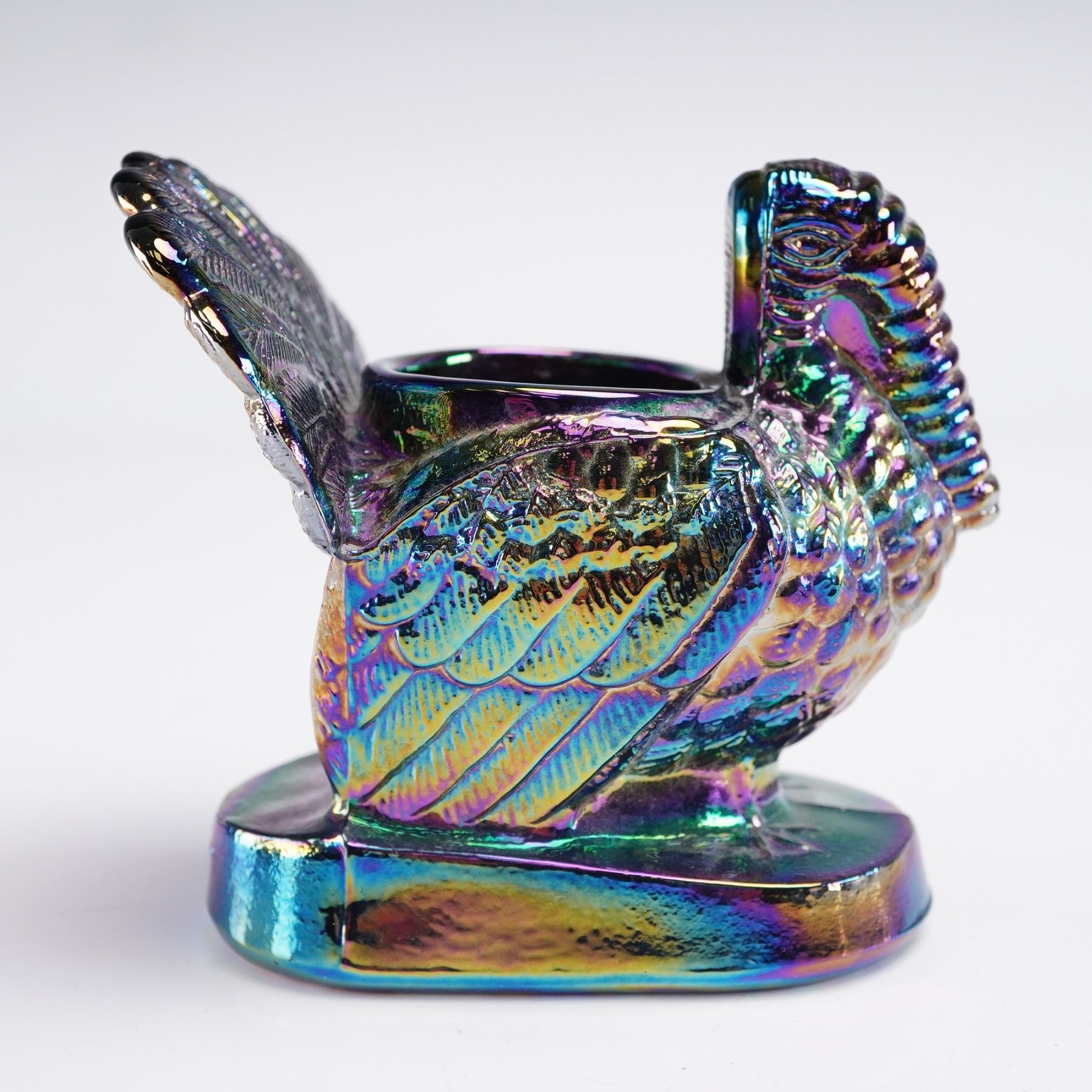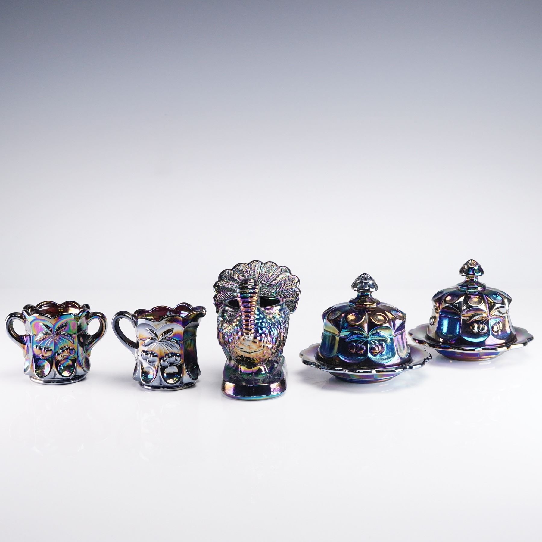 Set of Mosser carnival glass in a vivid iridescent finish. Includes a rare turkey shaped toothpick holder, two small handled cups with a floral motif, and two covered butter dishes with matching scalloped plates. Each piece displays brilliant luster with rich multi-color highlights and starburst patterns on the base. A striking ensemble for collectors of carnival glass. Largest piece measures 3.5"L x 2.5"W x 3.25"H.