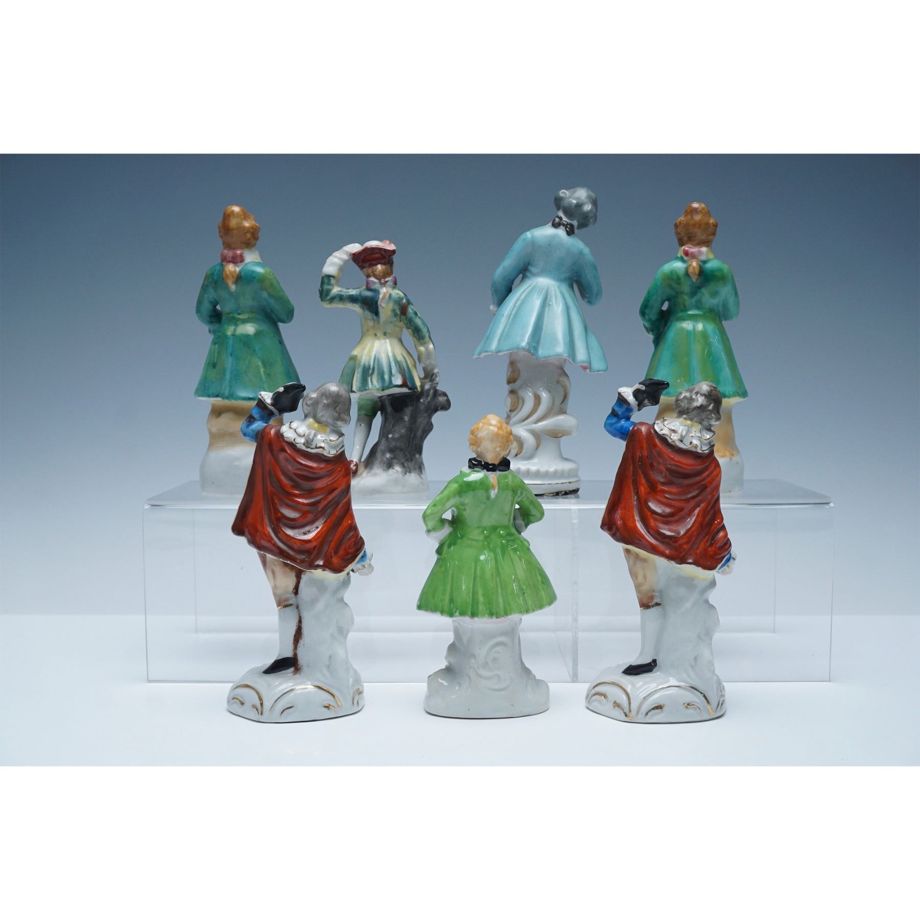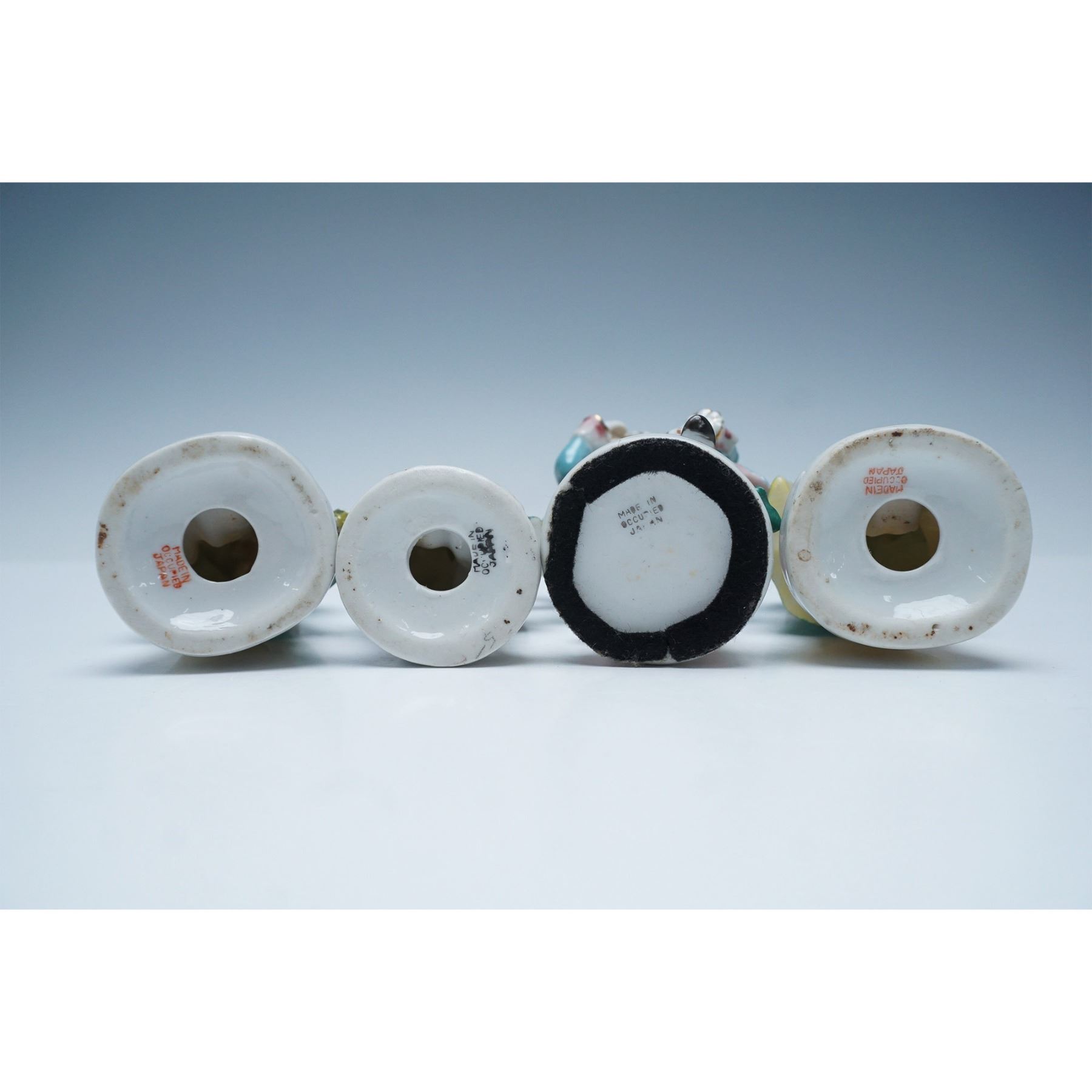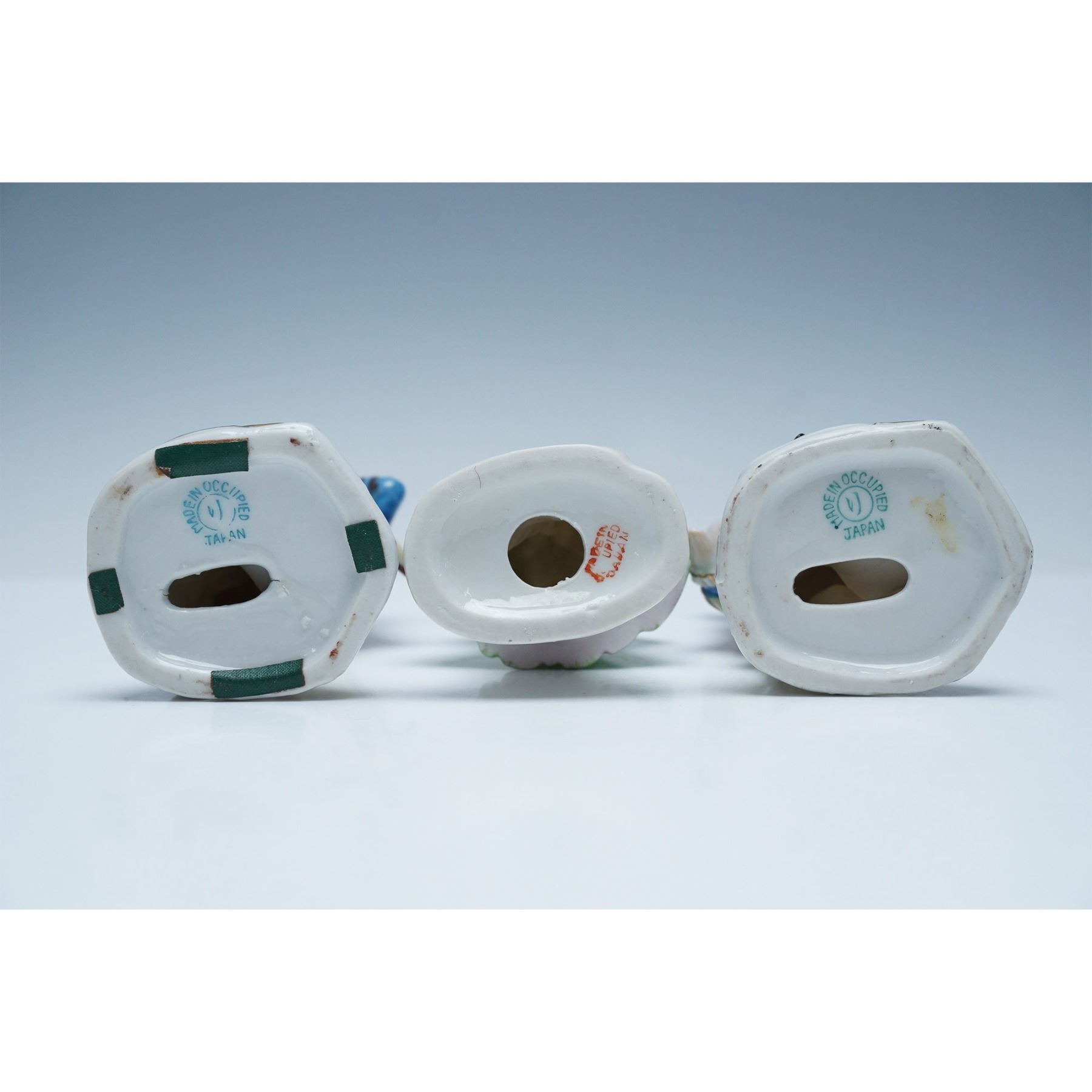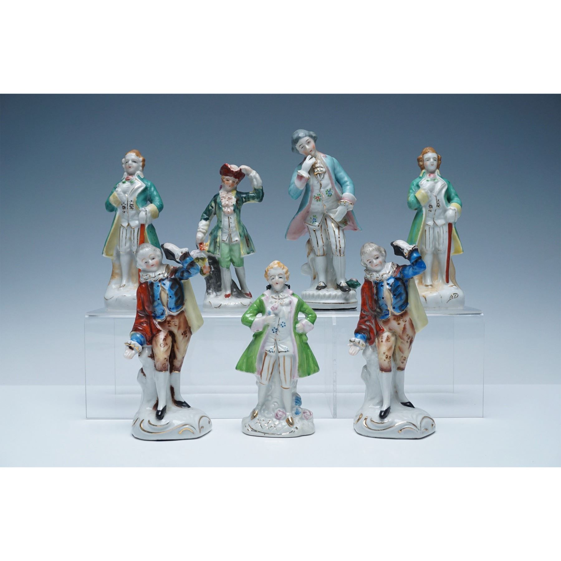 A set of seven hand-painted porcelain figurines, all marked "Made in Occupied Japan," featuring elegantly dressed 18th-century-style gentlemen. Each figure is adorned in period attire, including waistcoats, breeches, frock coats, and tricorn hats, with intricate detailing and gilded accents. The set showcases vibrant color palettes, including soft pastels and rich jewel tones, reflecting the craftsmanship of mid-century Japanese porcelain production (1945-1952). A fine collection for collectors of vintage Japanese porcelain or lovers of Rococo-inspired decor. Figurines range in size from 6" to 8"H.