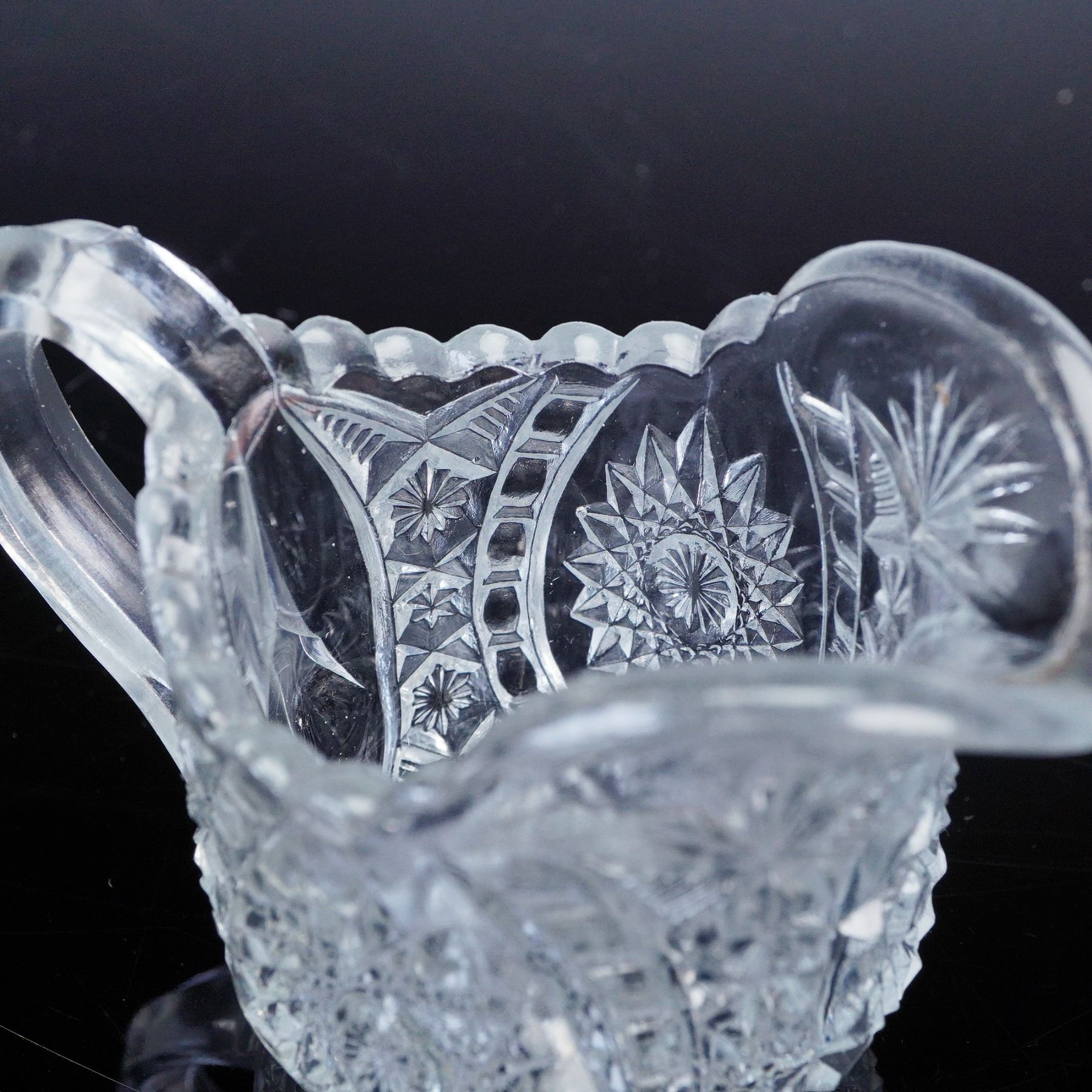This 7-piece pressed glass set includes a pair of elegant mantle lusters adorned with faceted spear prisms and scalloped rims, crafted in a classic Victorian-style design with fluted columns and fine pressed details. The accompanying covered sugar bowl, creamer, and butter dish with dome lid and matching plate all feature intricate sawtooth edges and deep cut-style pressed starbursts, fans, and geometric patterns reminiscent of Early American Pattern Glass (EAPG). Measures up to 8"H.