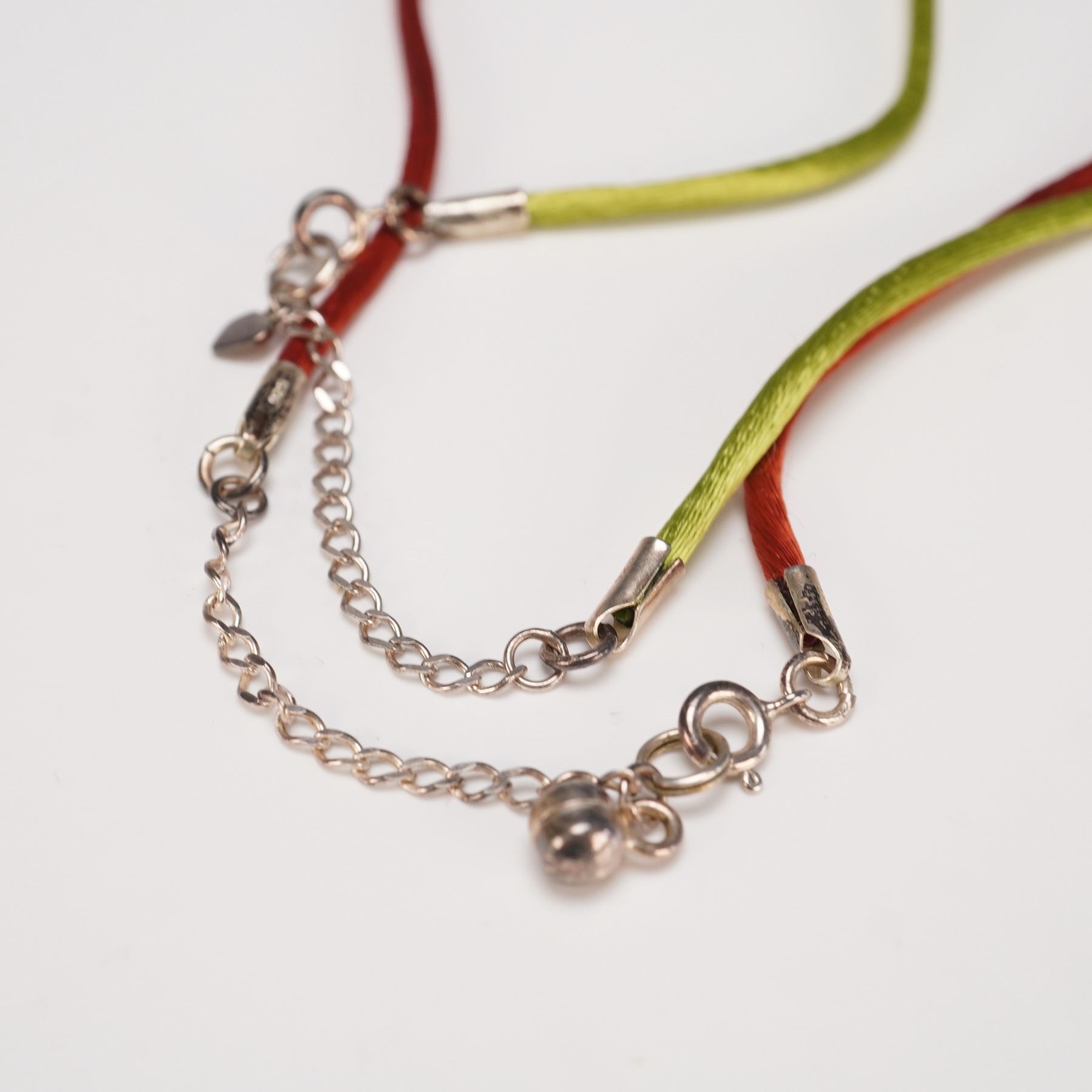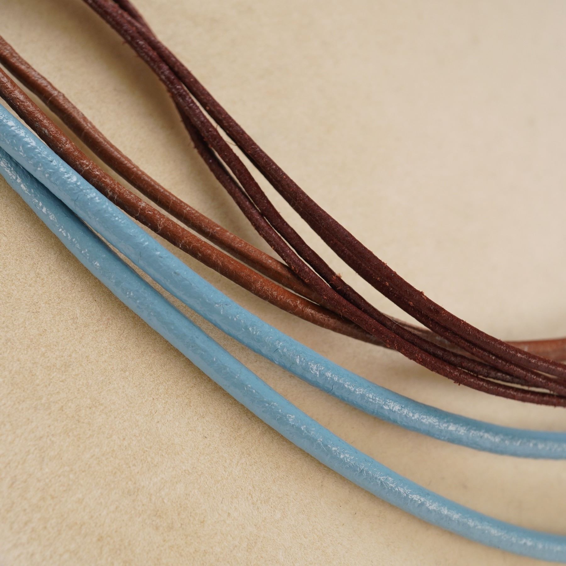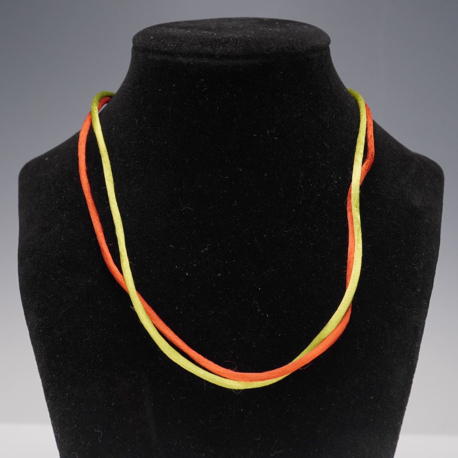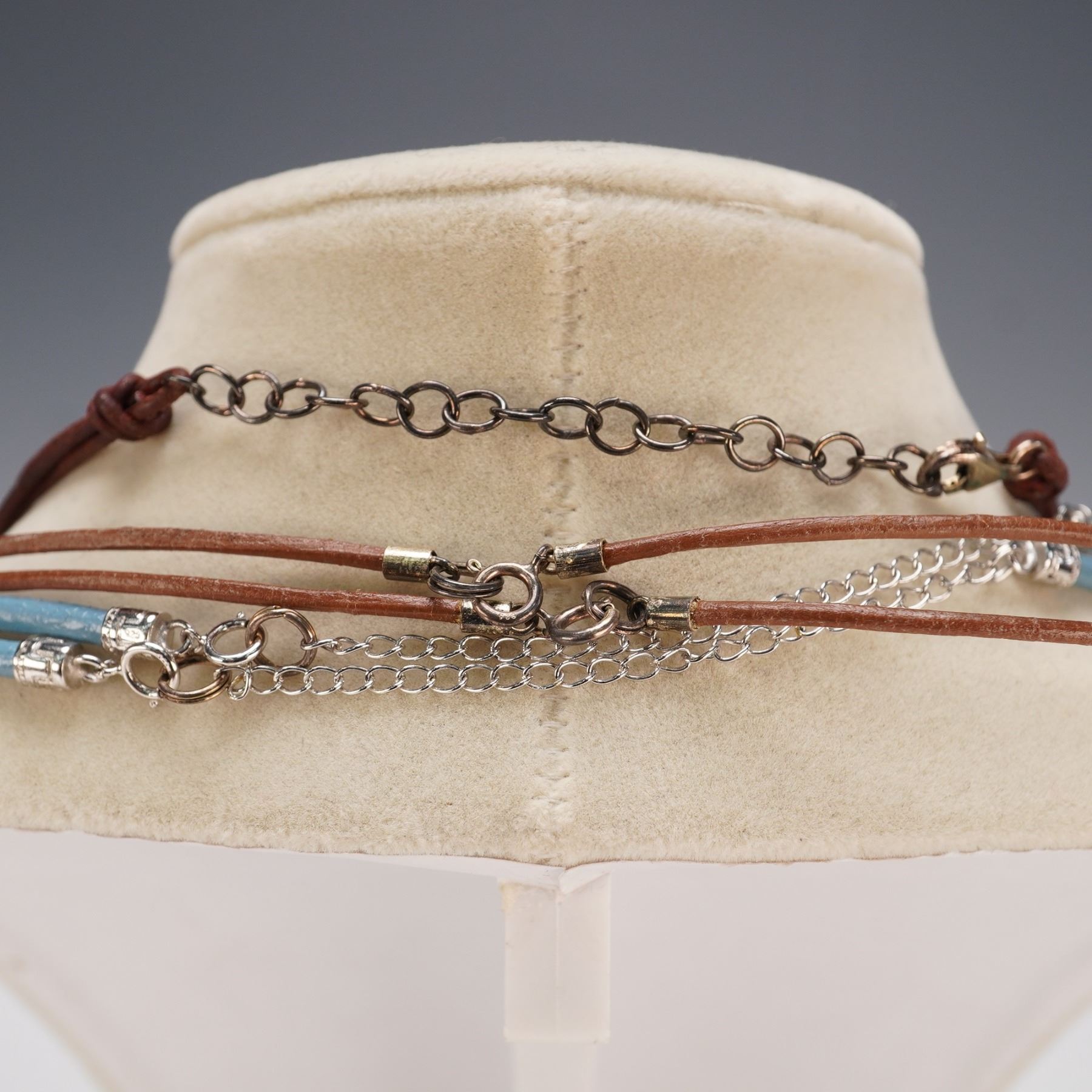 This grouping features two silk necklaces and five leather necklaces, offering a vibrant mix of textures and colors. The longest necklace in the set measures 18"L clasp to clasp. The colors and design variations provide an interesting range of wearable options. Length of longest necklace is 18"L clasp to clasp.