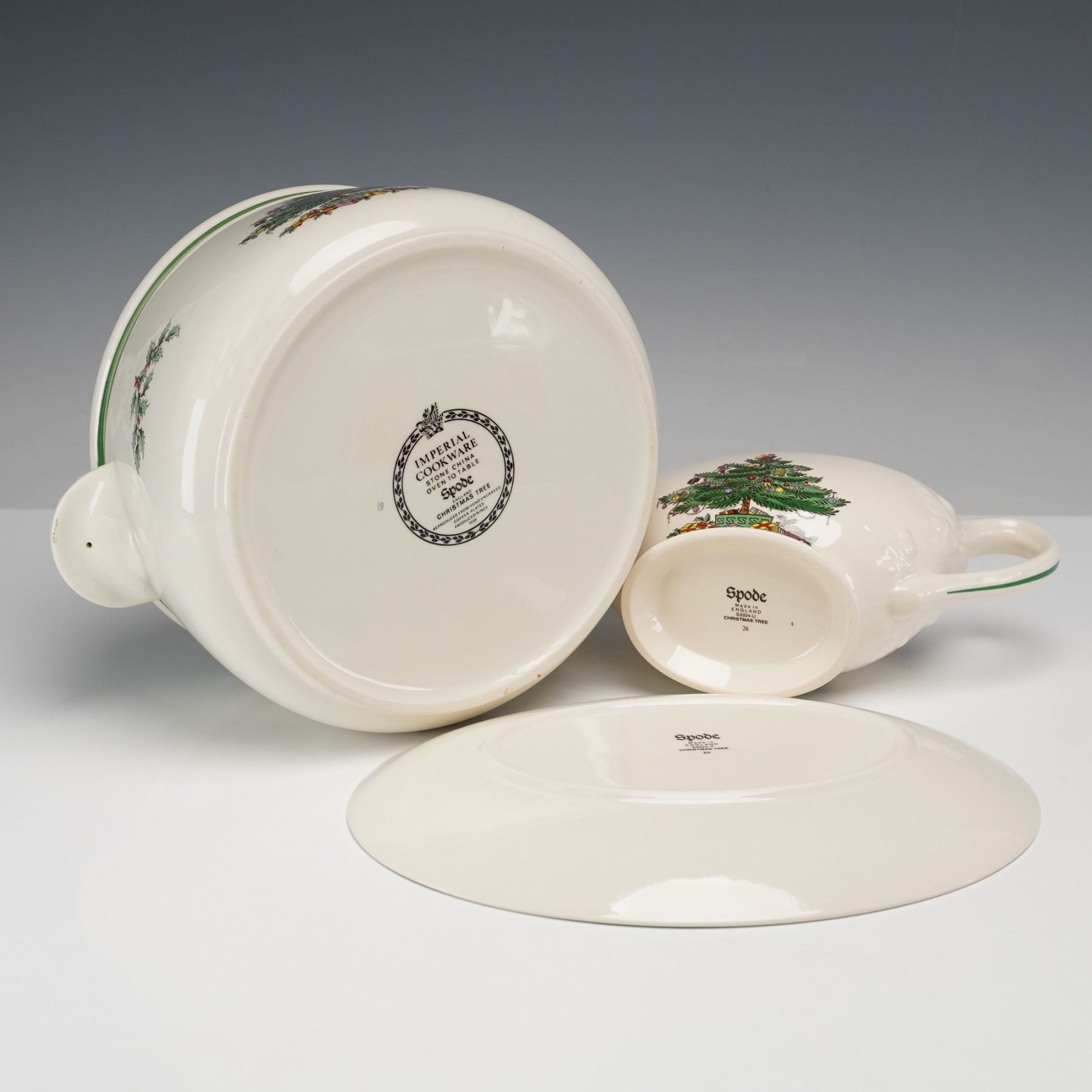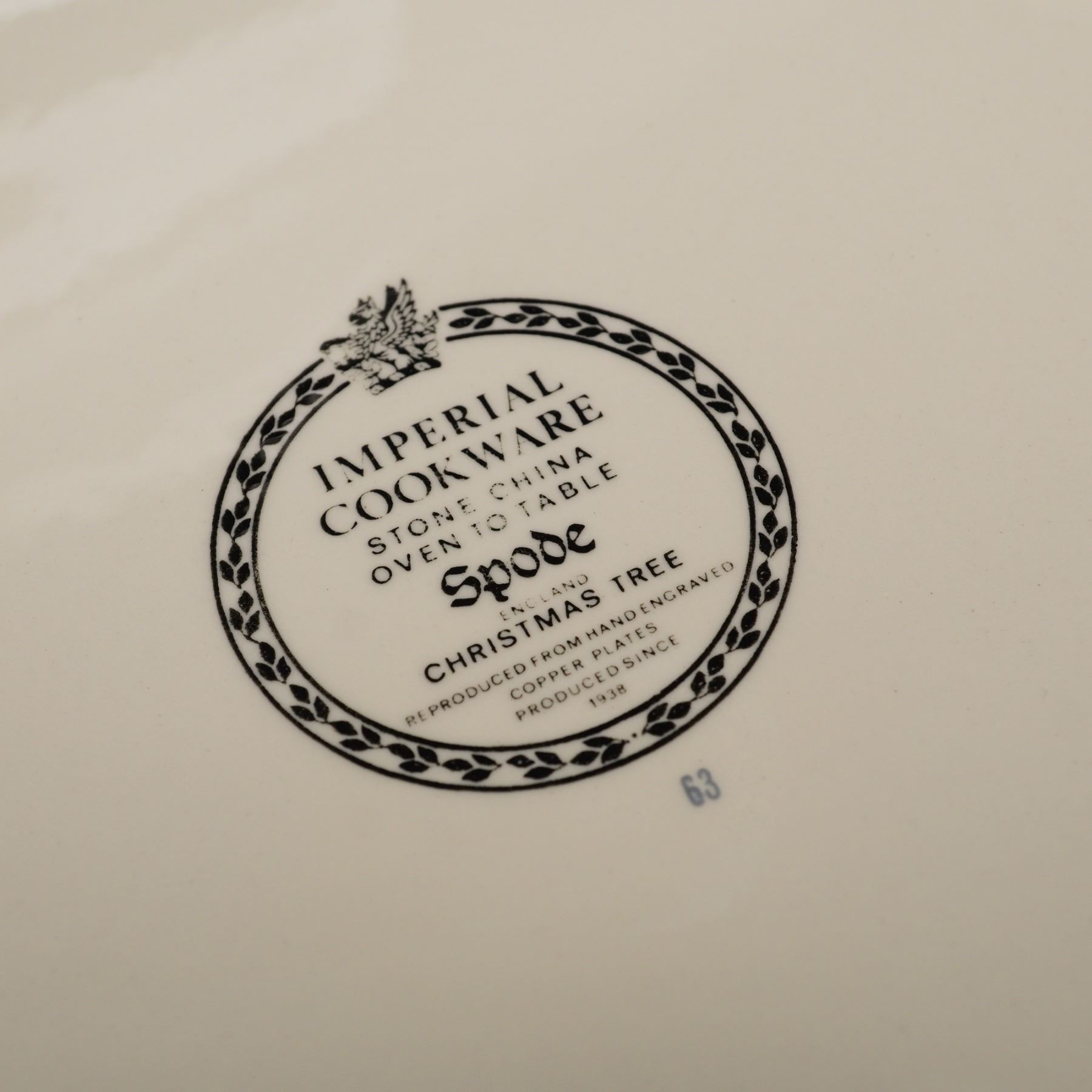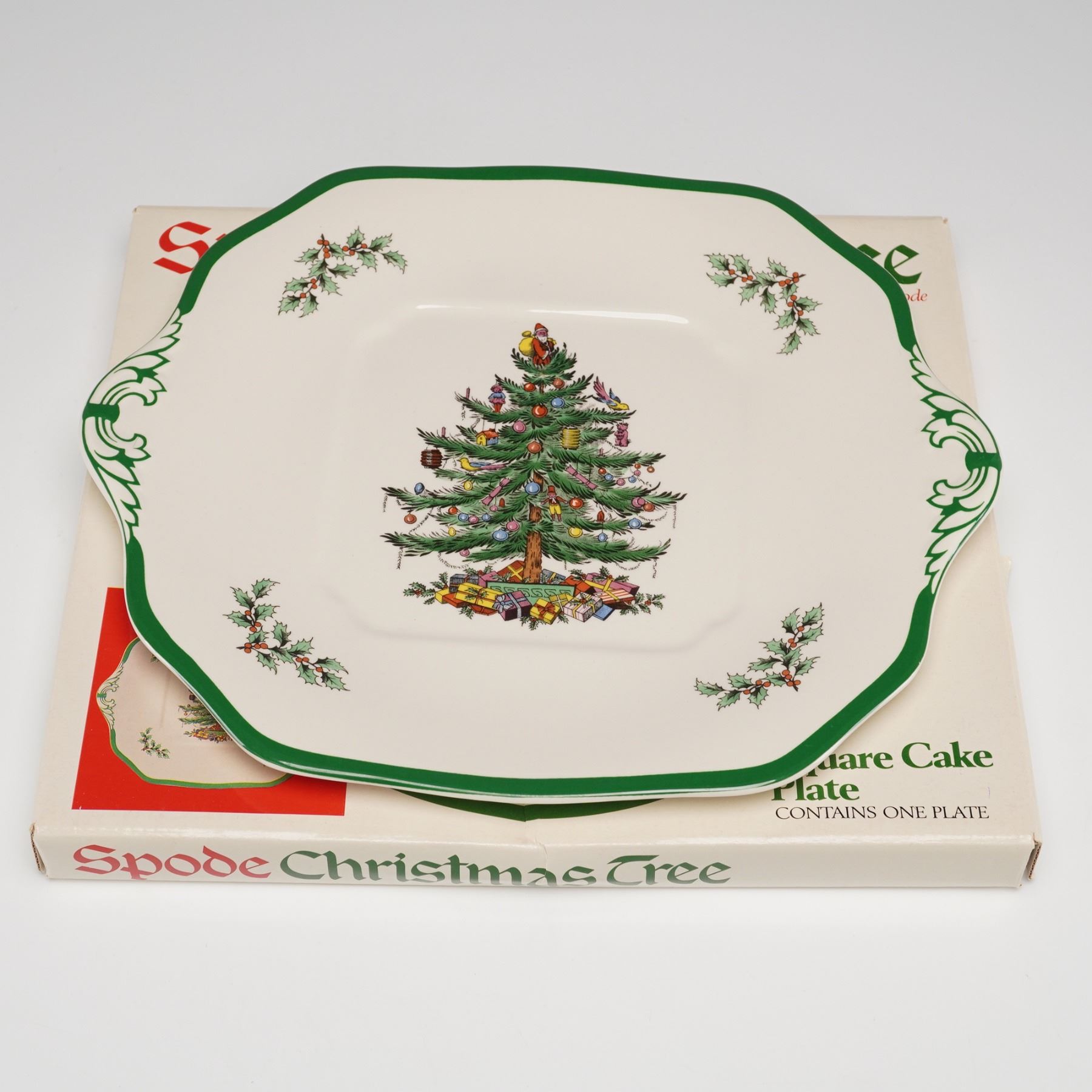 A festive eight-piece serving kitchenware collection, each decorated with a central Christmas tree design embellished with colorful ornaments, presents, and holly sprigs, bordered by a green rim. The set includes 1 factory boxed figural salt and pepper shaker set, 1 square cake plate, 1 covered casserole dish, 1 gravy boat with under tray, 1 large vegetable dish, 1 quiche dish, and 1 scalloped edge serving bowl. Spode backstamp. Some items have its original boxes.