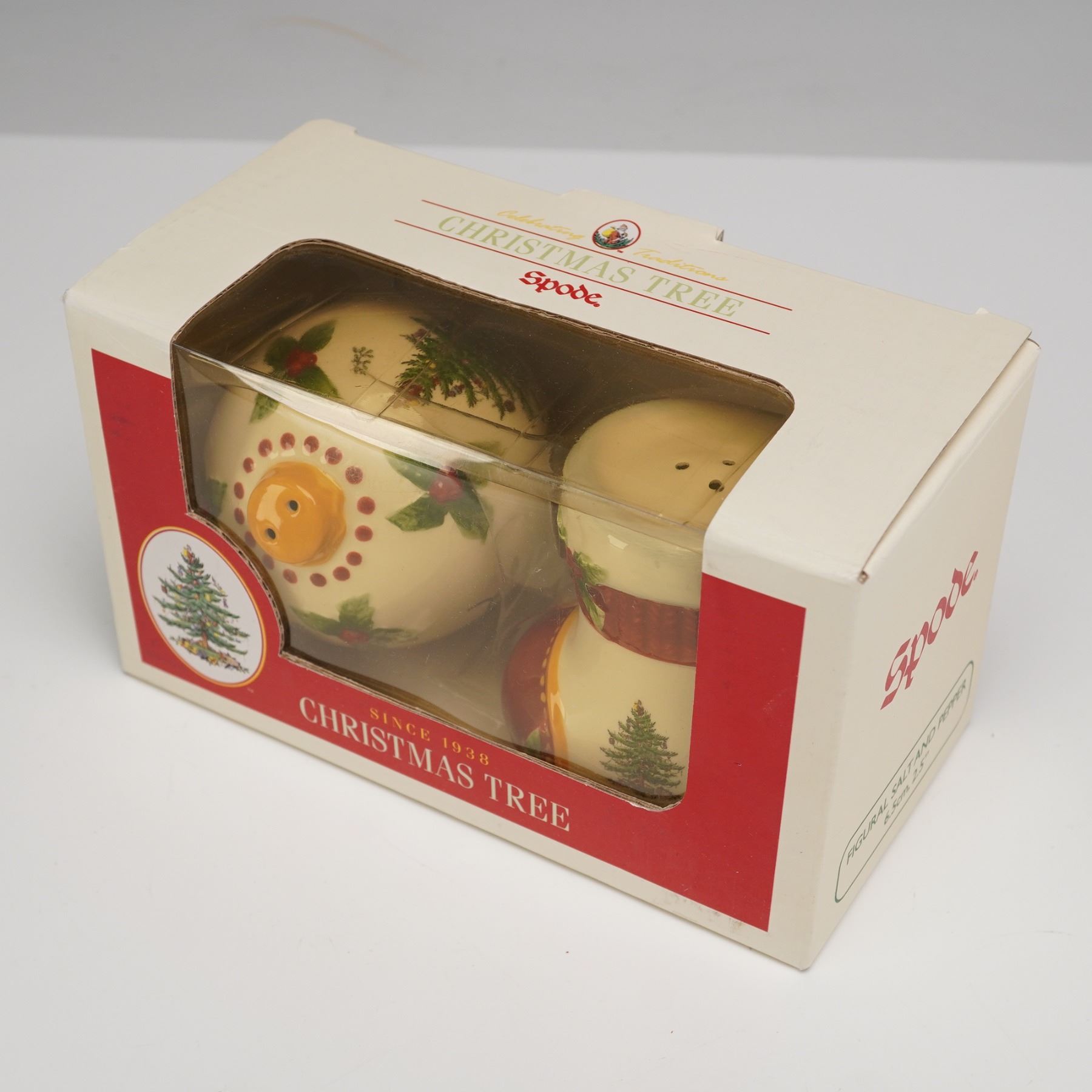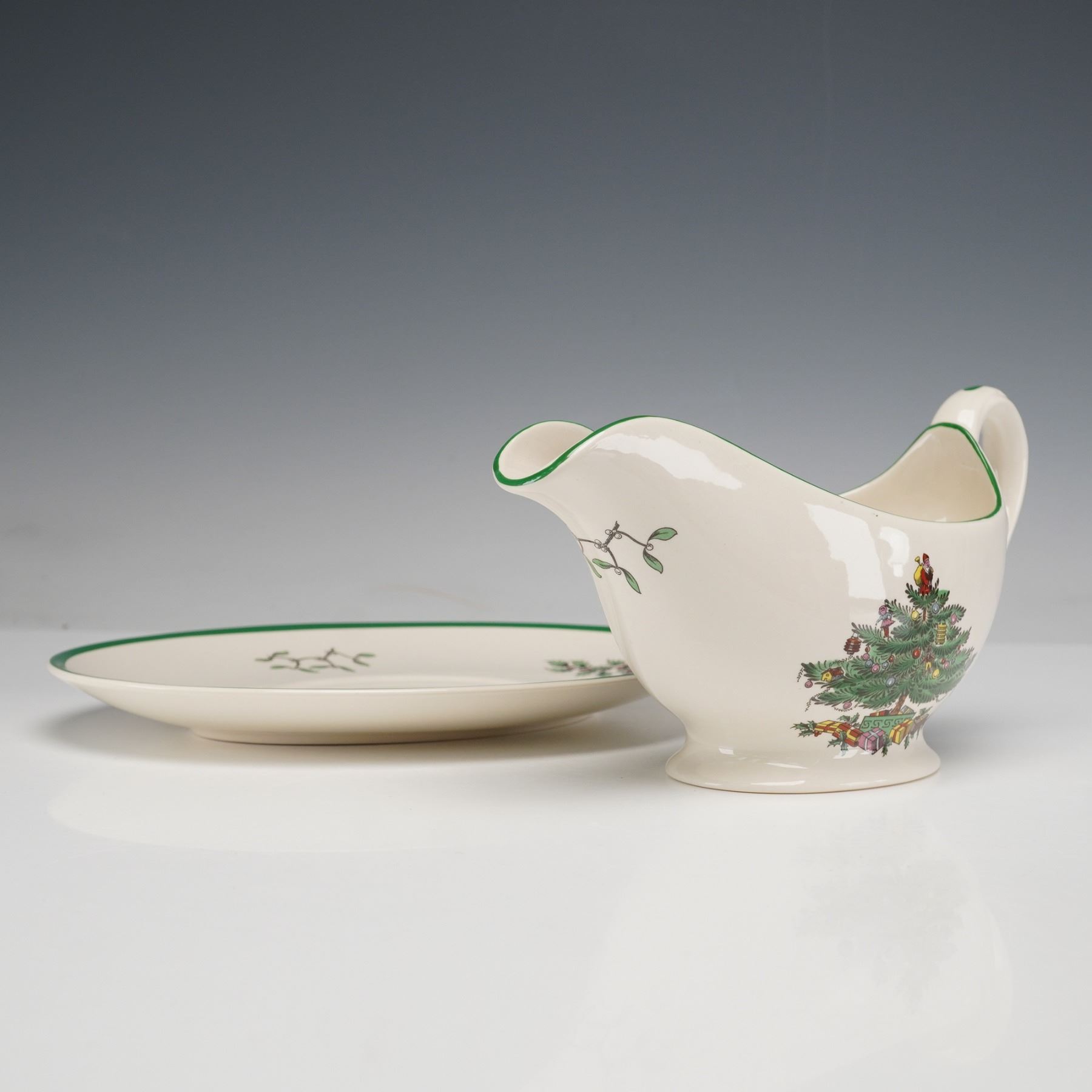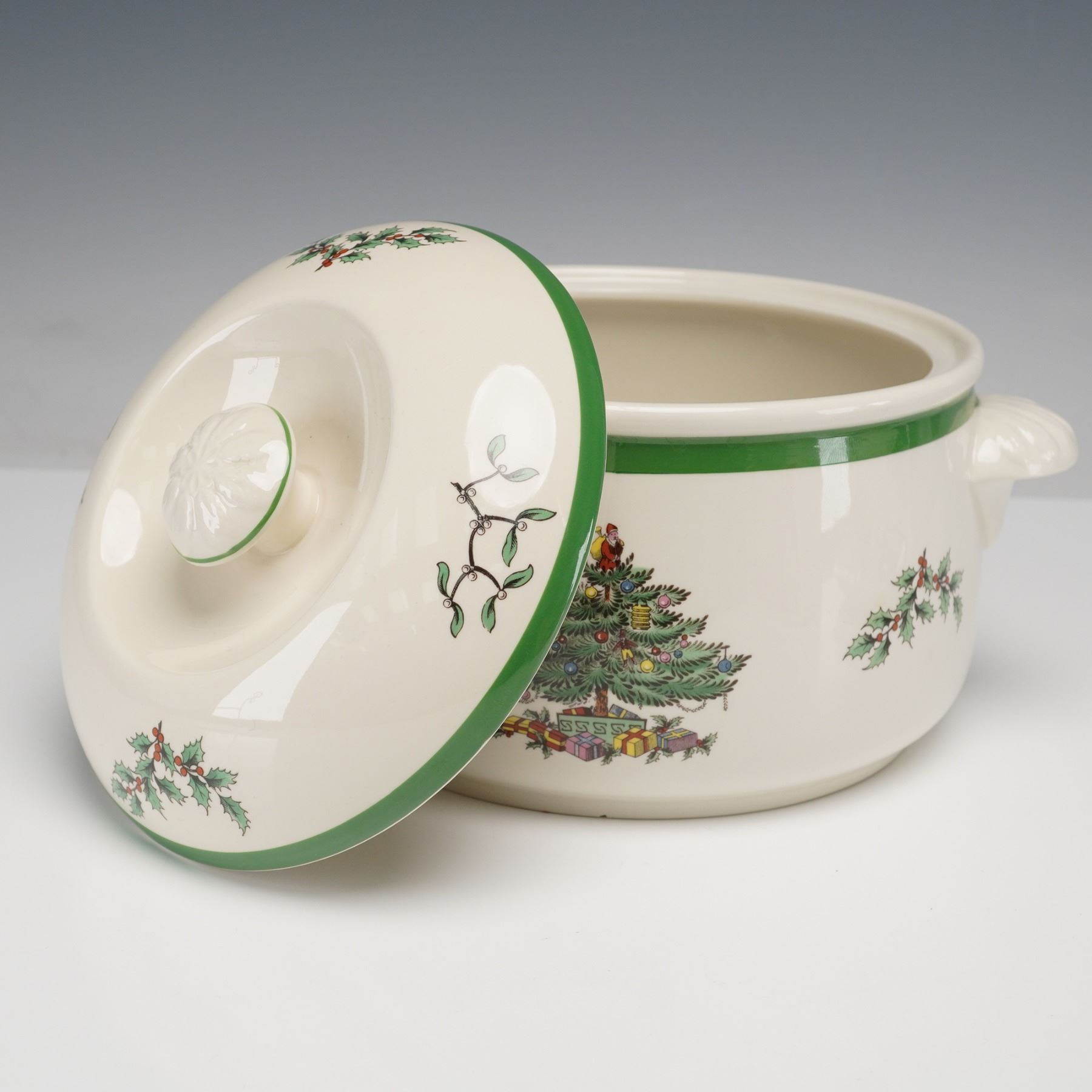 A festive eight-piece serving kitchenware collection, each decorated with a central Christmas tree design embellished with colorful ornaments, presents, and holly sprigs, bordered by a green rim. The set includes 1 factory boxed figural salt and pepper shaker set, 1 square cake plate, 1 covered casserole dish, 1 gravy boat with under tray, 1 large vegetable dish, 1 quiche dish, and 1 scalloped edge serving bowl. Spode backstamp. Some items have its original boxes.